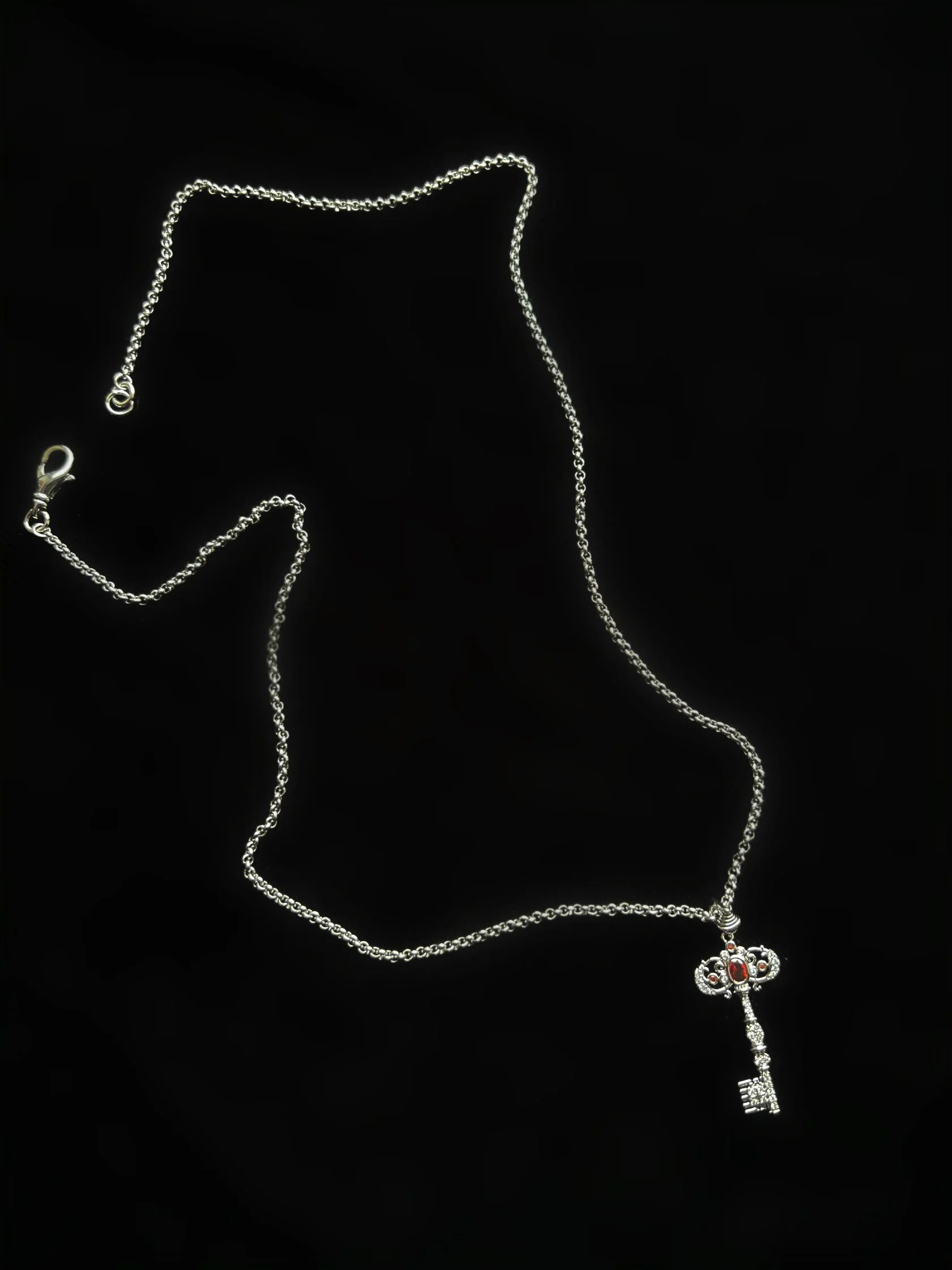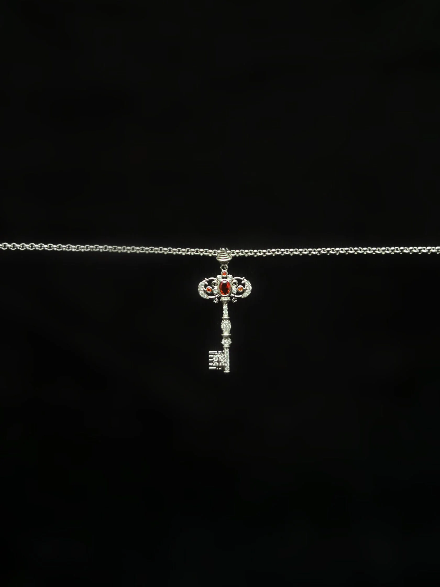 Миниатюрная подвеска из цепи ролло украшена подвеской в виде декоративного ключа с цветными кристаллами