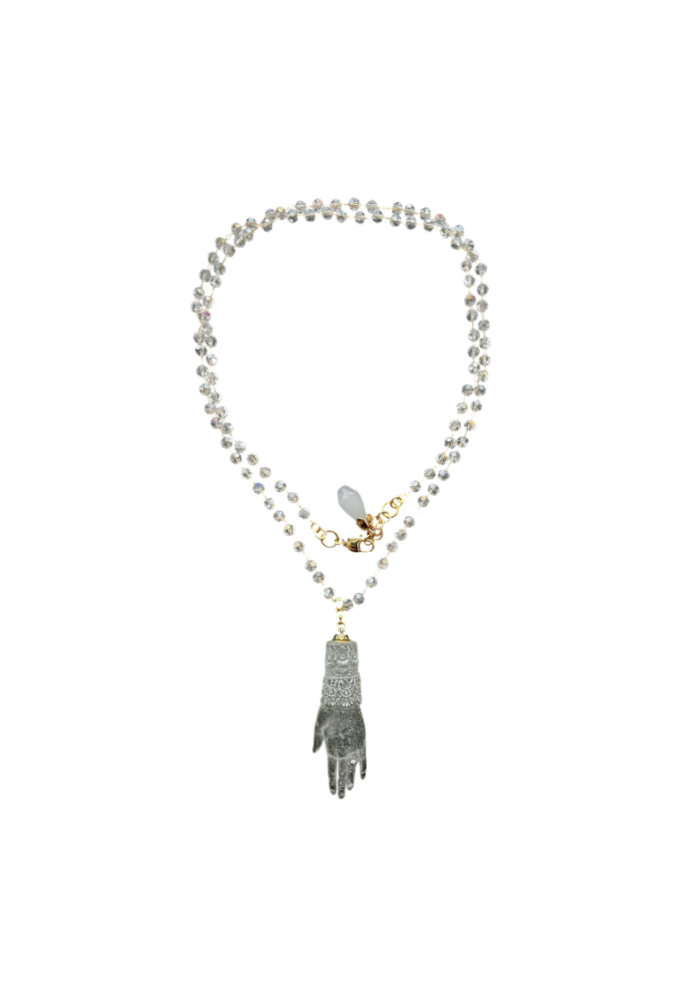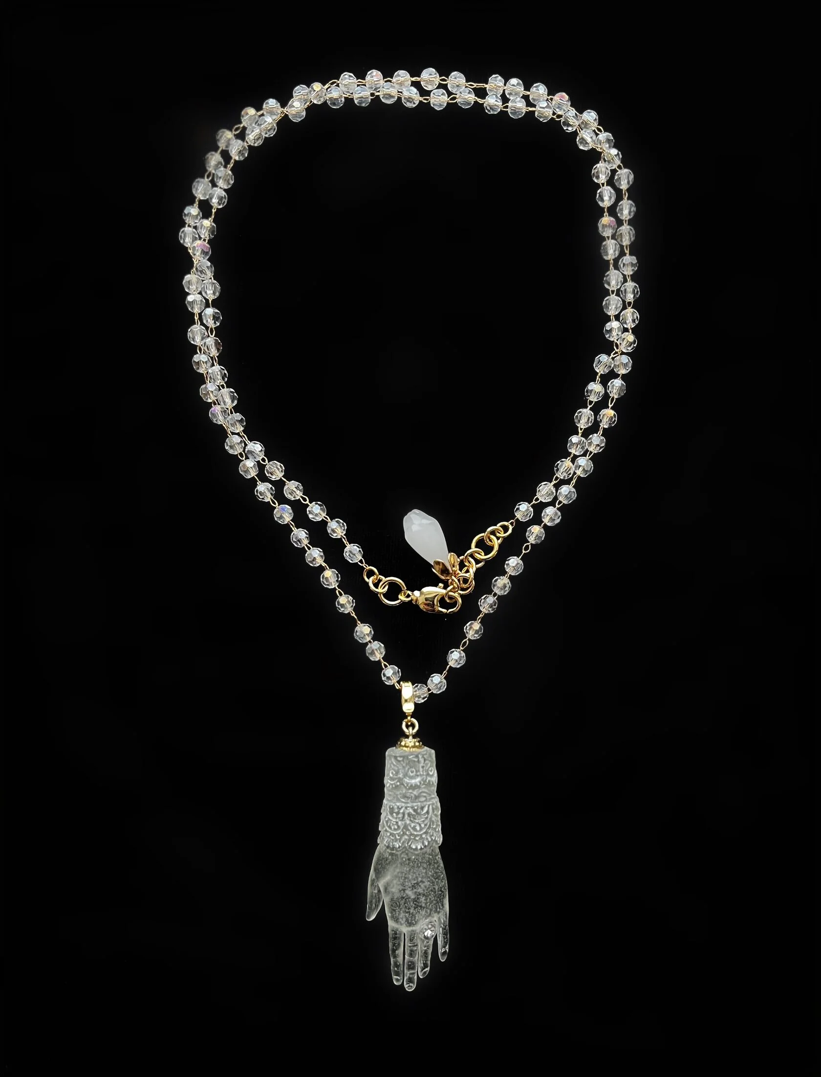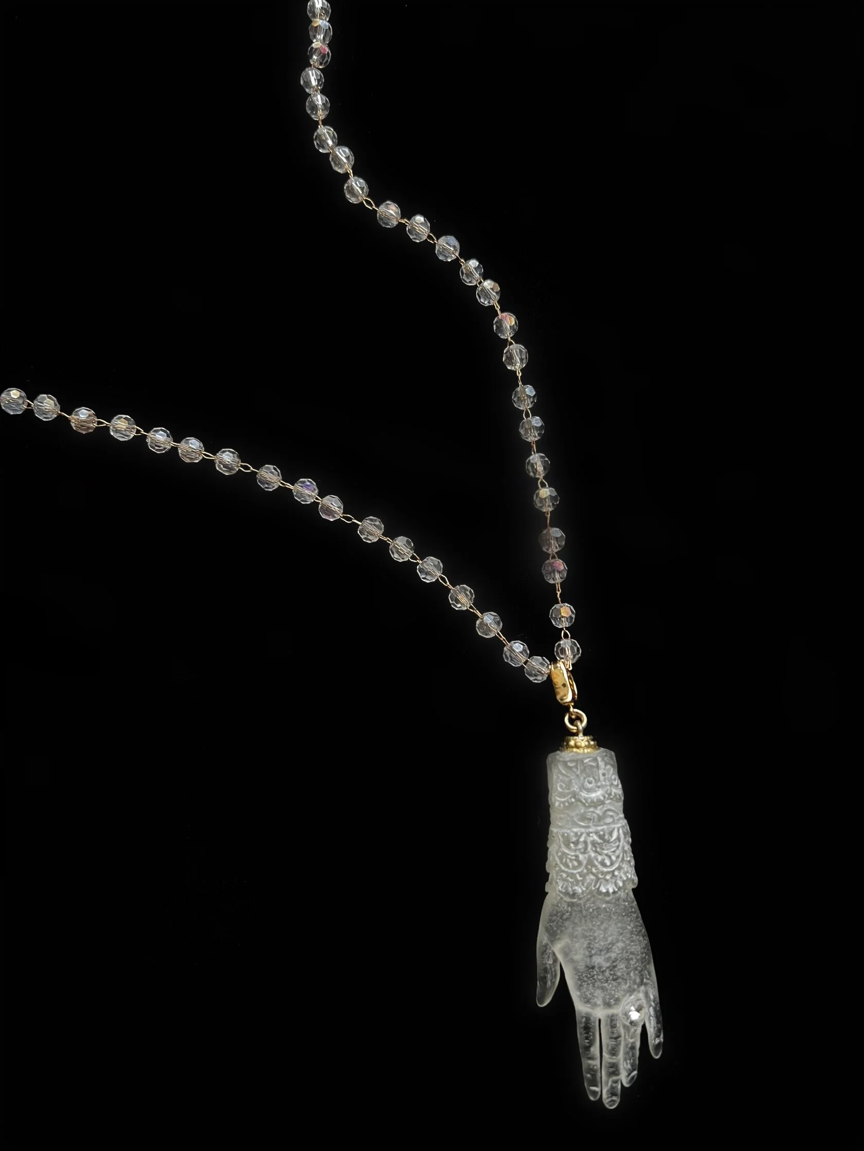 Подвеска собрана из цепи с граненым стеклом и дополнена съемной подвеской в виде руки в викторианском стиле из ювелирной смолы. Имеется регулируемая застежка