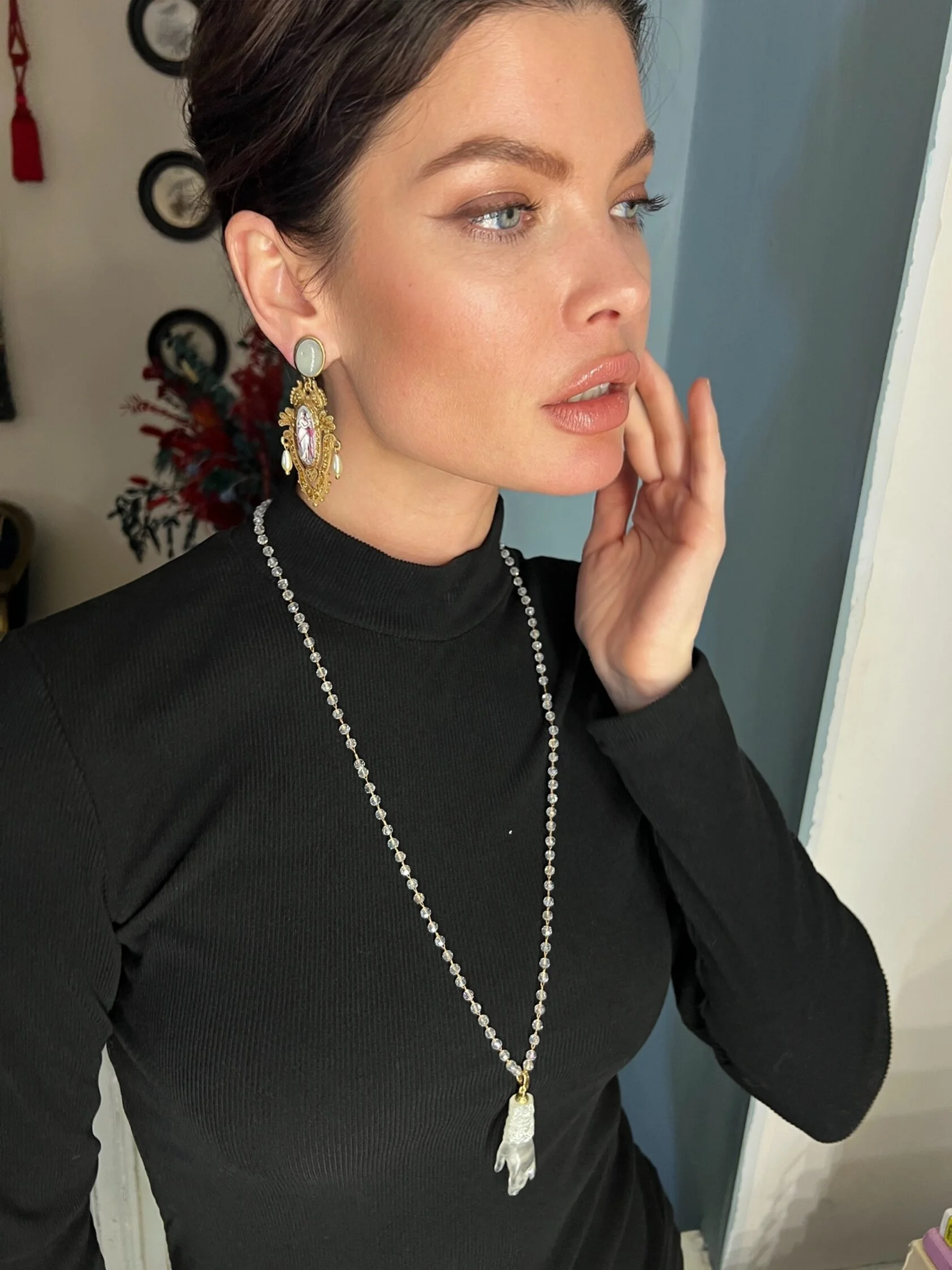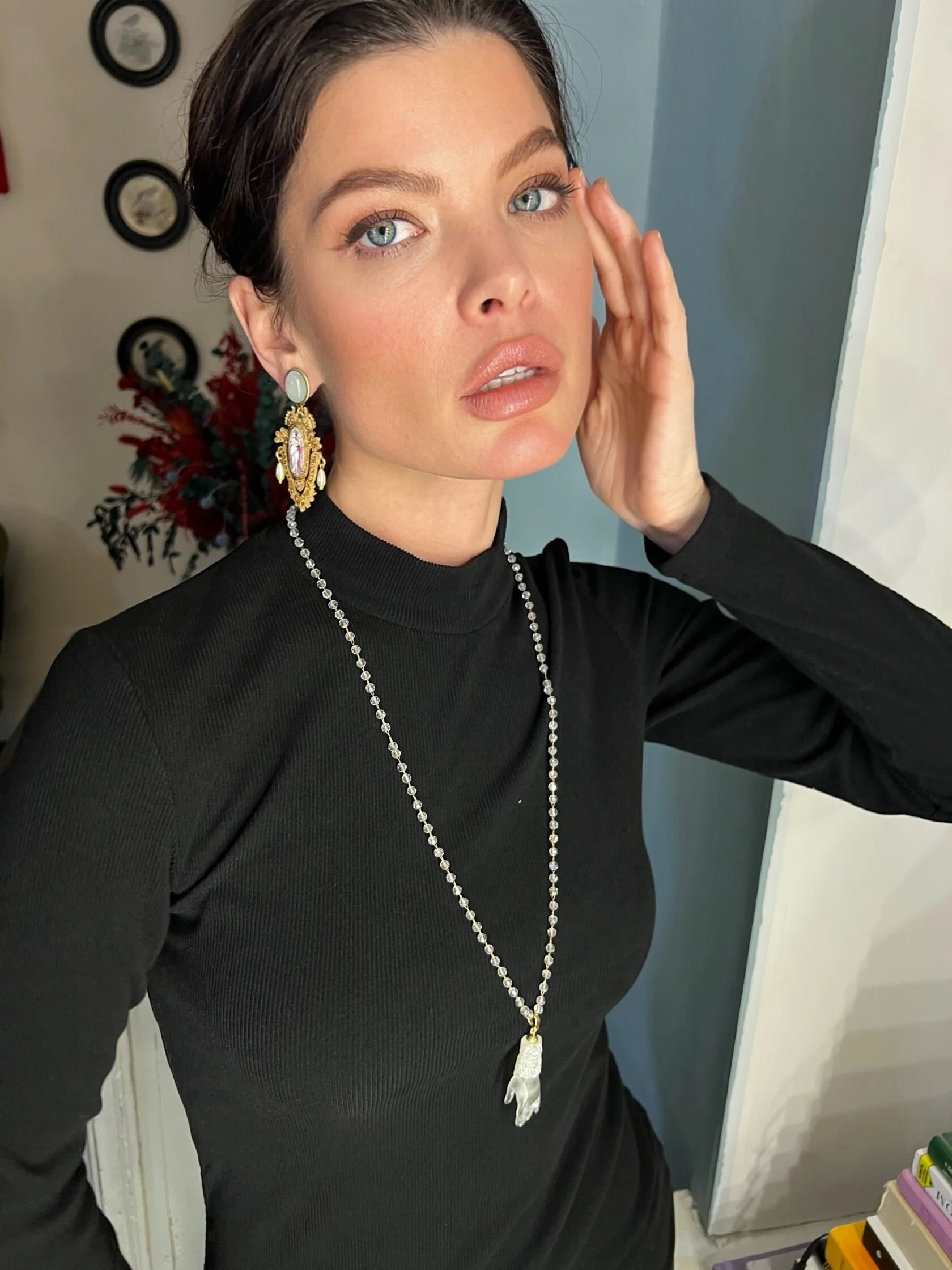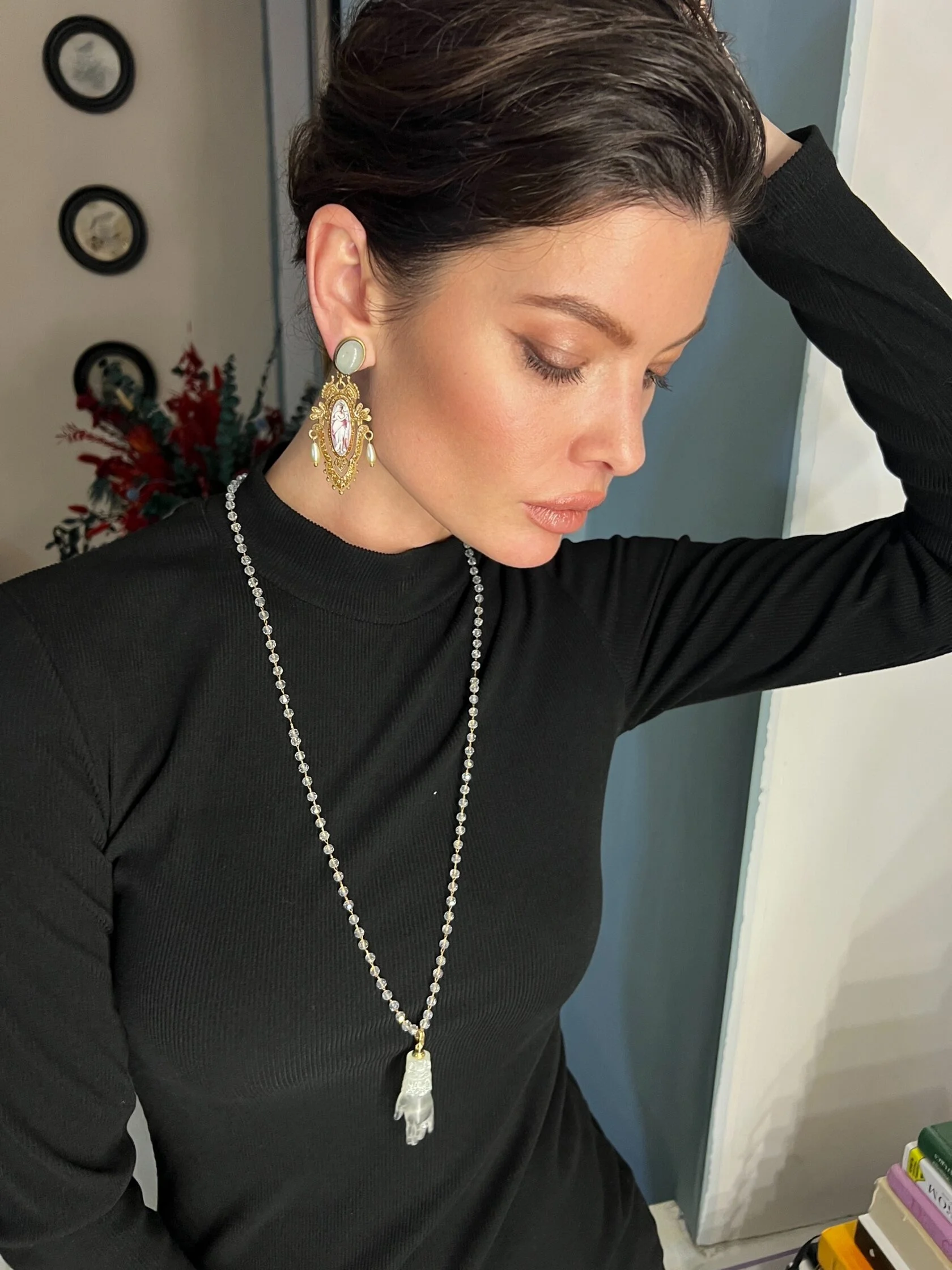 Подвеска собрана из цепи с граненым стеклом и дополнена съемной подвеской в виде руки в викторианском стиле из ювелирной смолы. Имеется регулируемая застежка
