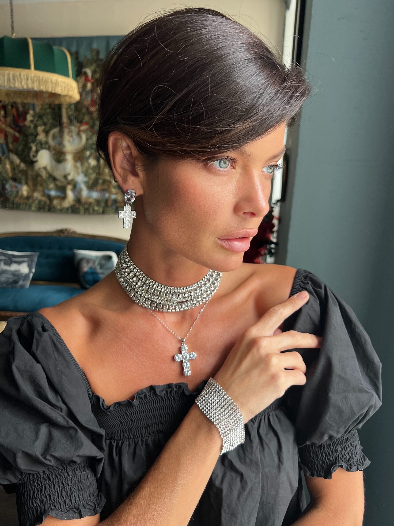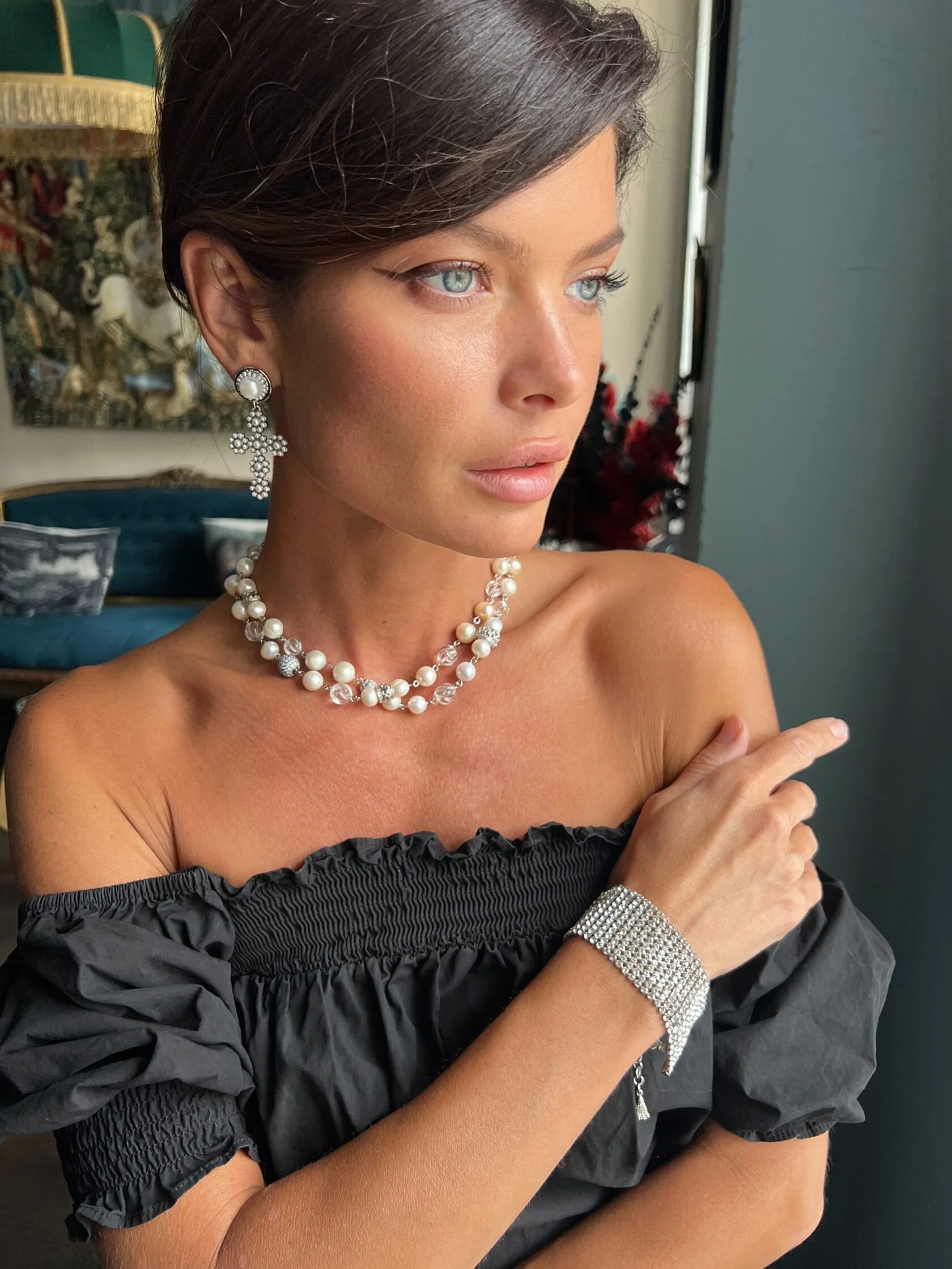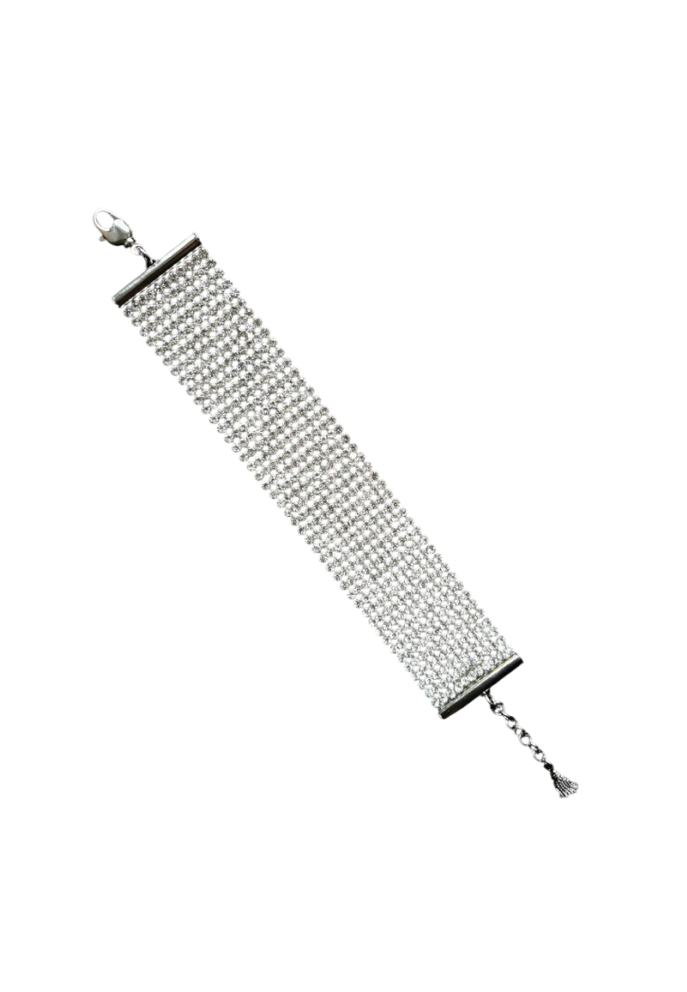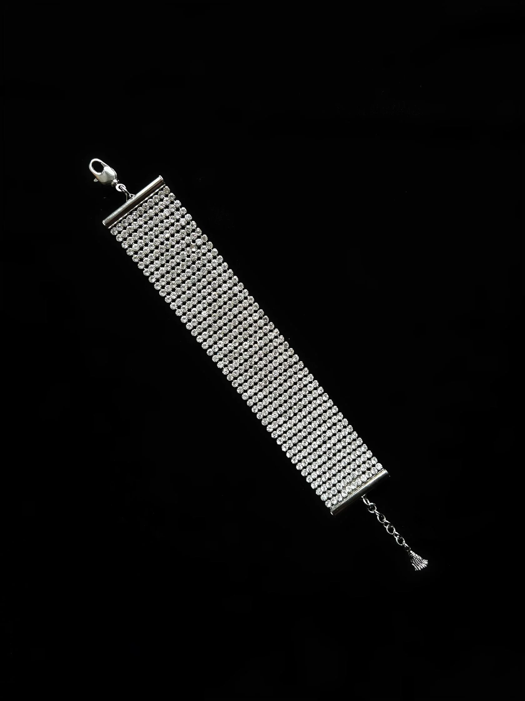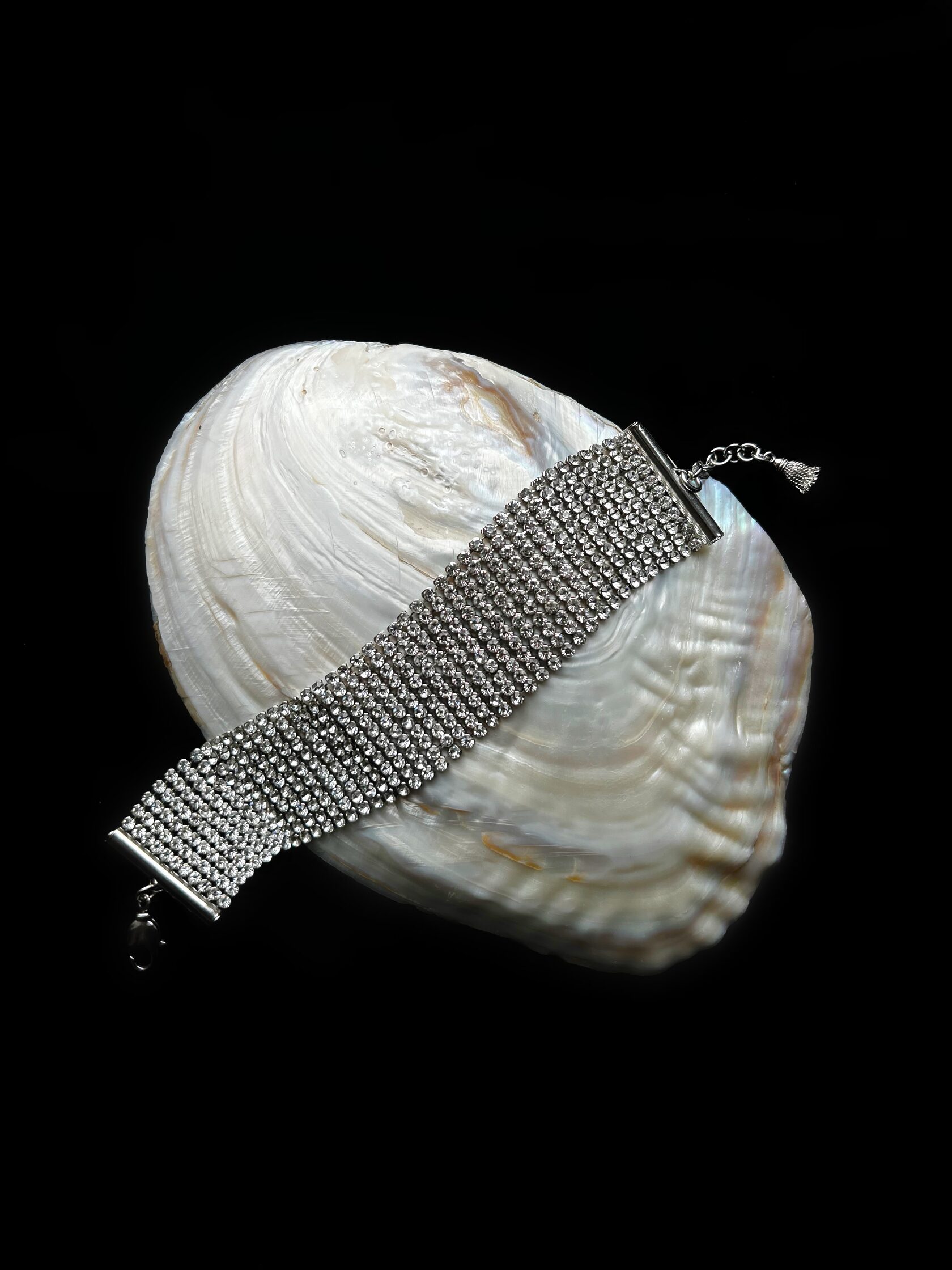 Изящный браслет инкрустирован множеством страз декоративного стекла. Имеется регулируемая застежка
