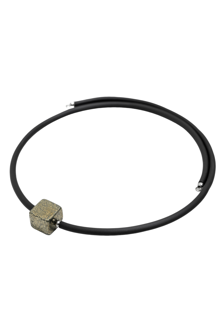 Колье чокер с натуральным камнем пирит. Украшение выполнено вручную из черного каучука и камня. Айтем в едином размере, без замков и застежек, поэтому комфортно садится на любой обхват шеи, а также удобен для девушек с длинным ногтями.