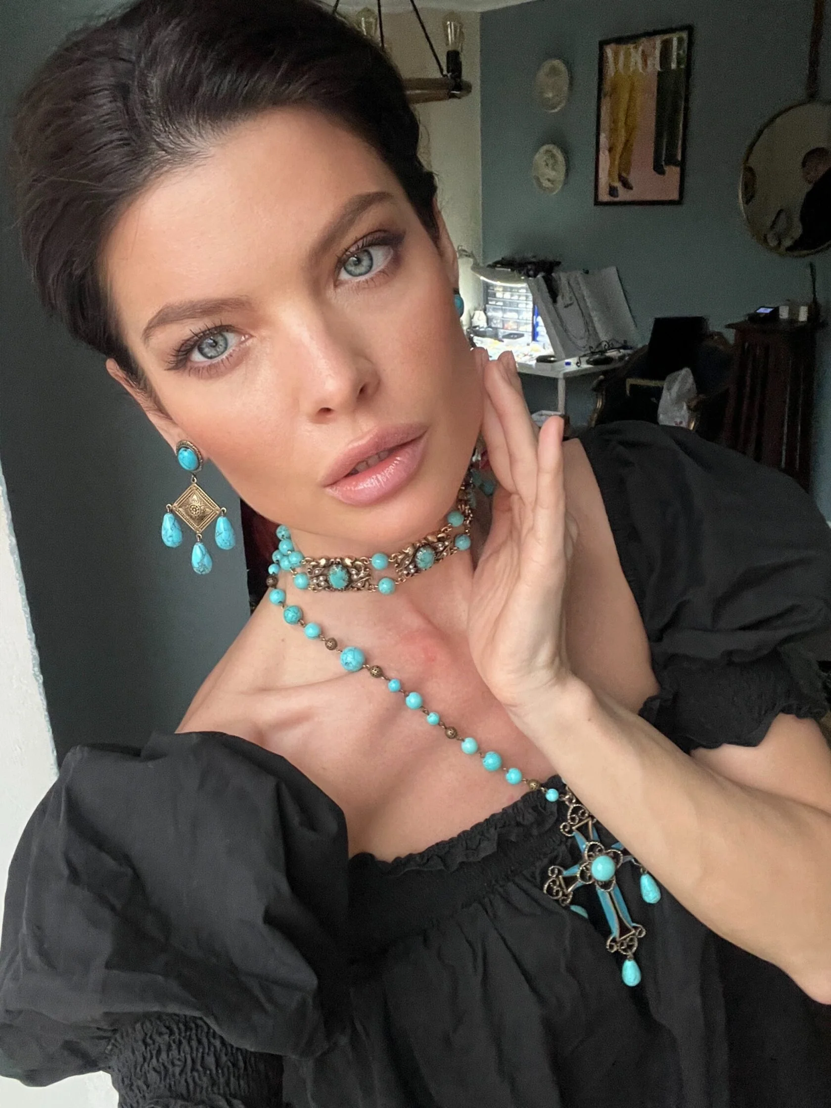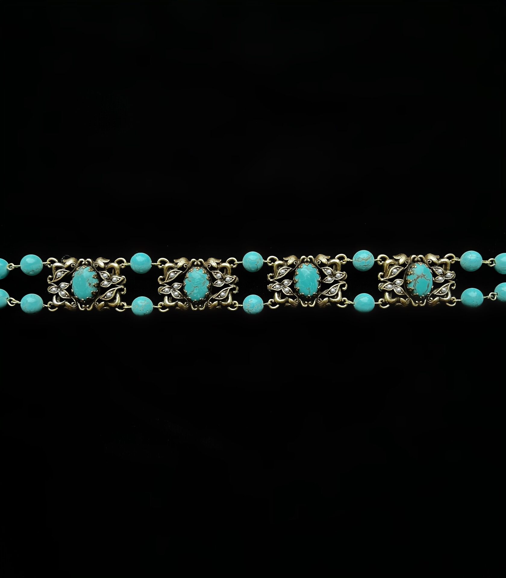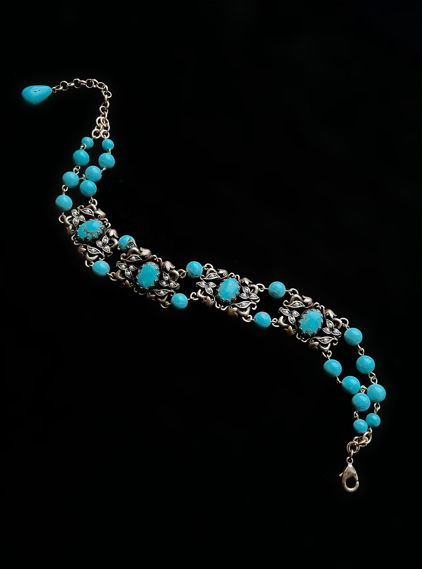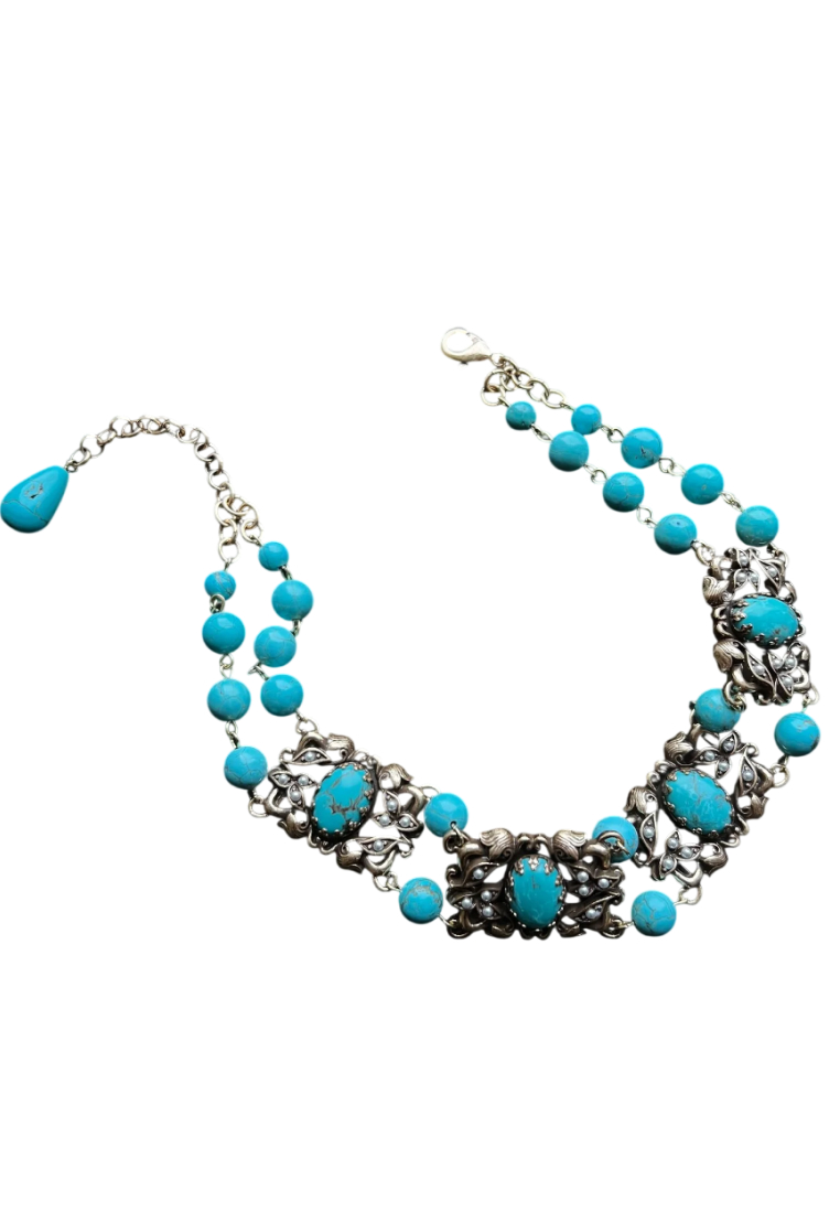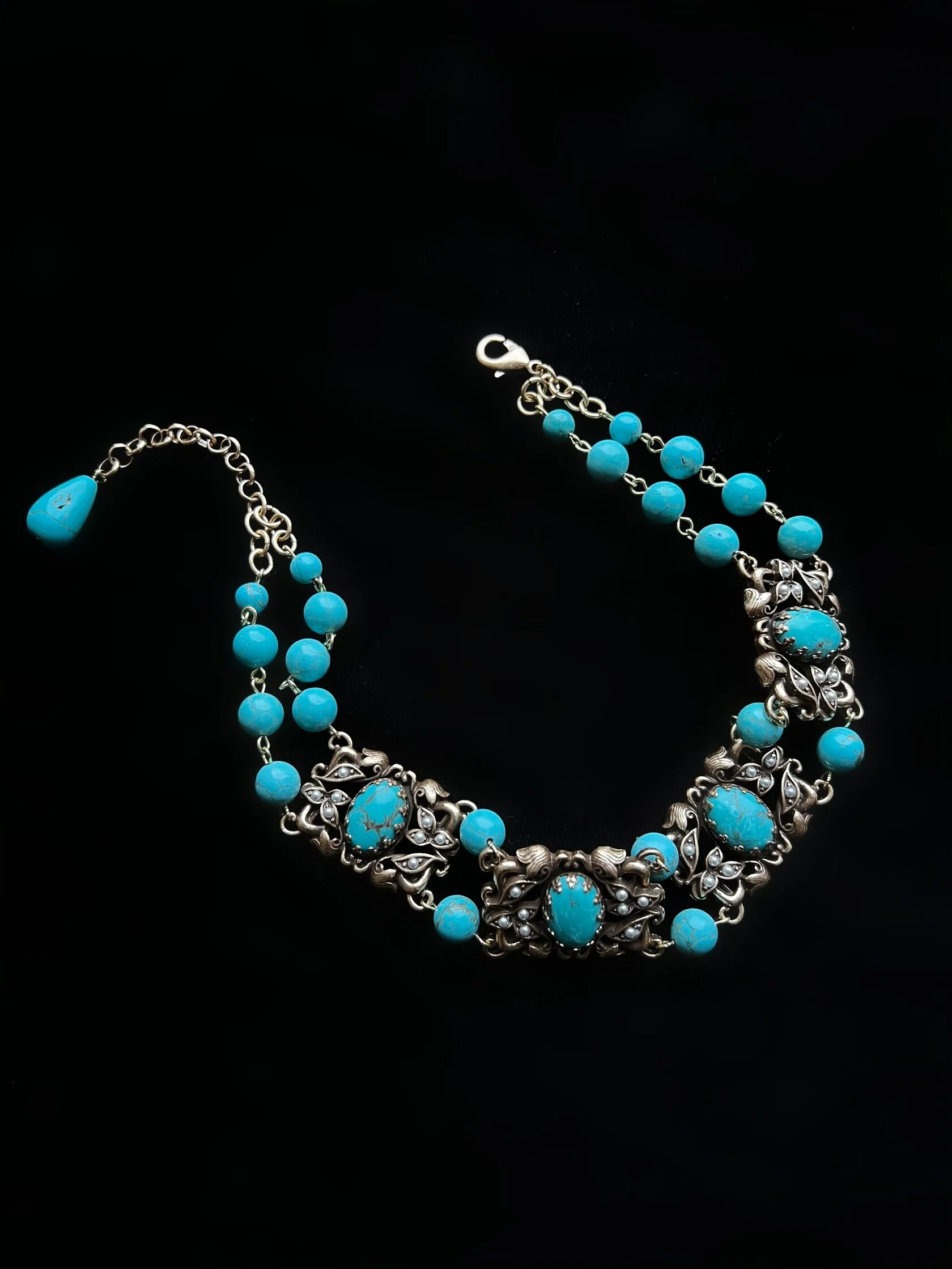 Барочное колье-чокер украшено кабошонами и бусинами турквенита. Имеется регулируемая застежка