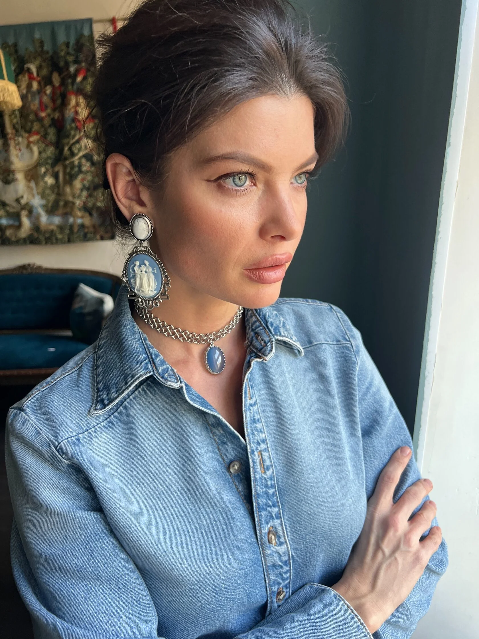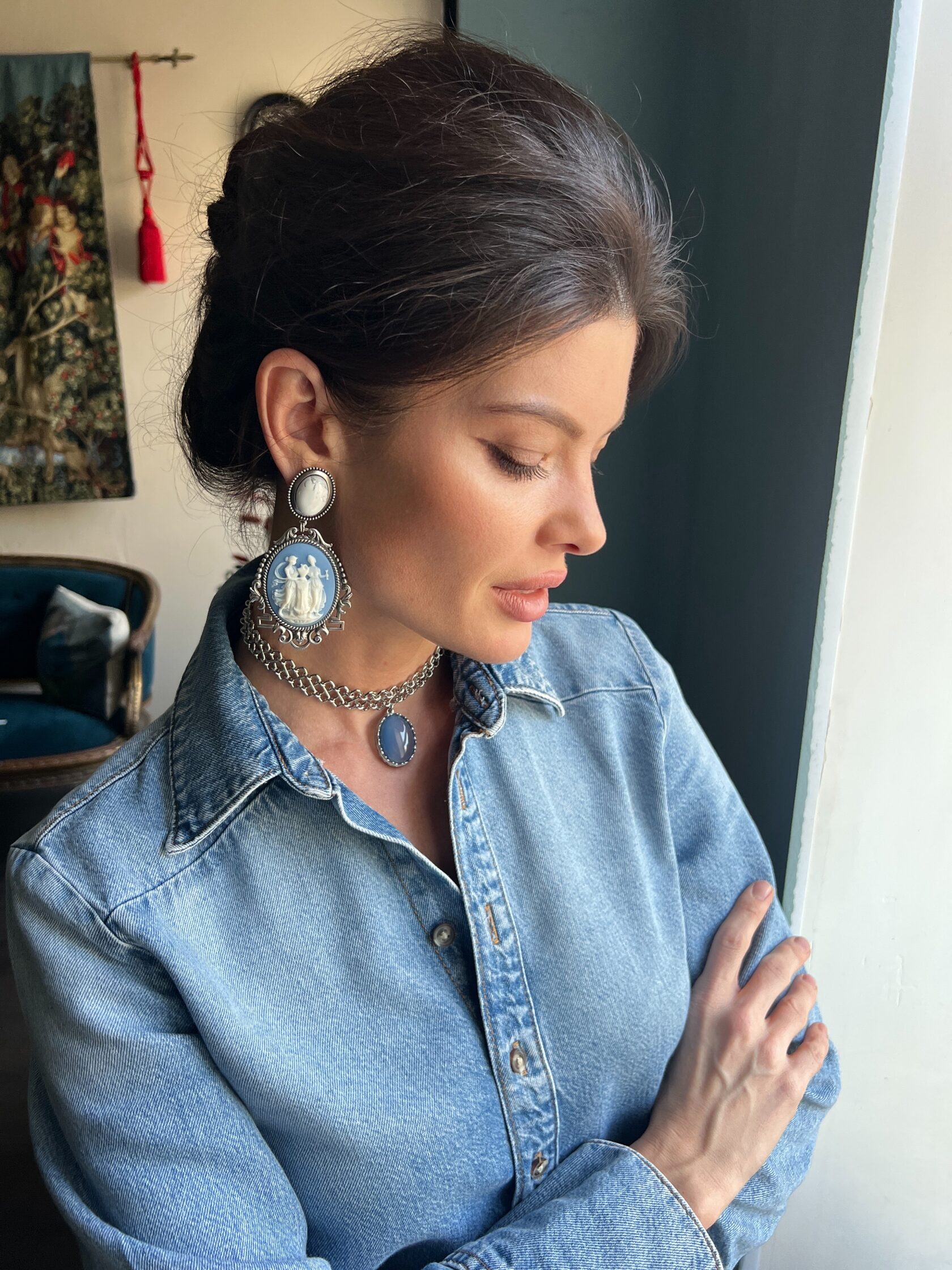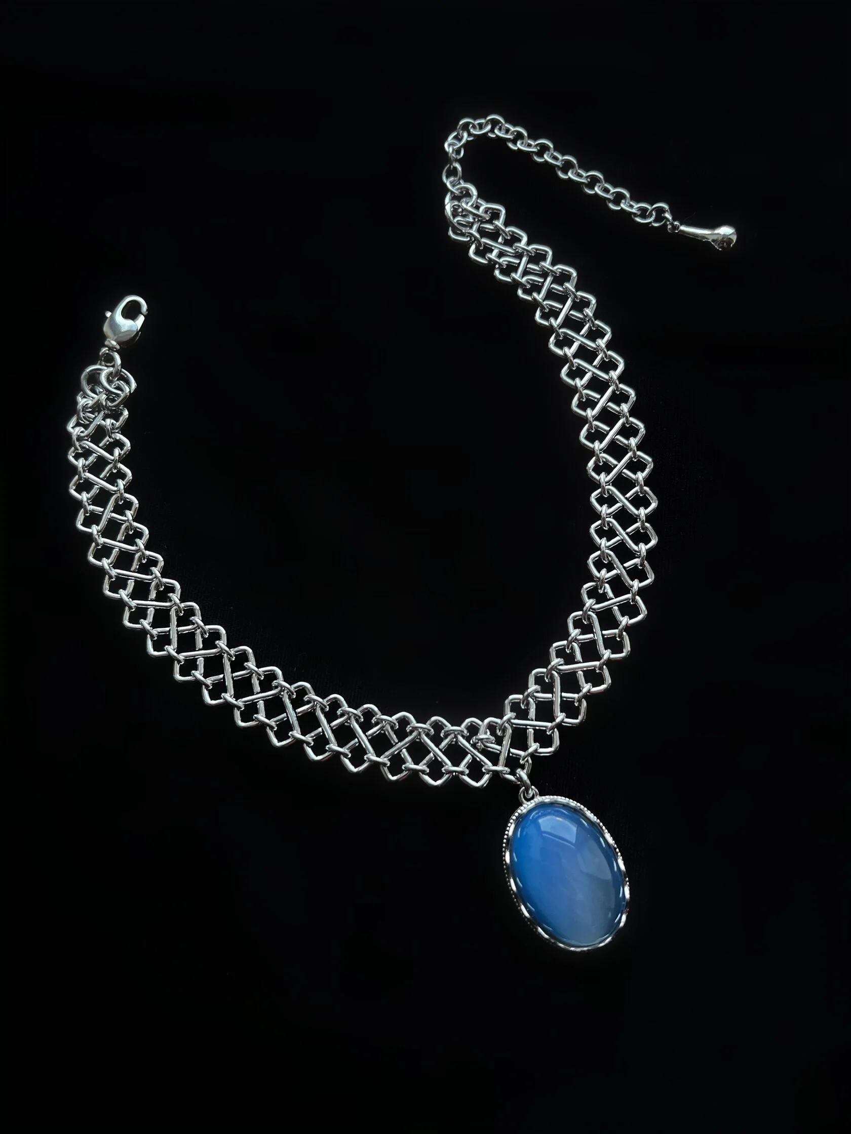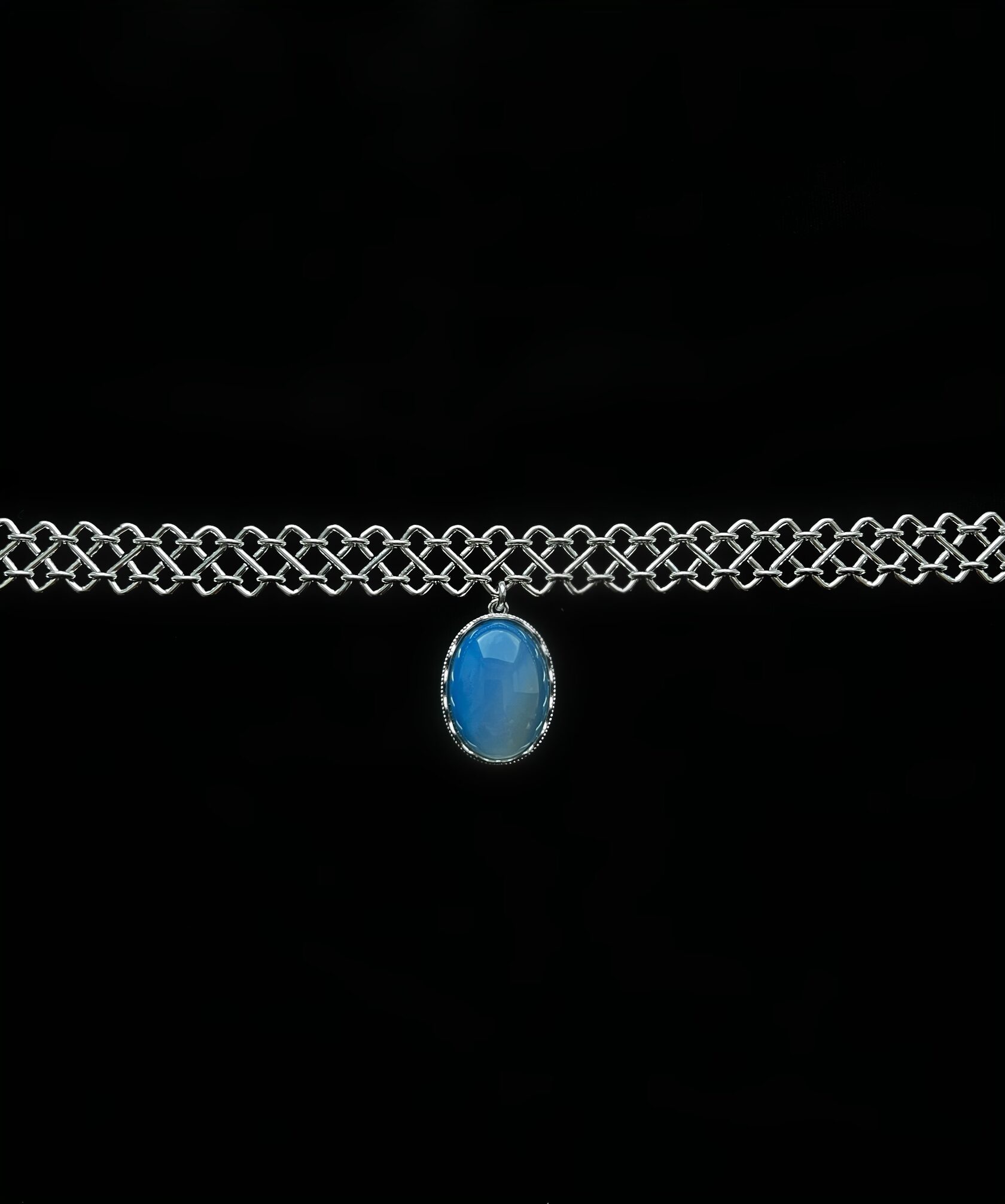 Колье-чокер из цепи фантазийного плетения украшено подвеской природного голубого агата . Имеется регулируемая застежка