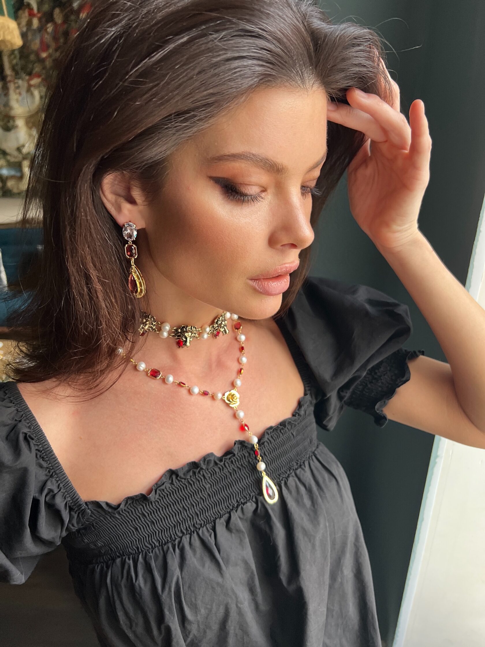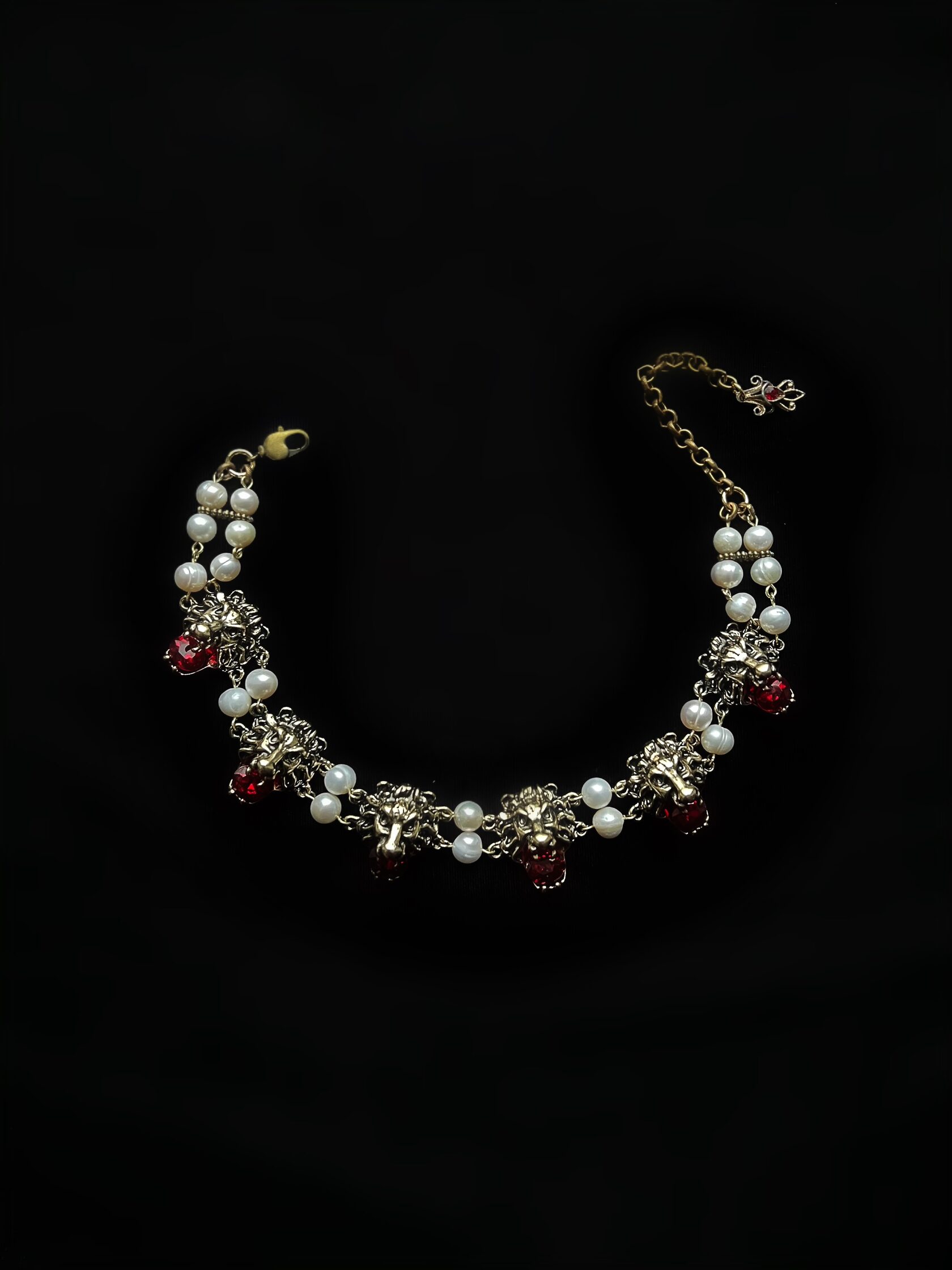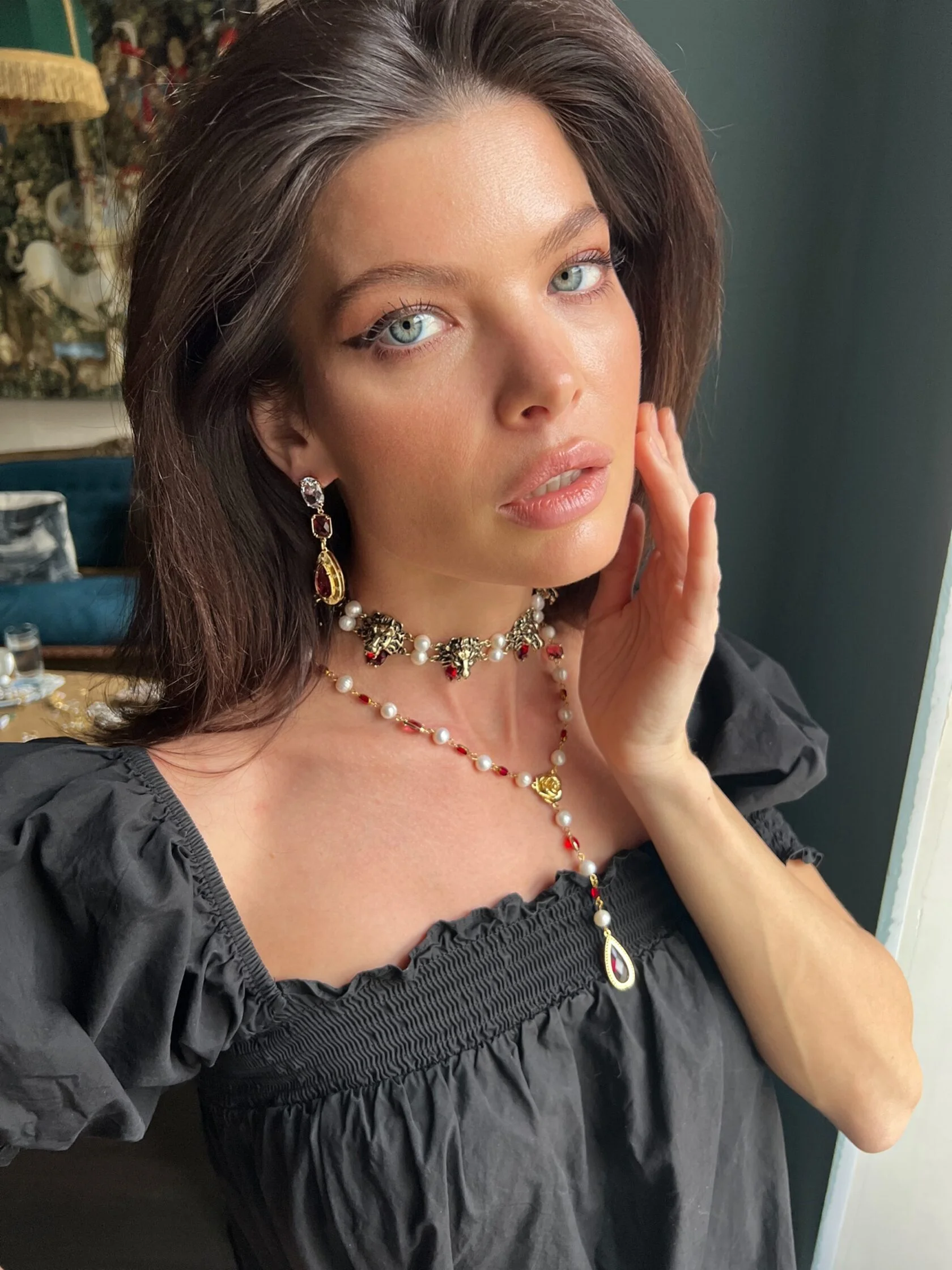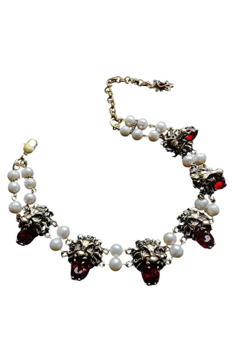 Барочное колье-чокер украшено декоративными вставками в виде львиных голов. Само колье декорировано натуральным жемчугом и цветными кристаллами. Имеется регулируемая застежка