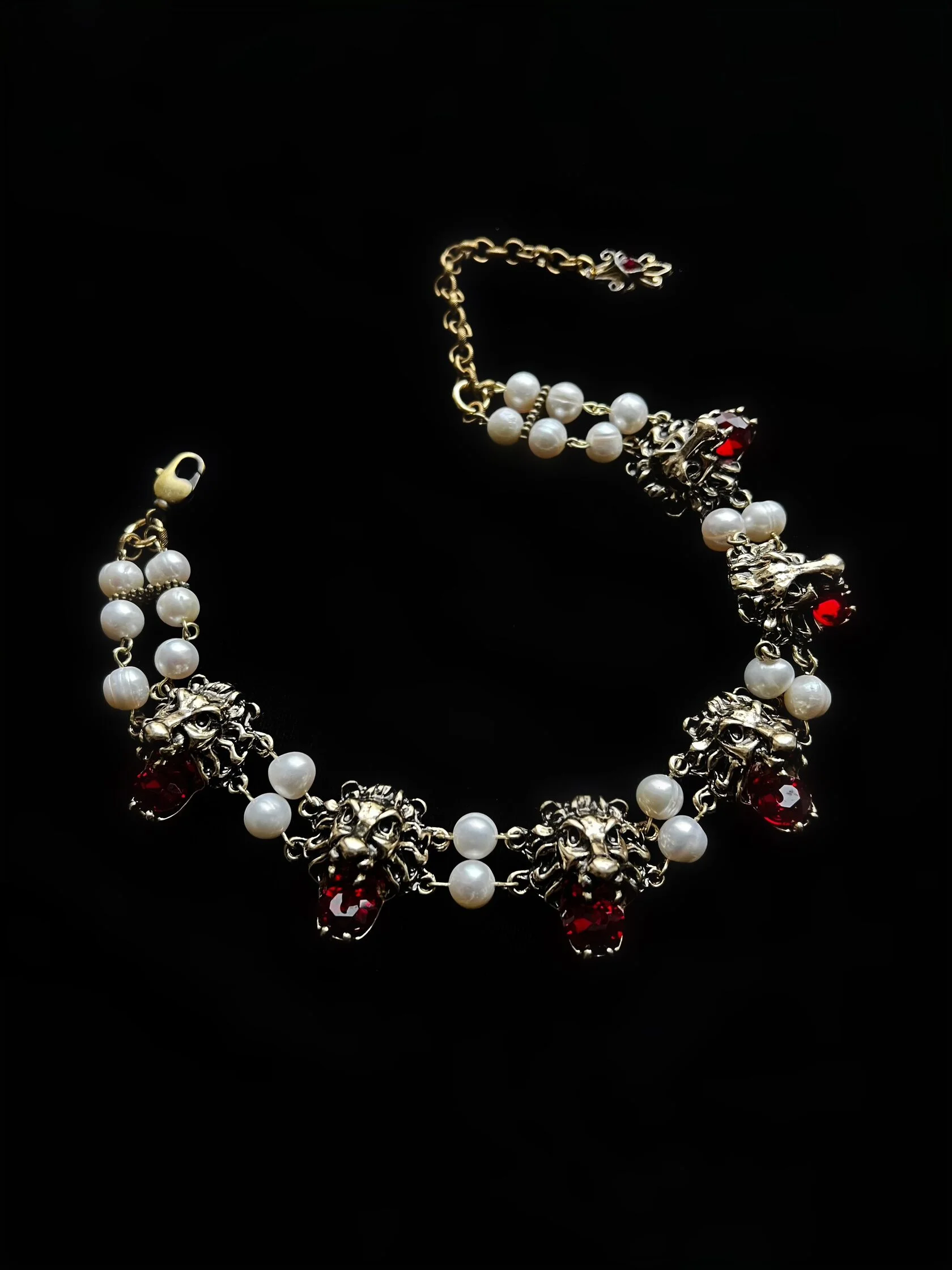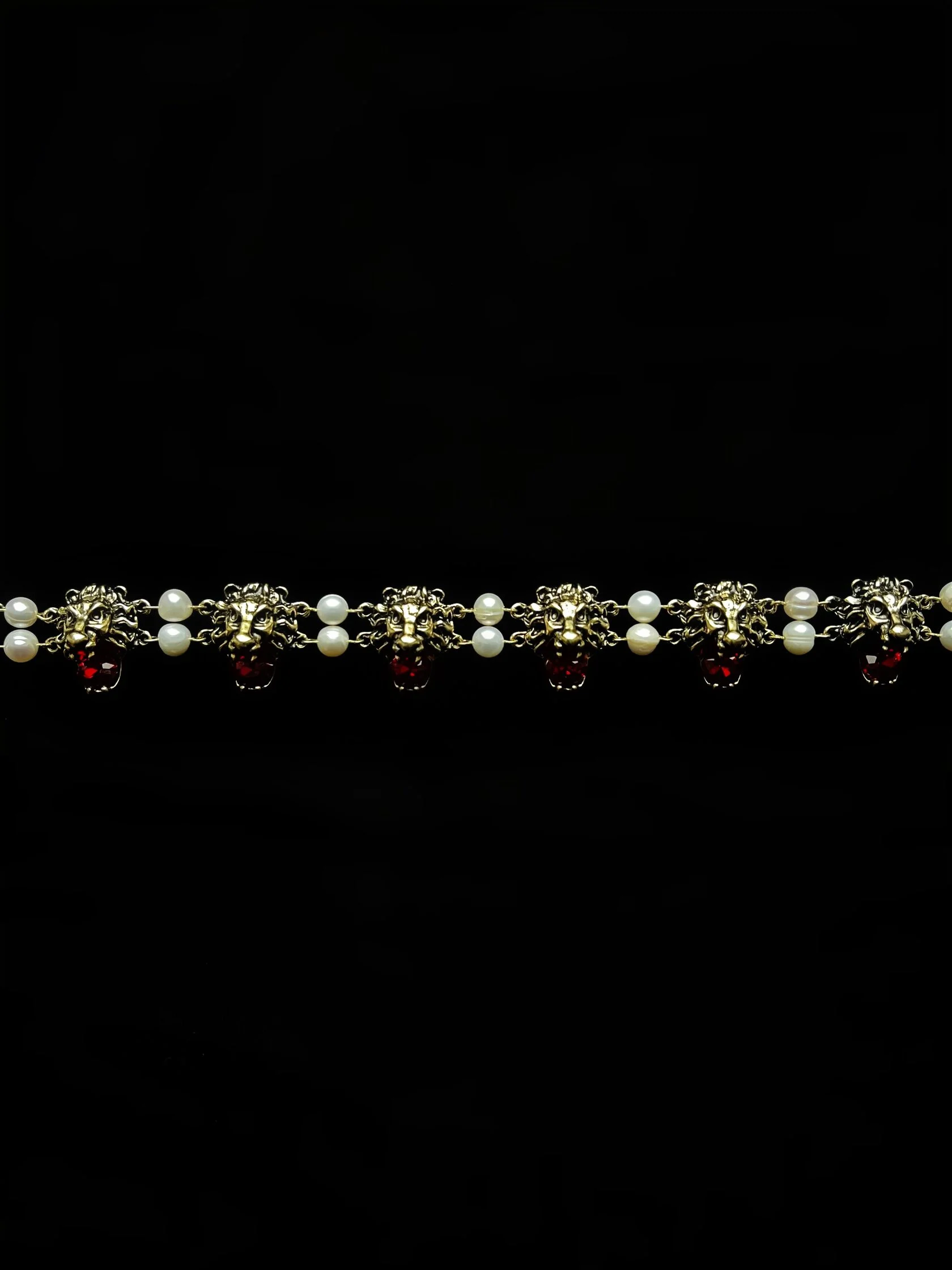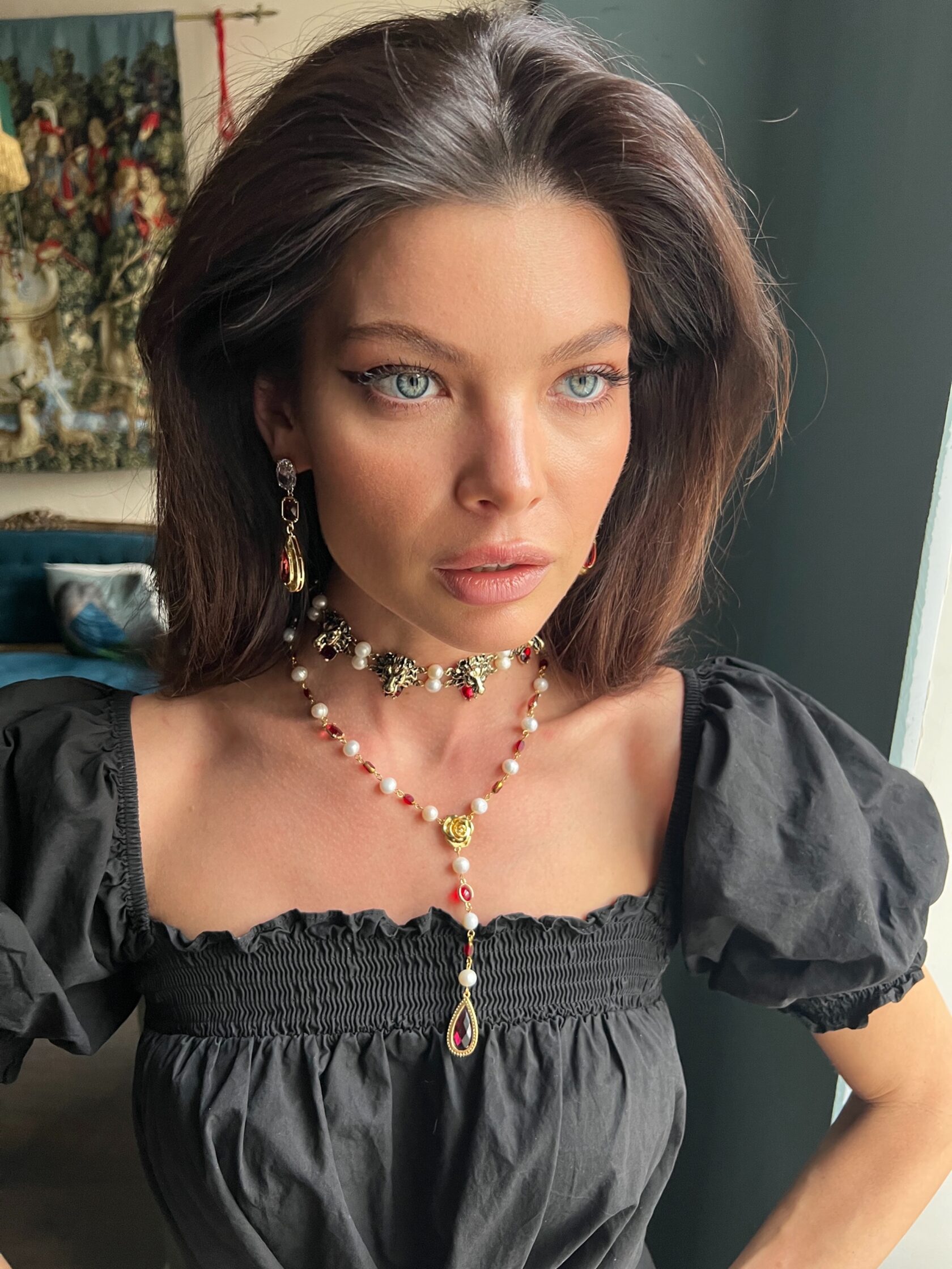 Барочное колье-чокер украшено декоративными вставками в виде львиных голов. Само колье декорировано натуральным жемчугом и цветными кристаллами. Имеется регулируемая застежка