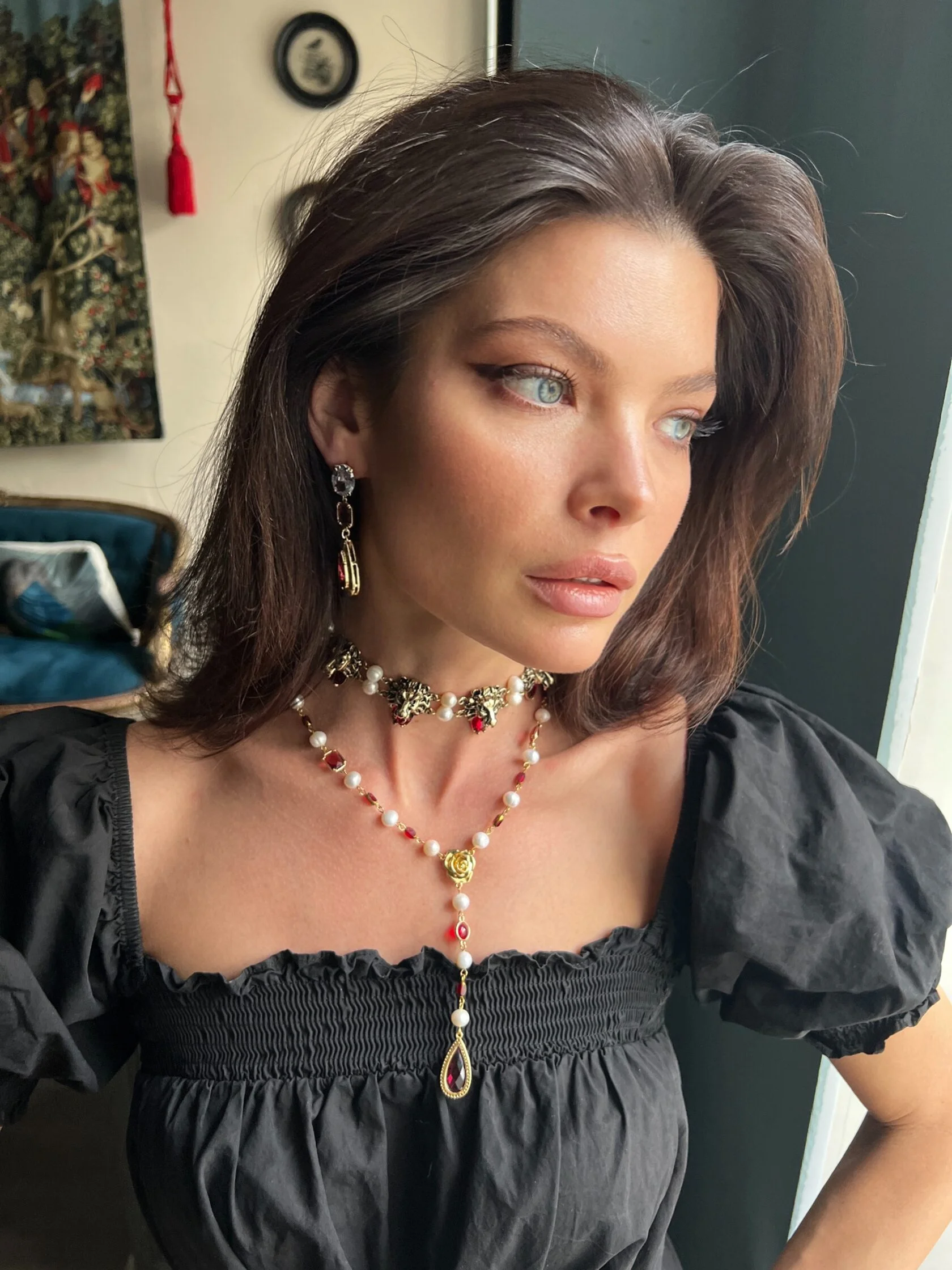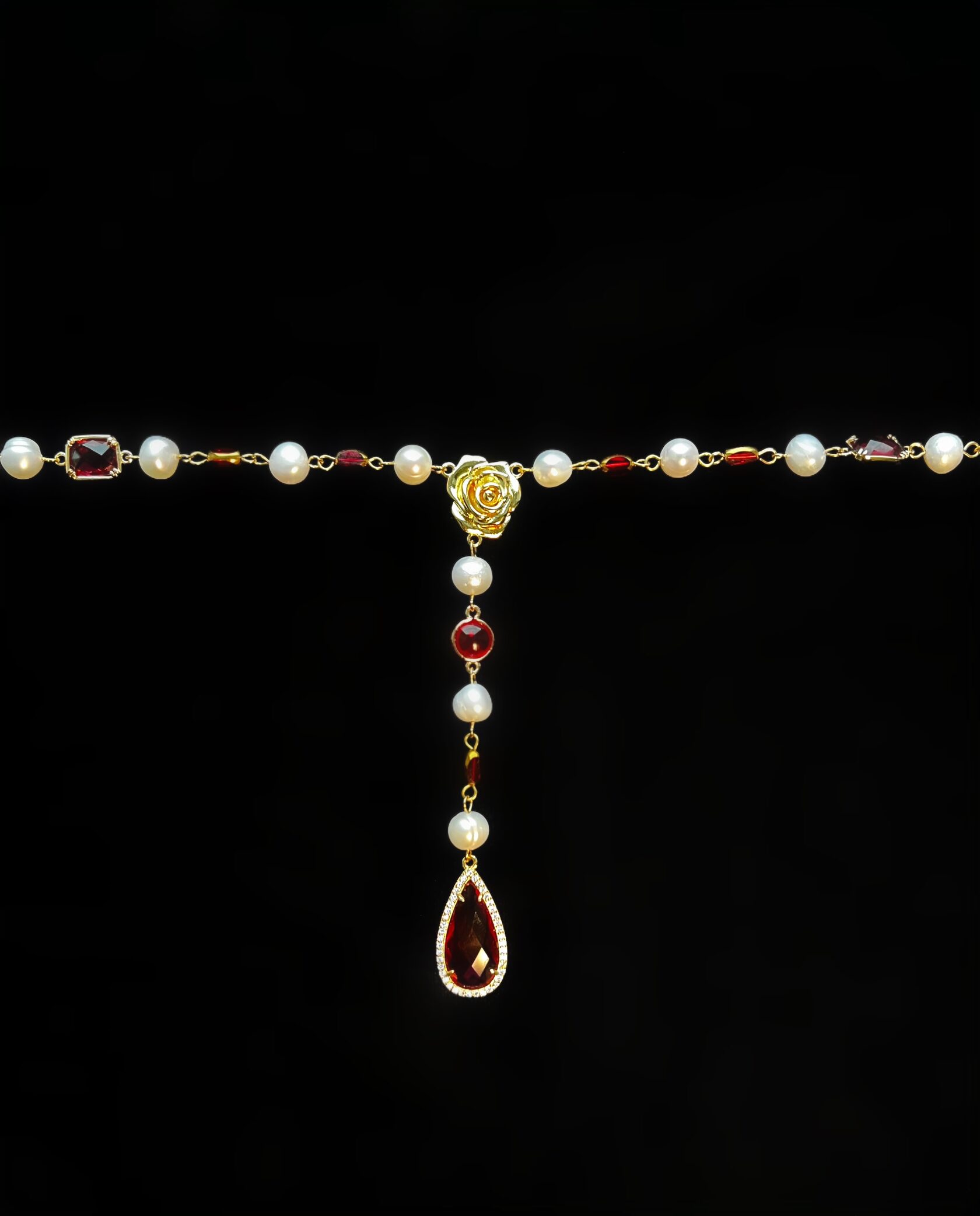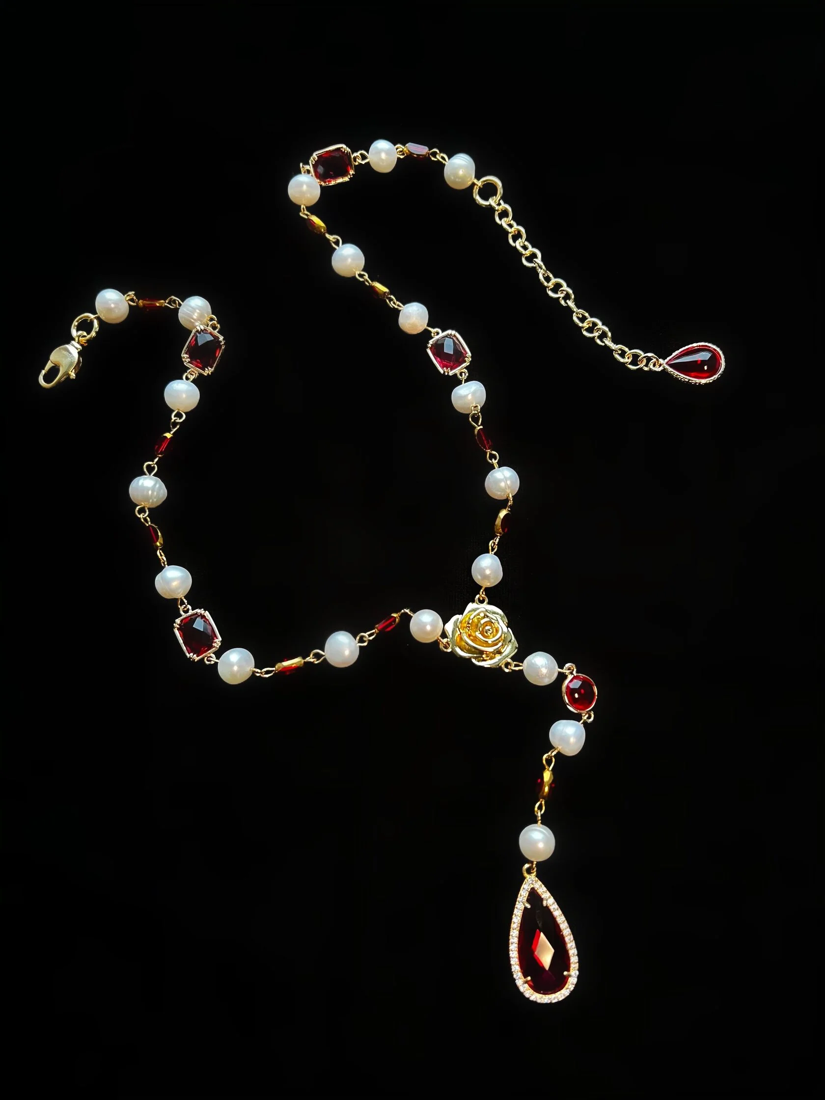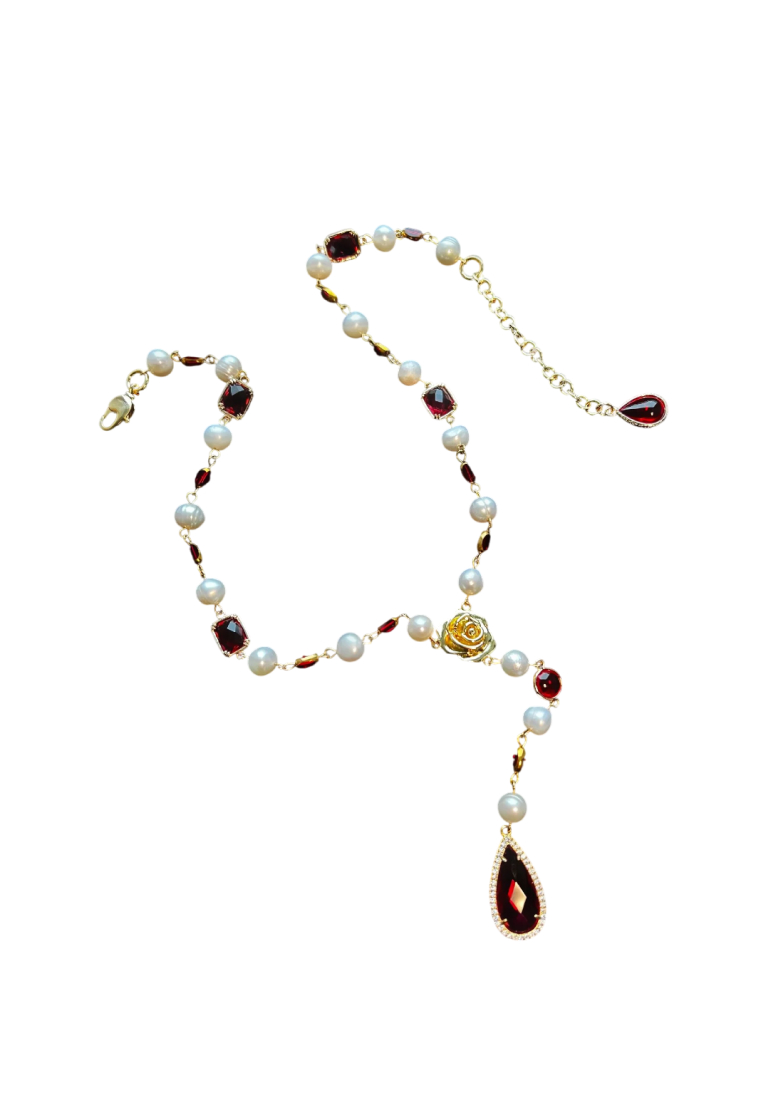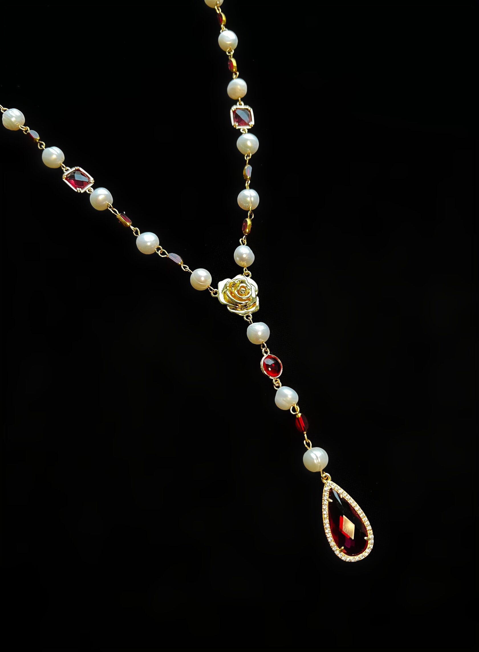 Колье-галстук собрано из натурального жемчуга, винтажного пекинского стекла и кристаллов «Swarovski». Центральная часть колье дополнена подвеской-каплей оттенка рубин. Имеется регулируемая застежка.