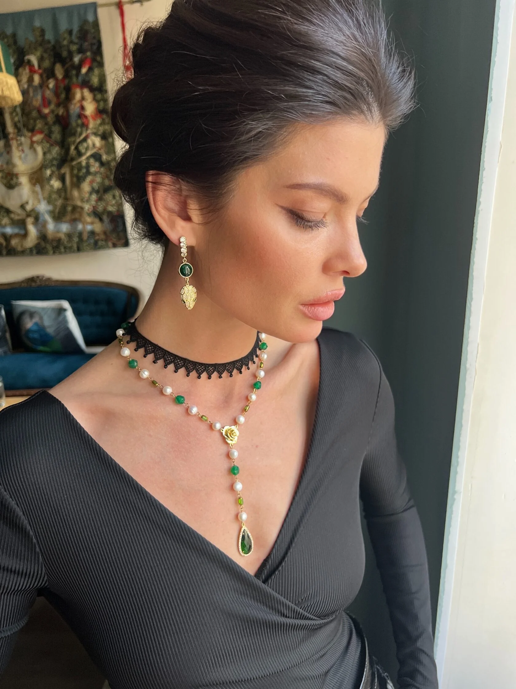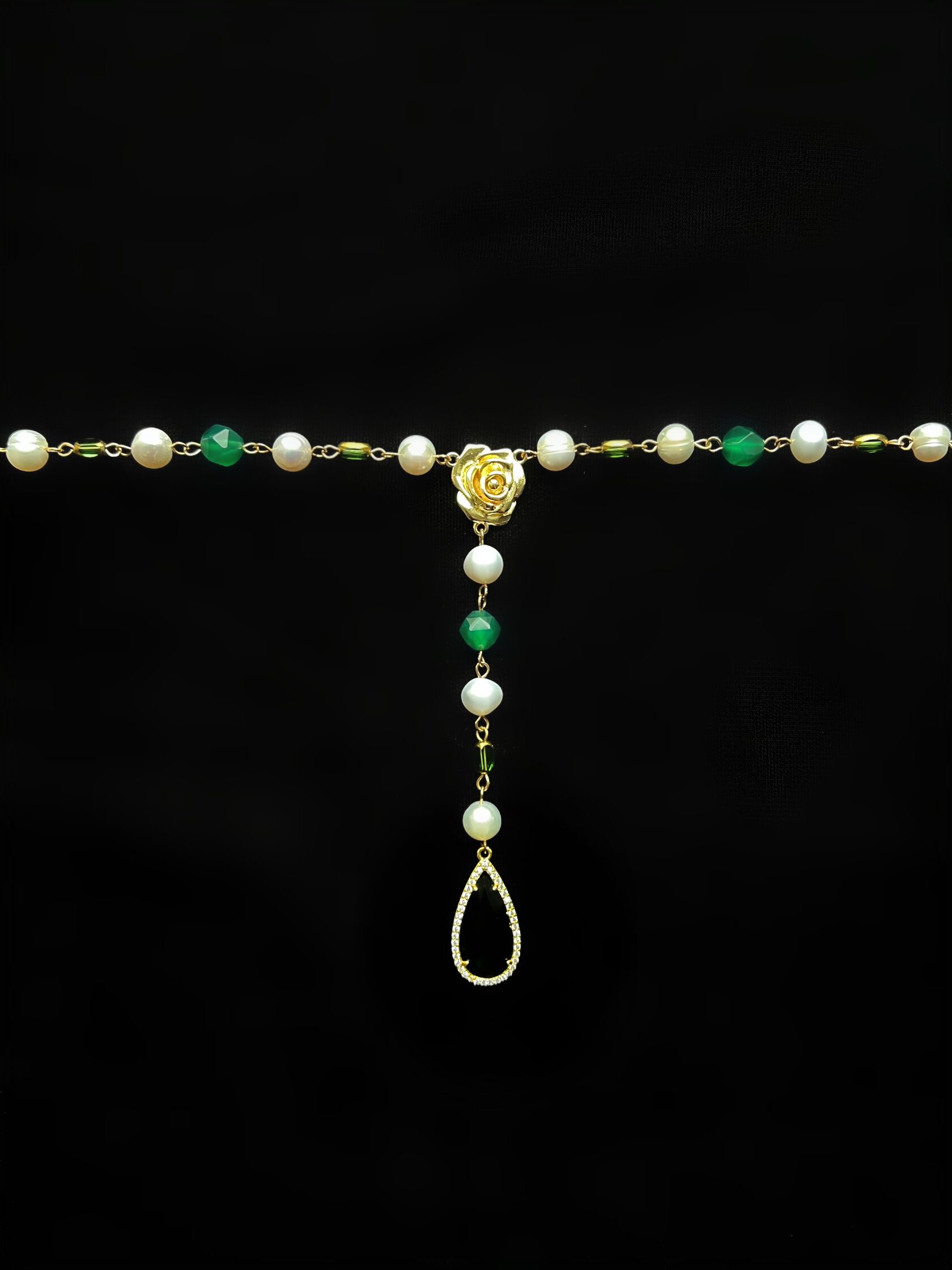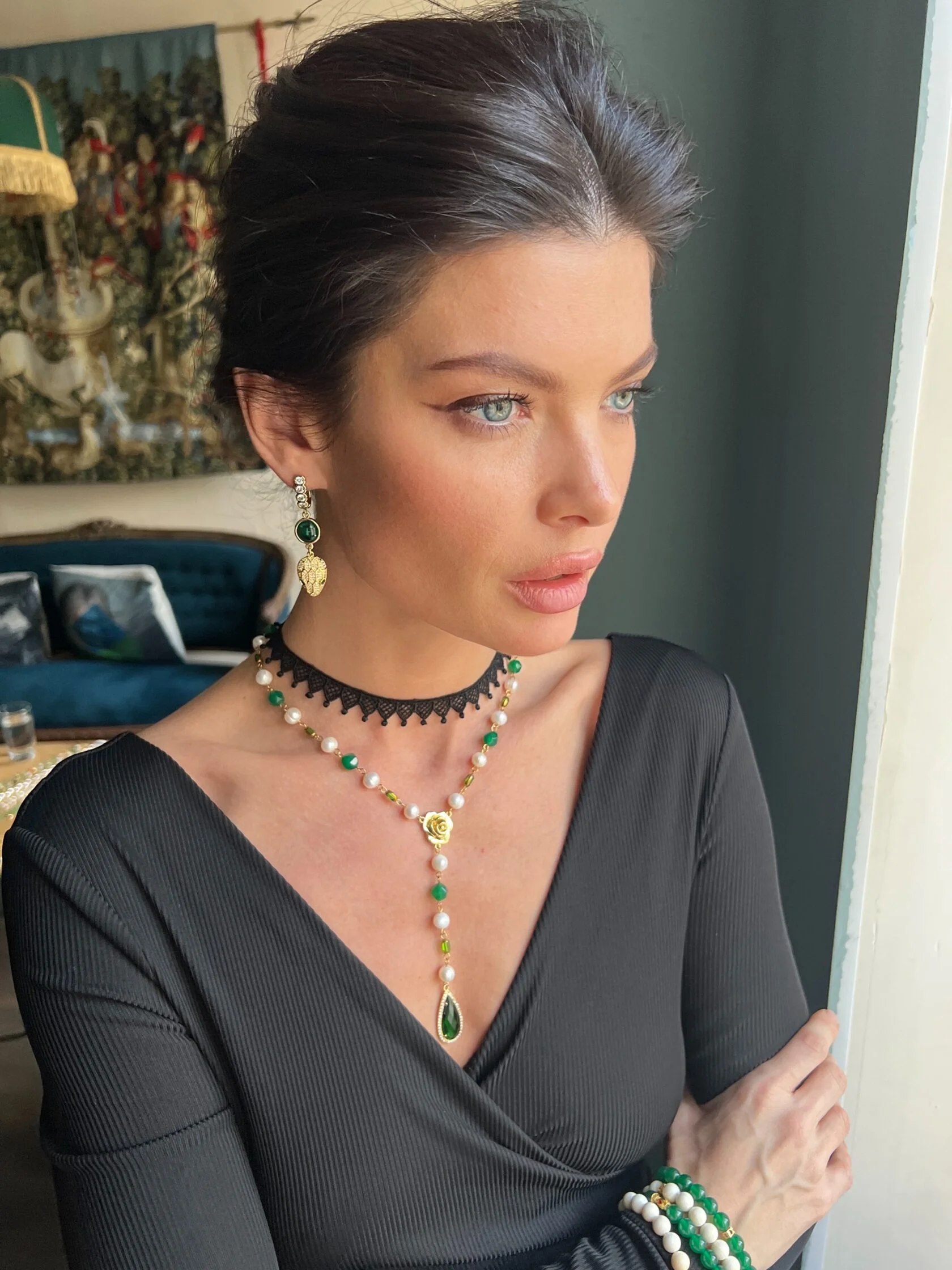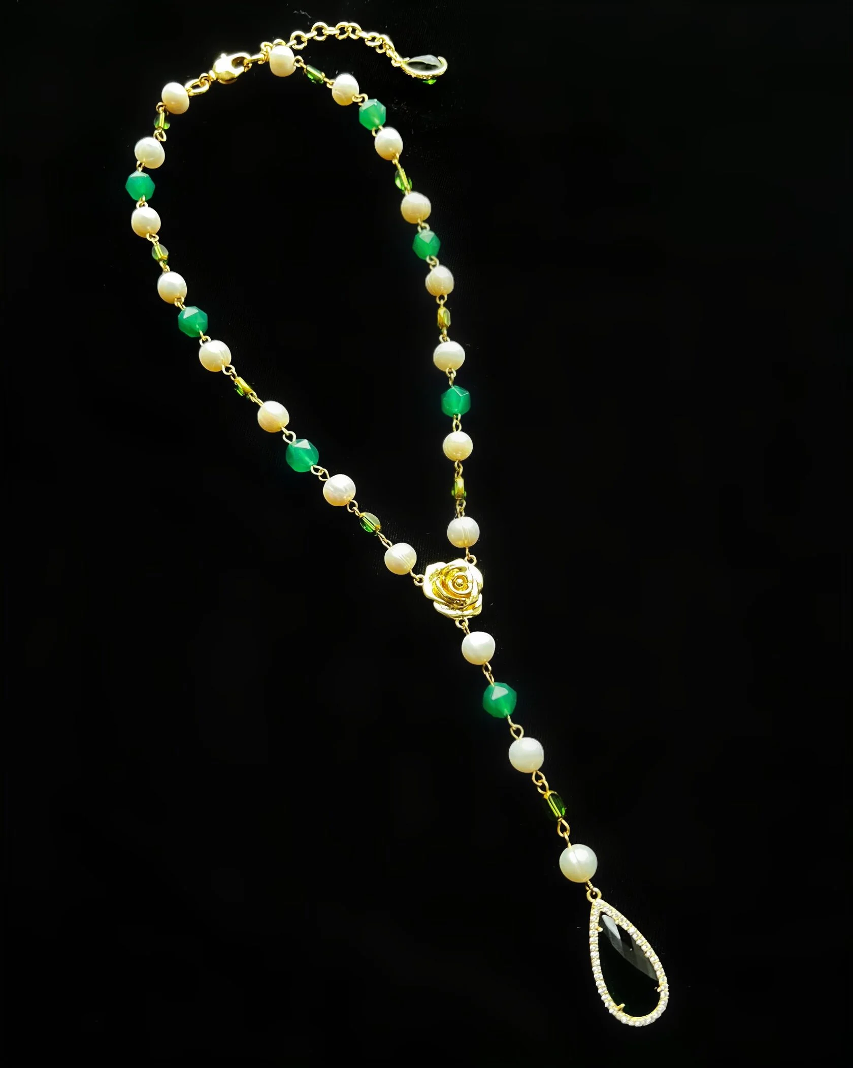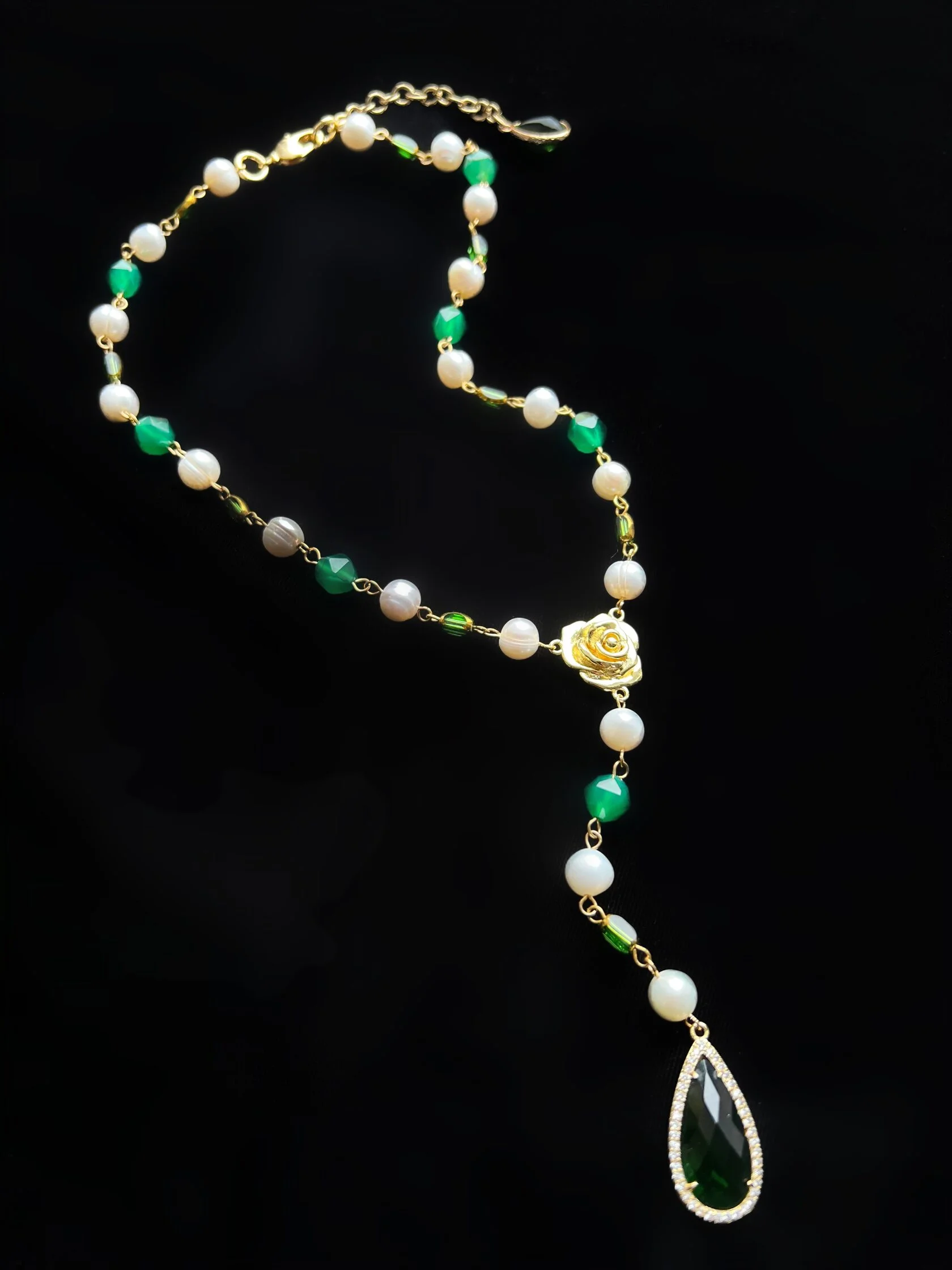 Колье-галстук собрано из натурального жемчуга, винтажного пекинского стекла и зеленого агата. Центральная часть колье дополнена подвеской-каплей оттенка изумруд. Имеется регулируемая застежка.
