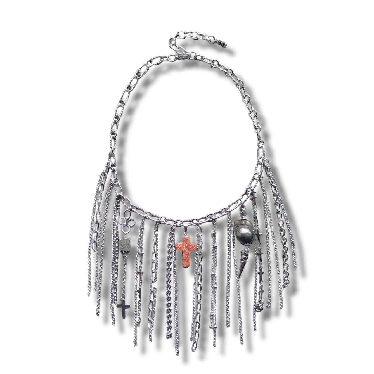 Колье с цепями из нержавеющей стали со вставками натуральных камней и подвесок в виде крестов.