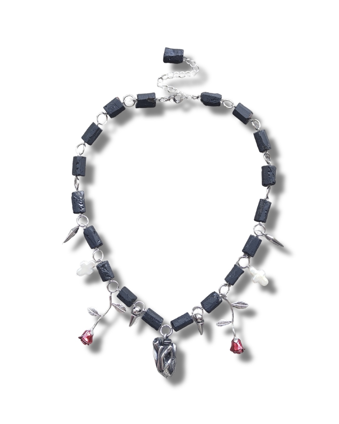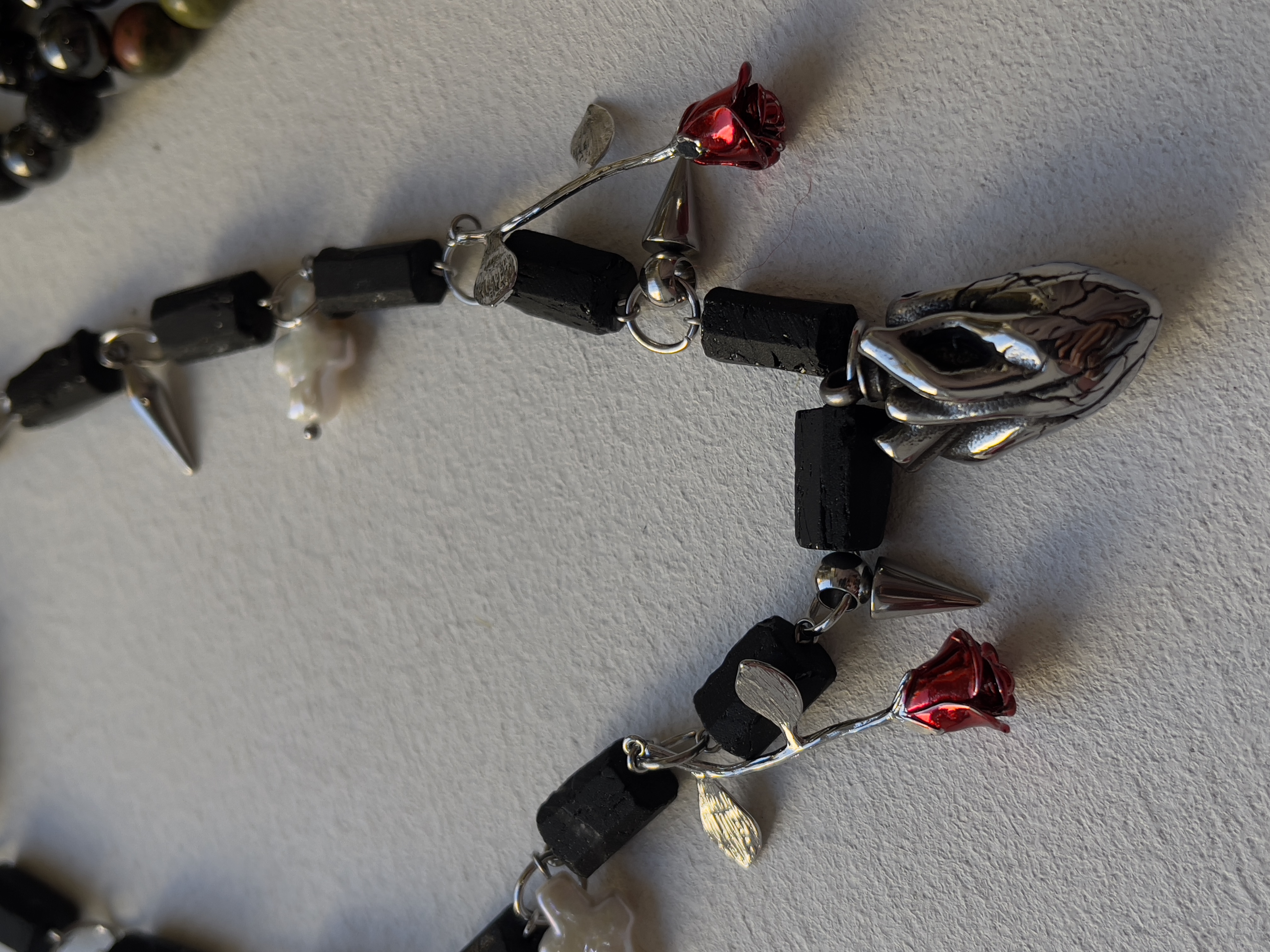 Колье из черного турмалина с акцентной подвеской в виде анатомического сердца, выполненного из нержавеющей стали. Также на колье подвесы в виде шипов, роз с красной эмалью и крестов из натурального жемчуга.