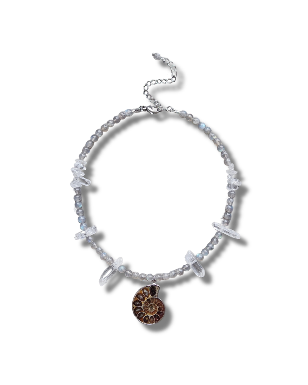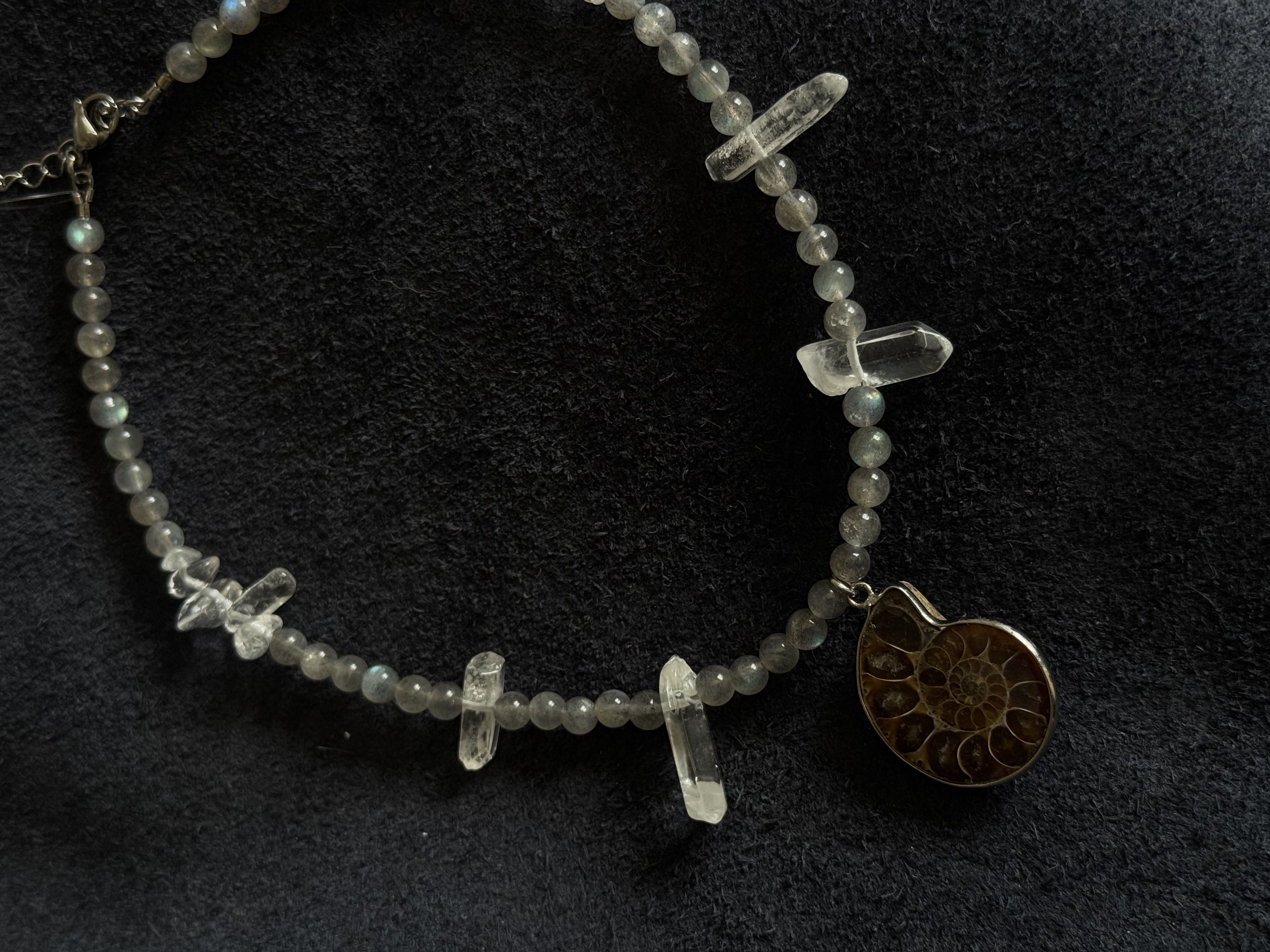 Колье из светящегося лабрадора со вставками кристаллов горного хрусталя и подвесом в виде аммонита. Аммониты – древние головоногие моллюски, чьи окаменелости сохранилисьблагодаря процессу окаменения. Длина колье регулируется.