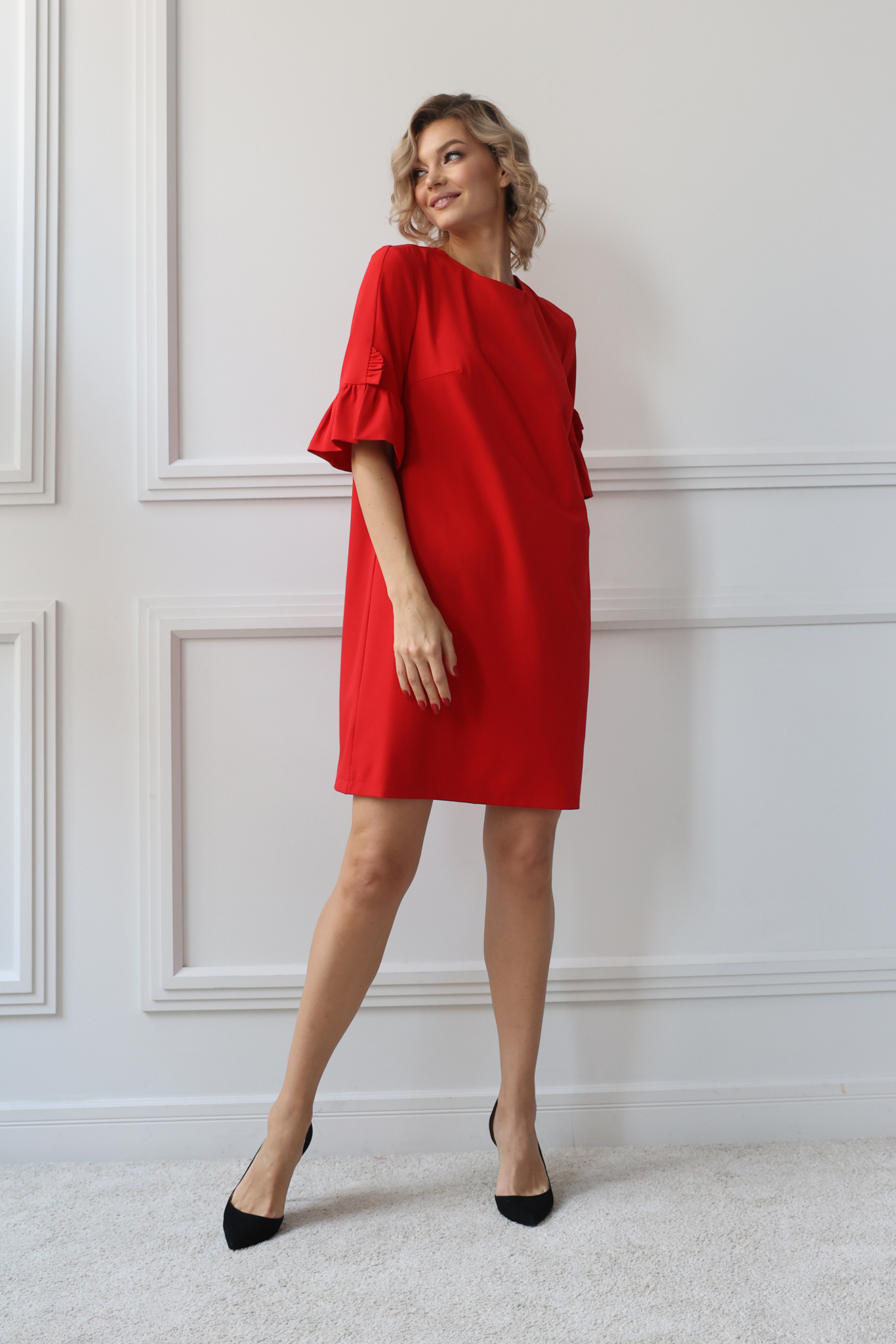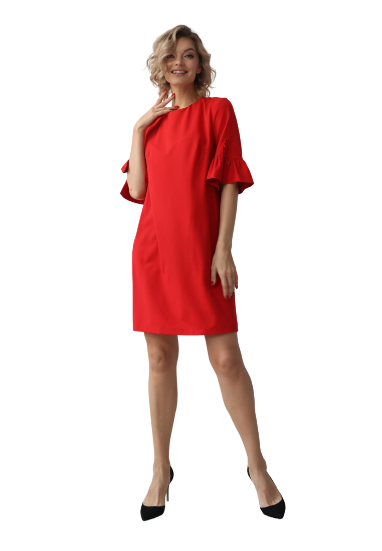 Платье из костюмной ткани прямого кроя с круглой горловиной и воланами на рукавах.