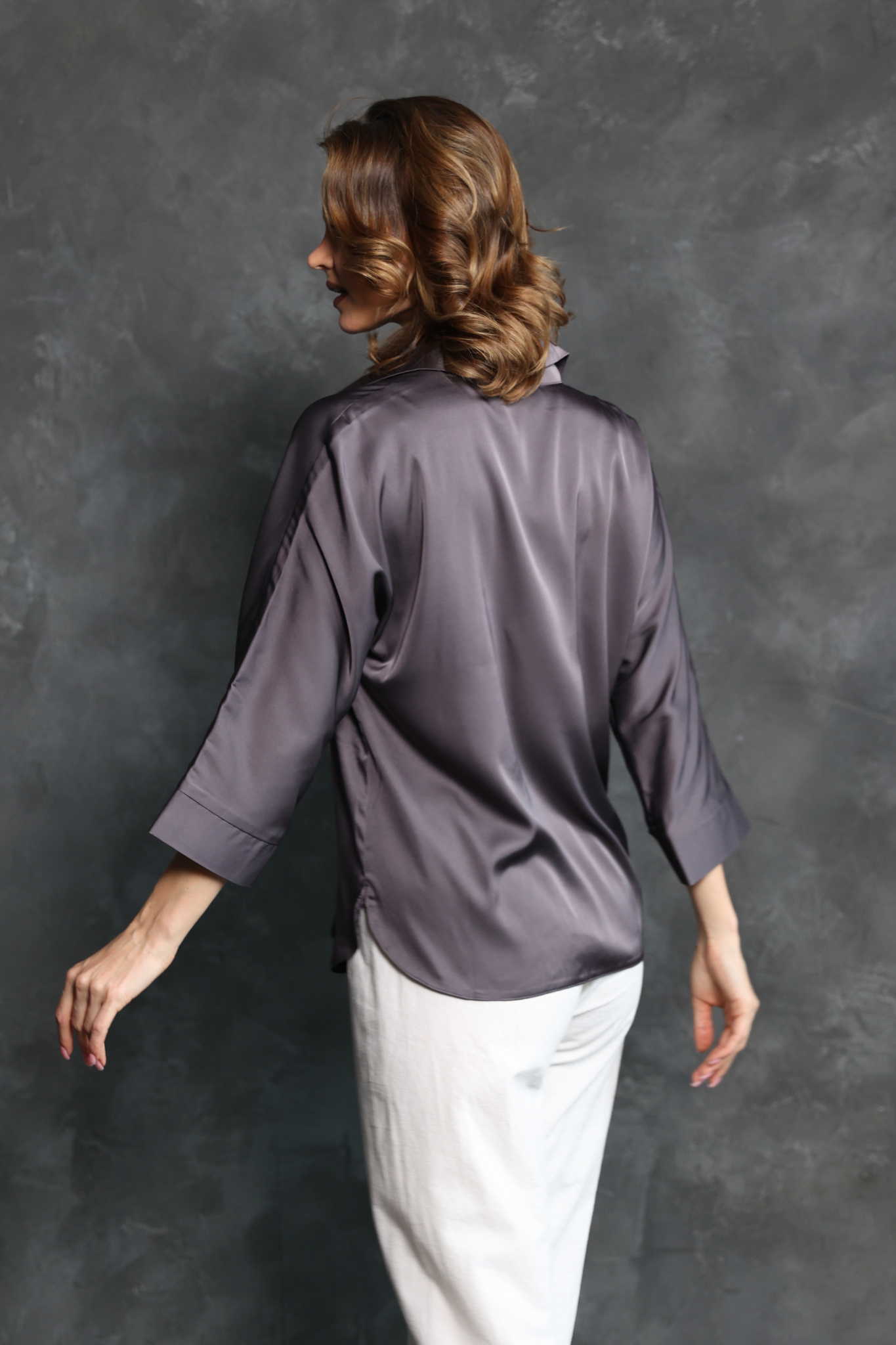 Блузка прямого кроя с полукруглым низом. Ворот с V-вырезом и отложным воротом. Широкий, втачной рукав длиной 7/8 с манжетой. Ткань: искусственный шёлк «Армани».
