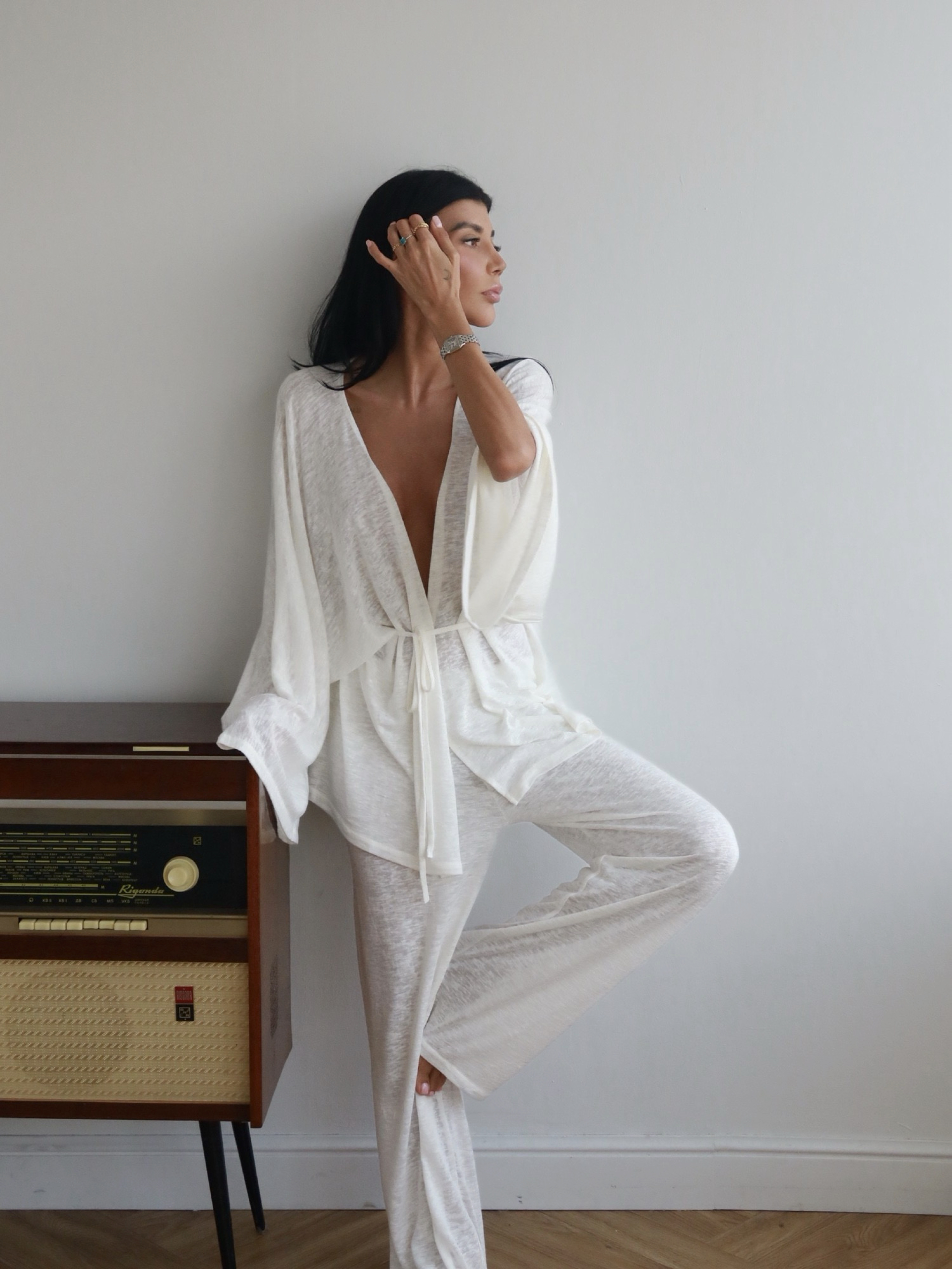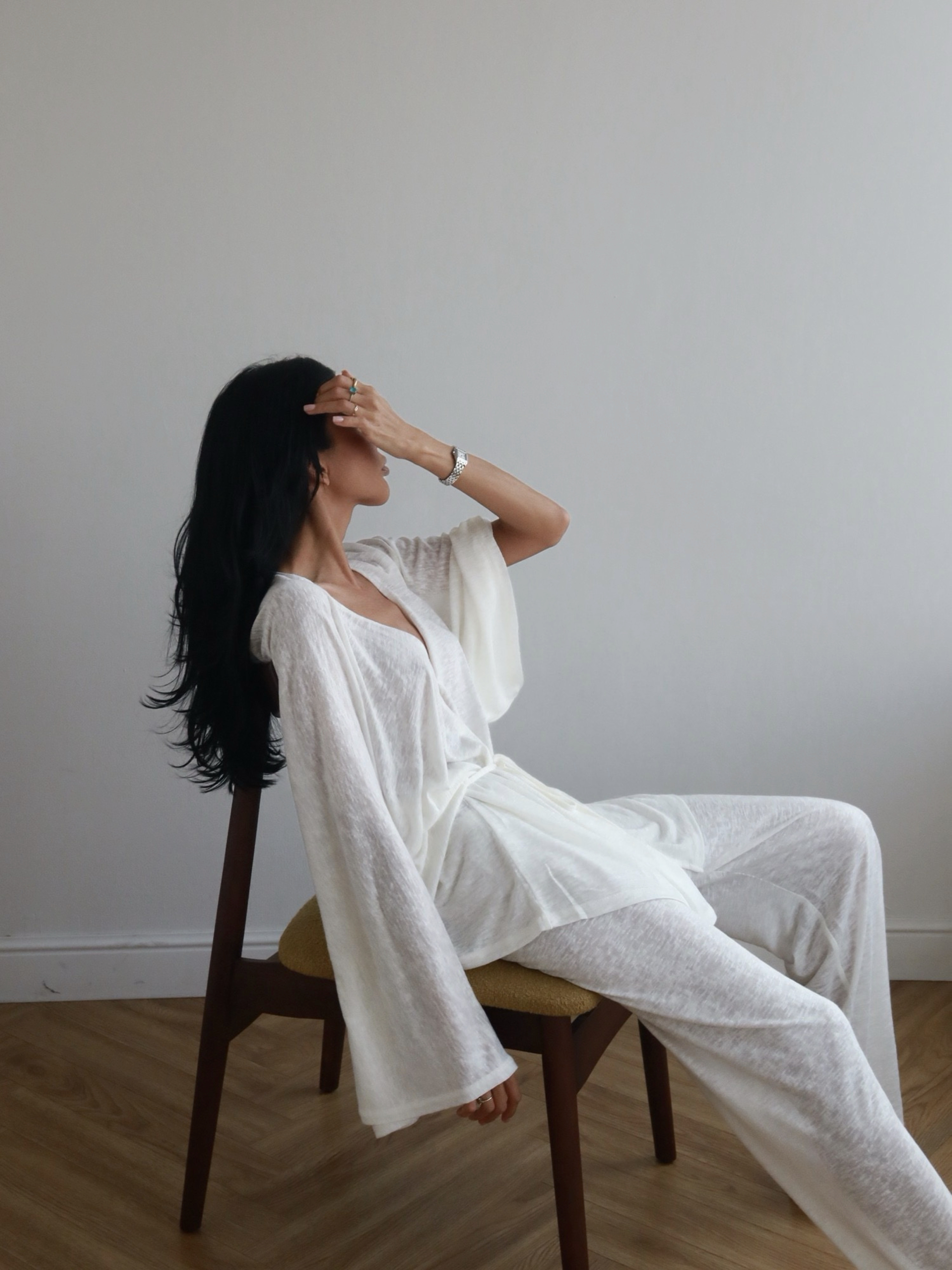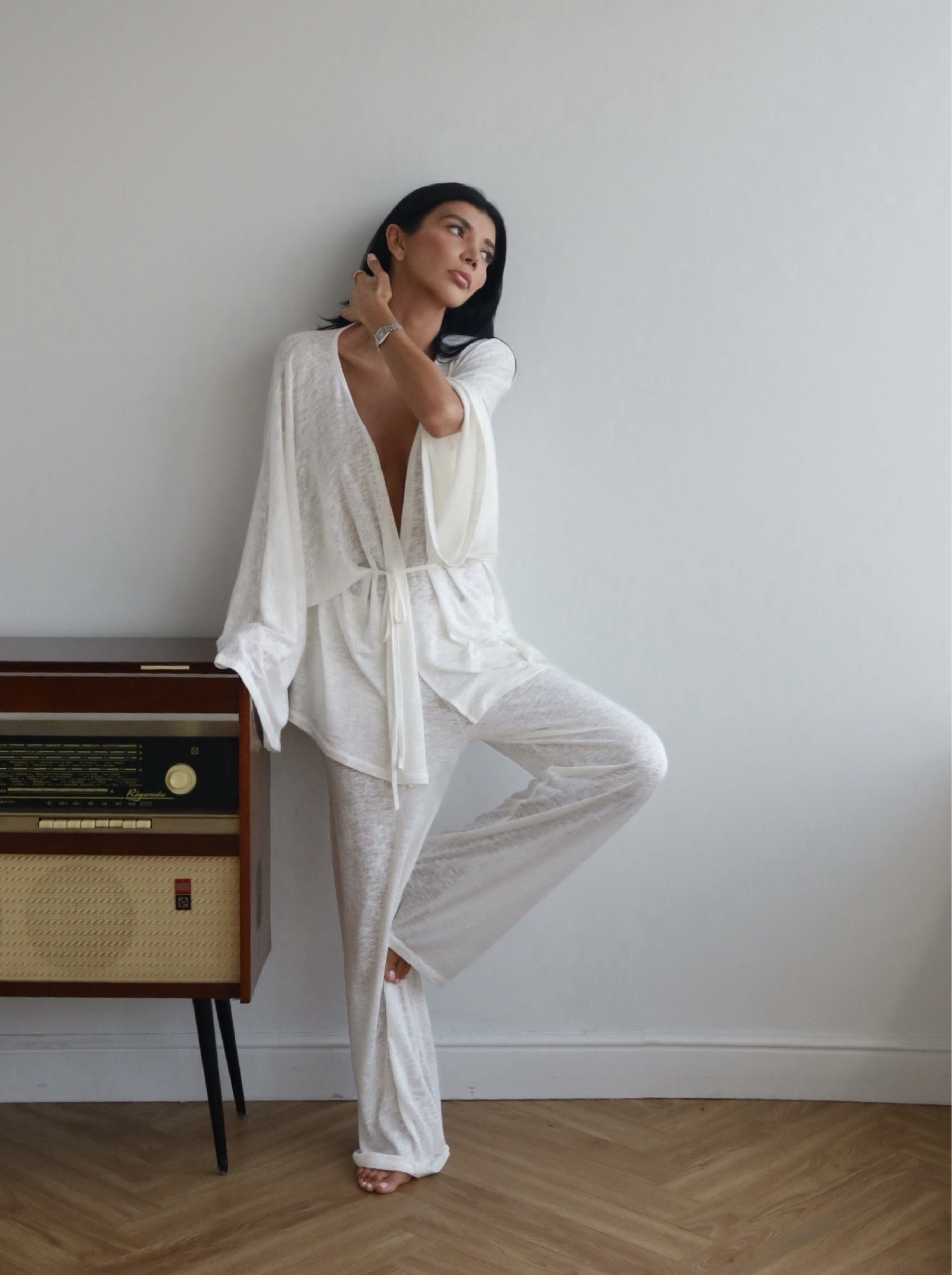 Все изделия из капсулы идеально сочетаются, дополняют друг друга и идеально интегрируются в повседневный гардероб. В капсулу входят: кардиган, кимоно, платье, лонгслив, майка, брюки. Ткань — мягкая и тактильно приятная вискоза. Материал практически не мнется, очень просто в уходе, со временем не теряет своих свойств и не меняет внешний вид.