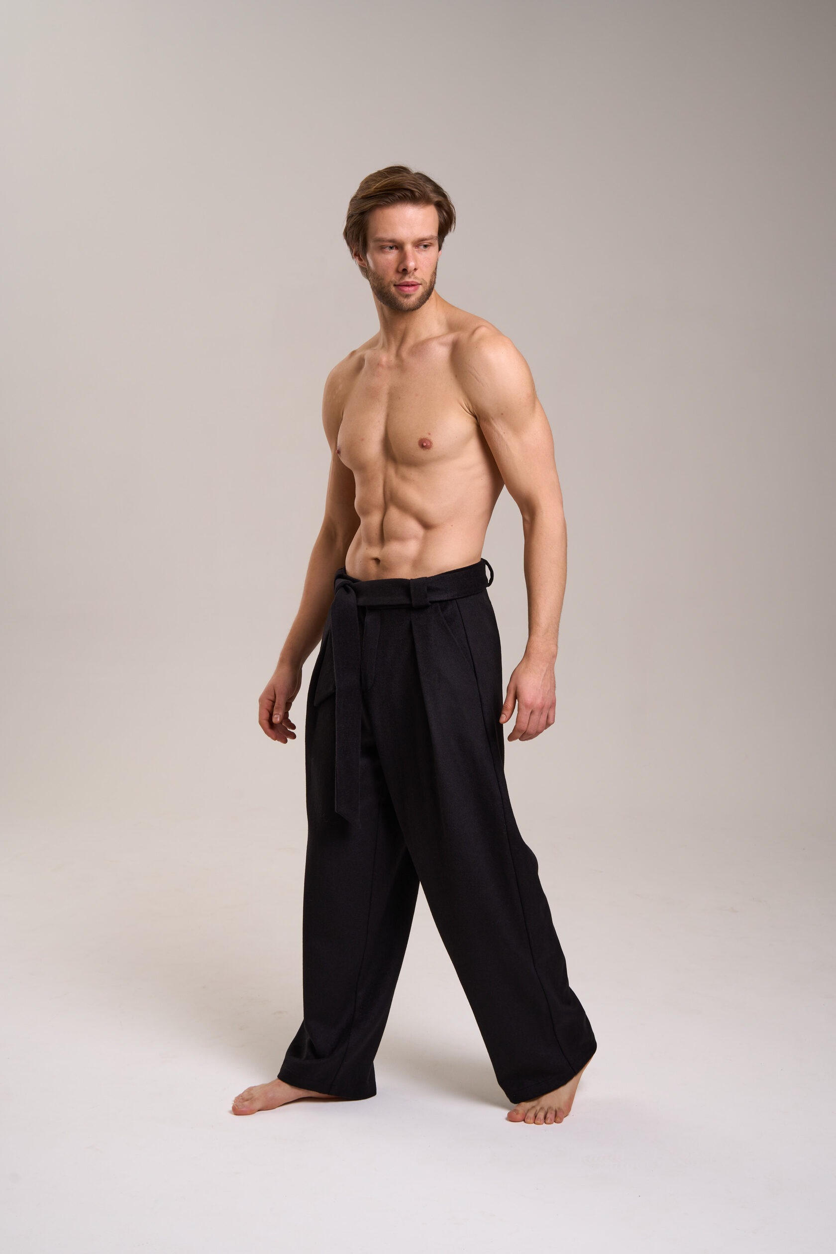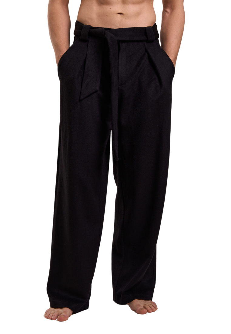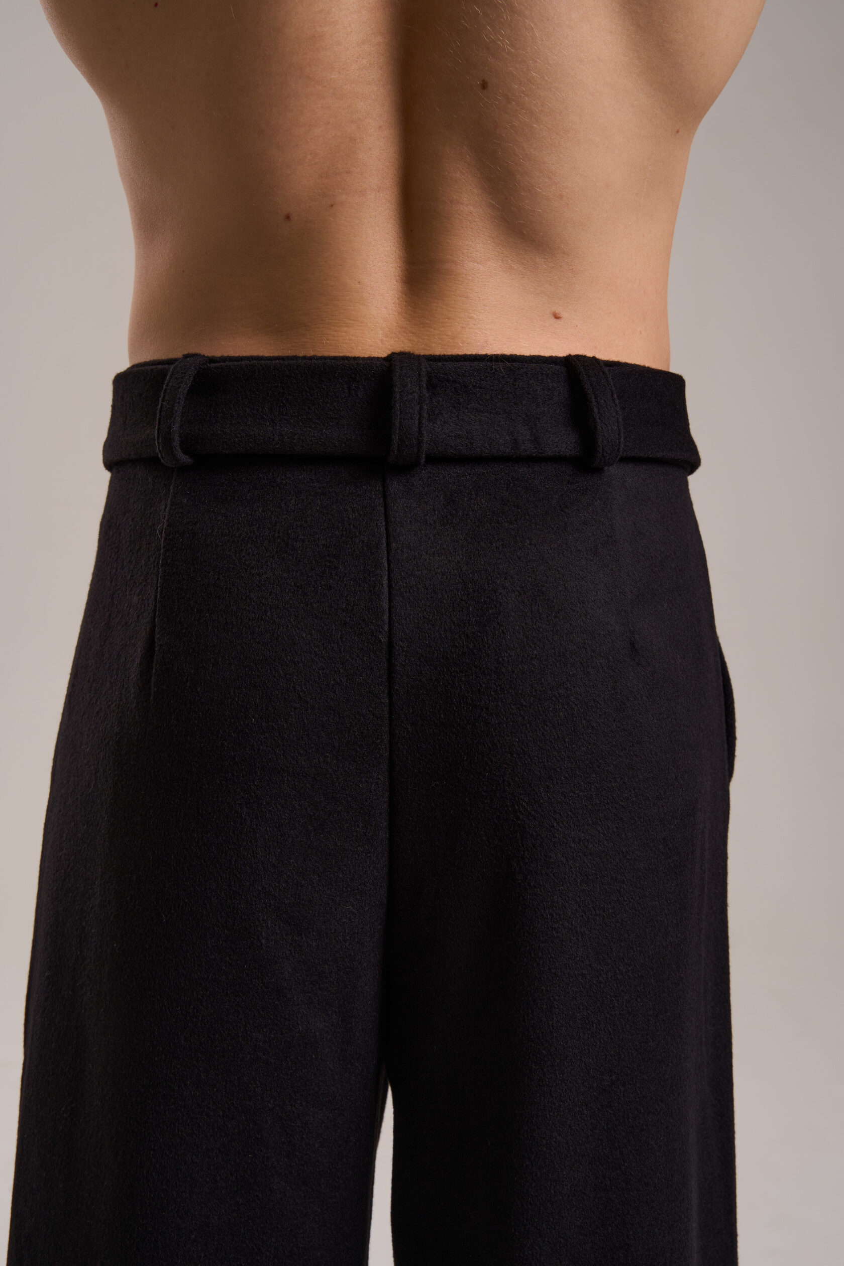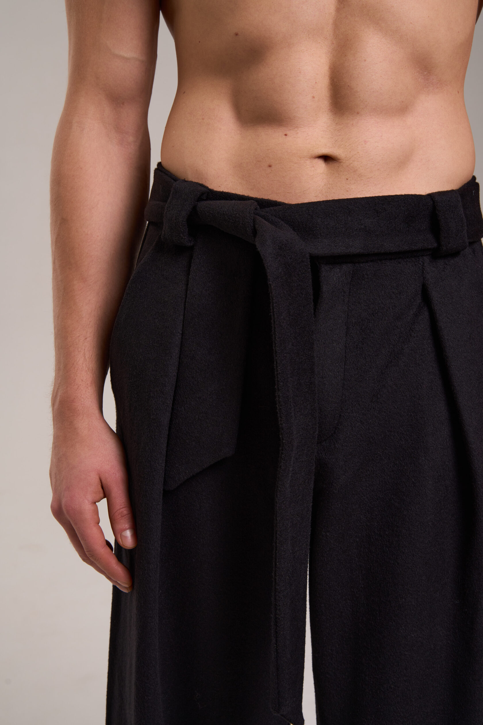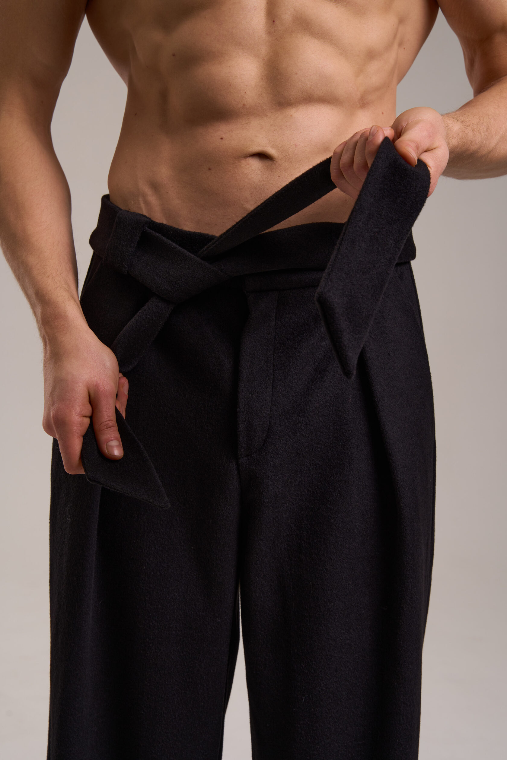 Брюки из шерсти с завязкой-кушаком и защипами.