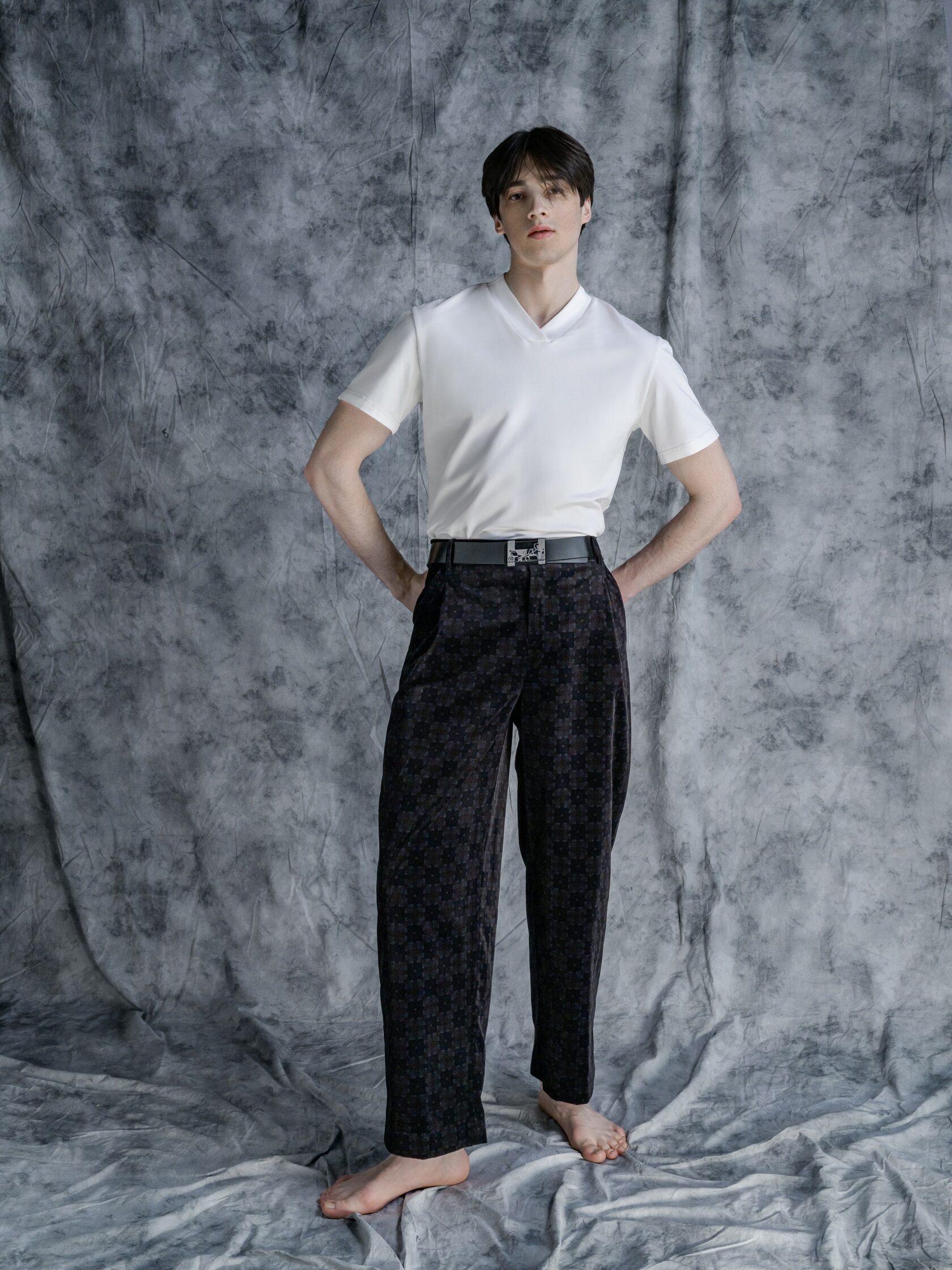 Элегантные брюки классического кроя, выполненные из легкого итальянского вельвета темно-синего цвета с утонченным геометричным принтом. Высокая талия и свободный крой обеспечивают комфорт и идеальную посадку, особенно для мужчин с широкими бедрами и узкой талией. Универсальный выбор для лета и межсезонья, эти брюки гармонично дополнят как вечерний образ, так и повседневный стиль. Легкие, мягкие и невероятно удобные в носке, они станут стильным акцентом вашего гардероба.