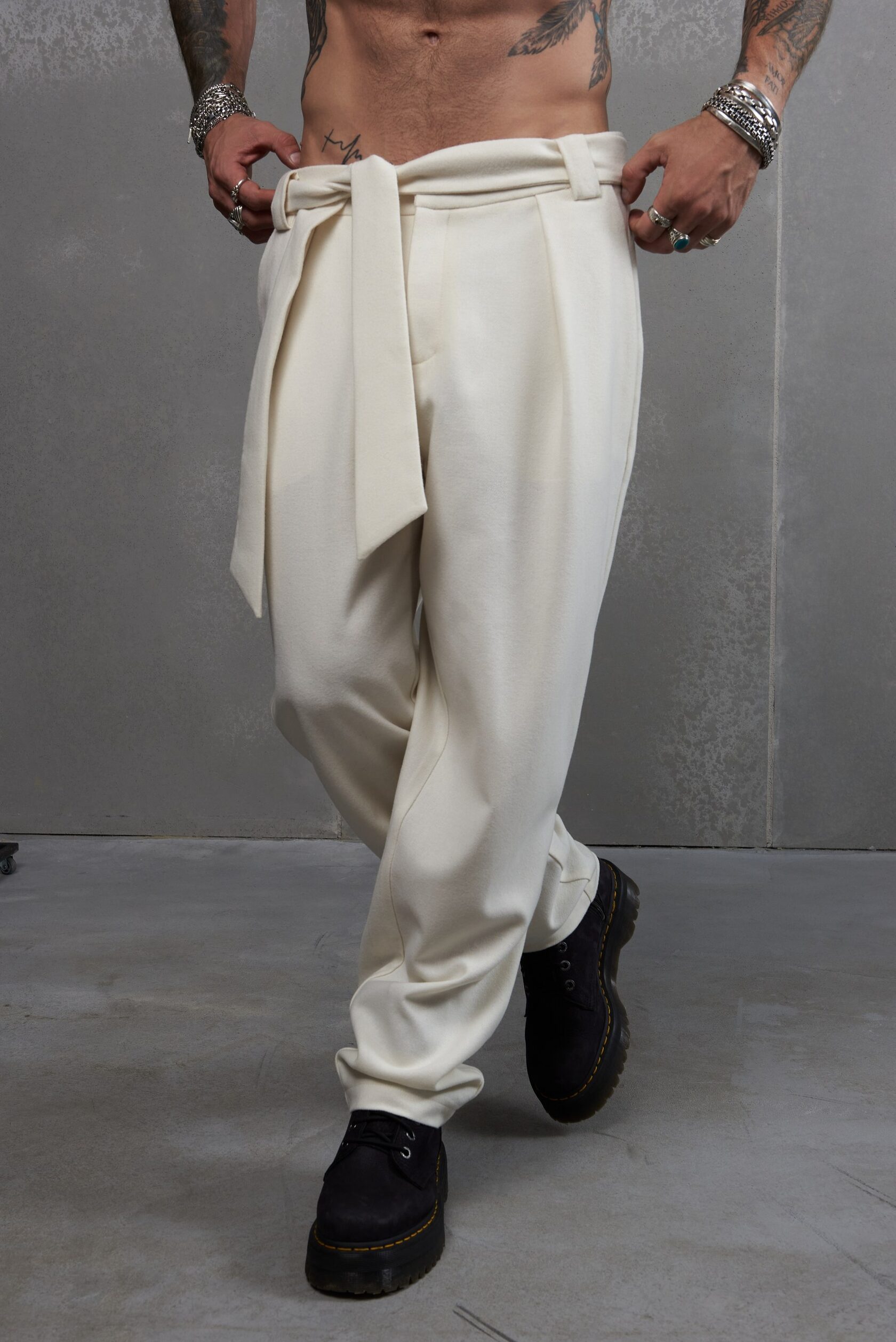 Крой с высокой талией, отлично подчеркивает длину ног. Глубокие защипы добавляют удобства и эластичности брюкам при ходьбе и просто отлично выглядят. Дополнительный обьем в бедрах, чтобы ты смог надеть свои любимые брюки после дня ног. Пояс в стиле русского кушака создает уникальный лук и позволяет легко регулировать посадку и создавать различные стилистические акценты за счет вариативности завязывания.