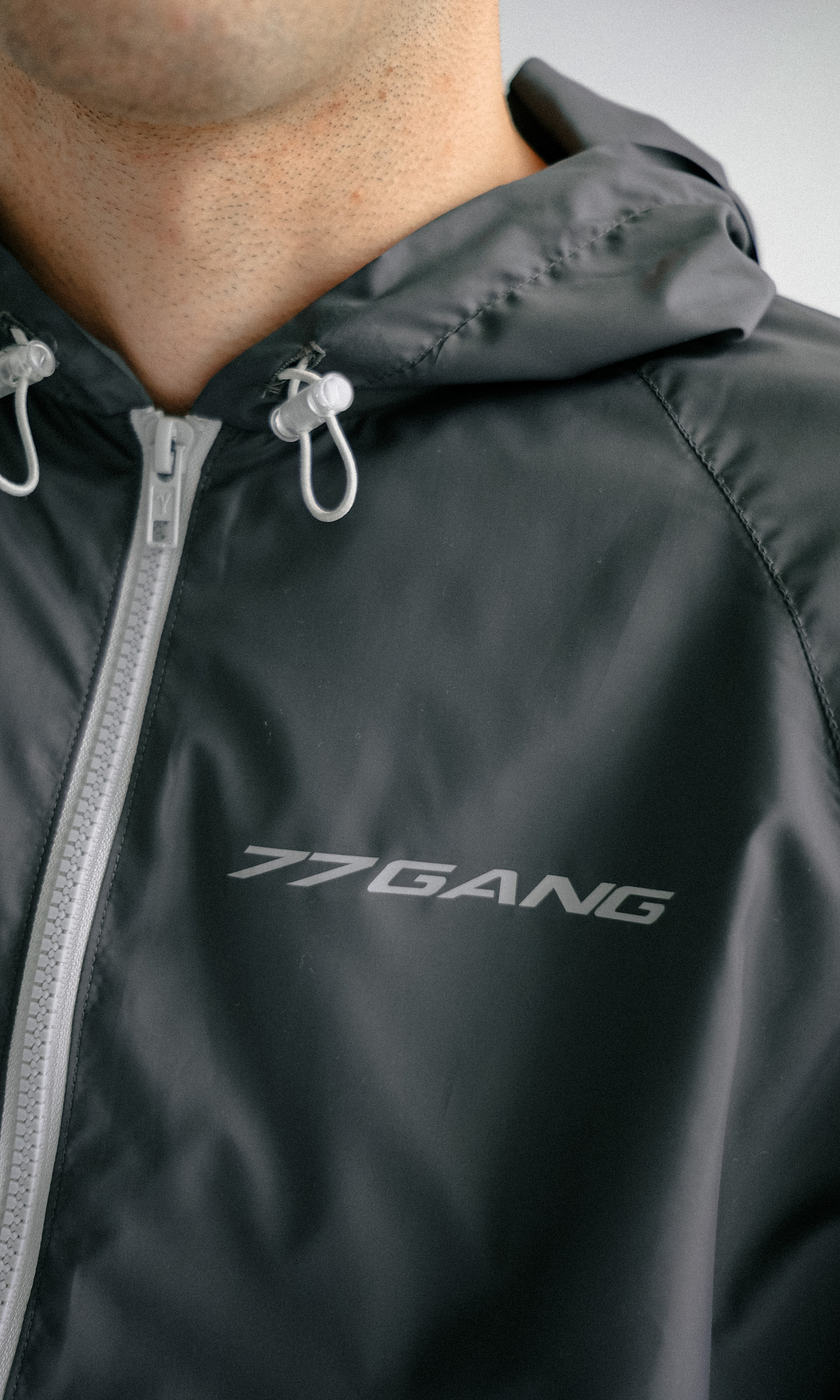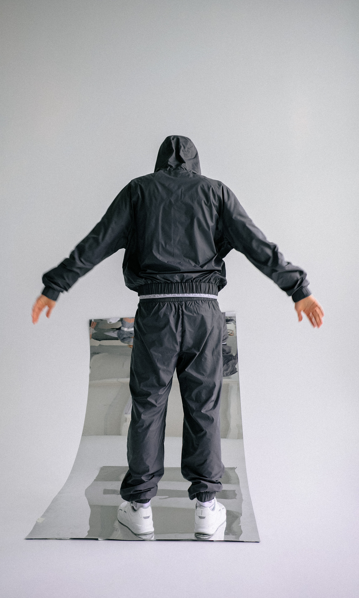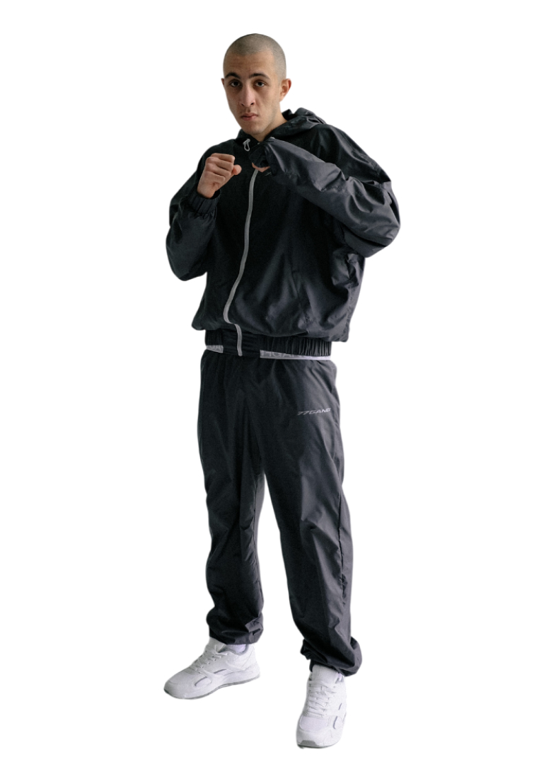 Костюм унисекс из плащевой ткани в окрасе графит. Ветровка свободного кроя. Пояс и манжеты на эластичной резинке. Брюки в спортивном стиле. Талия и по нижнему краю - на эластичной резинке. В боковых швах карманы на молнии. Пояс ветровки и брюк дополнен брендированной резинкой. Способ печати лого: термопленка.