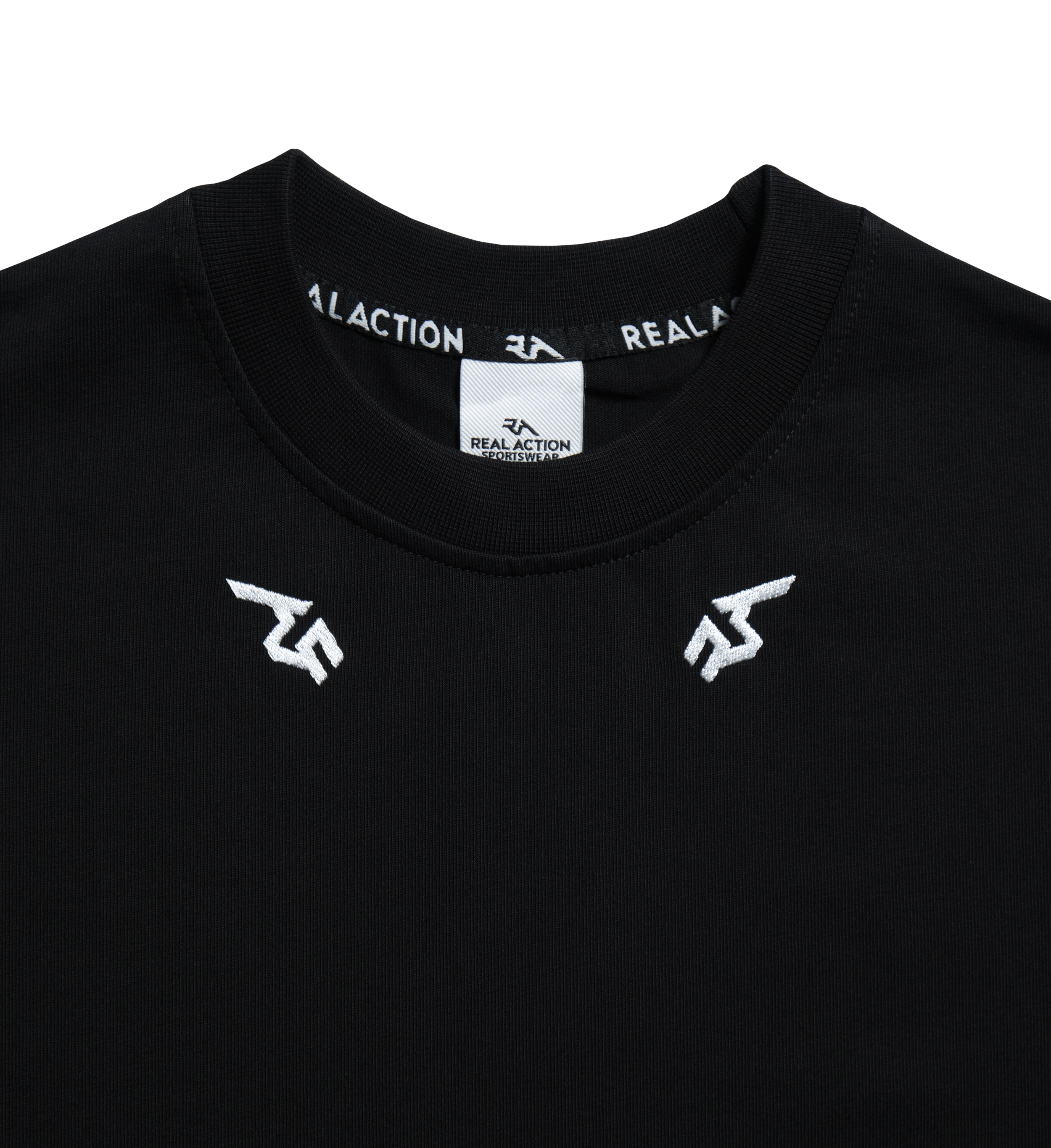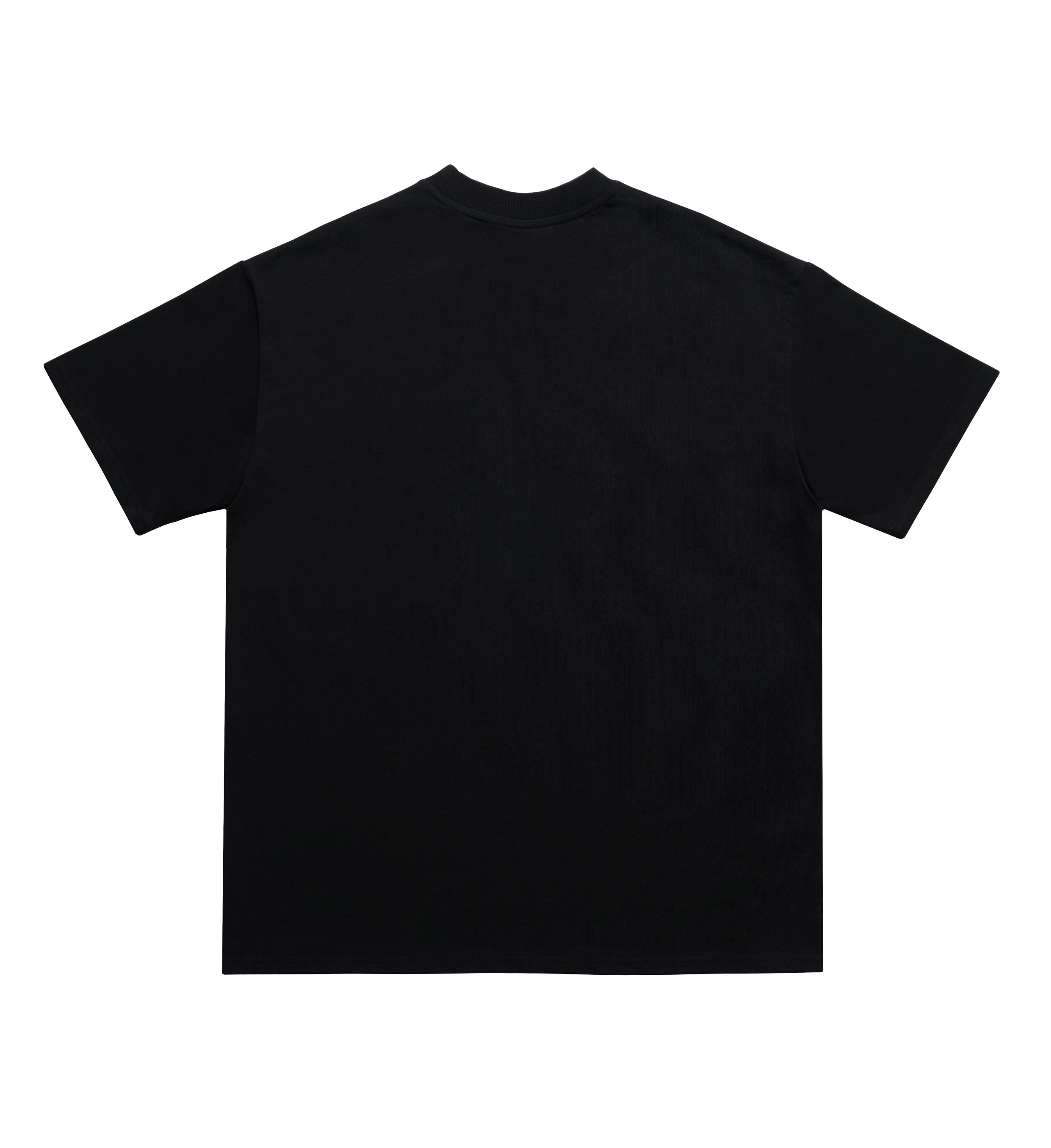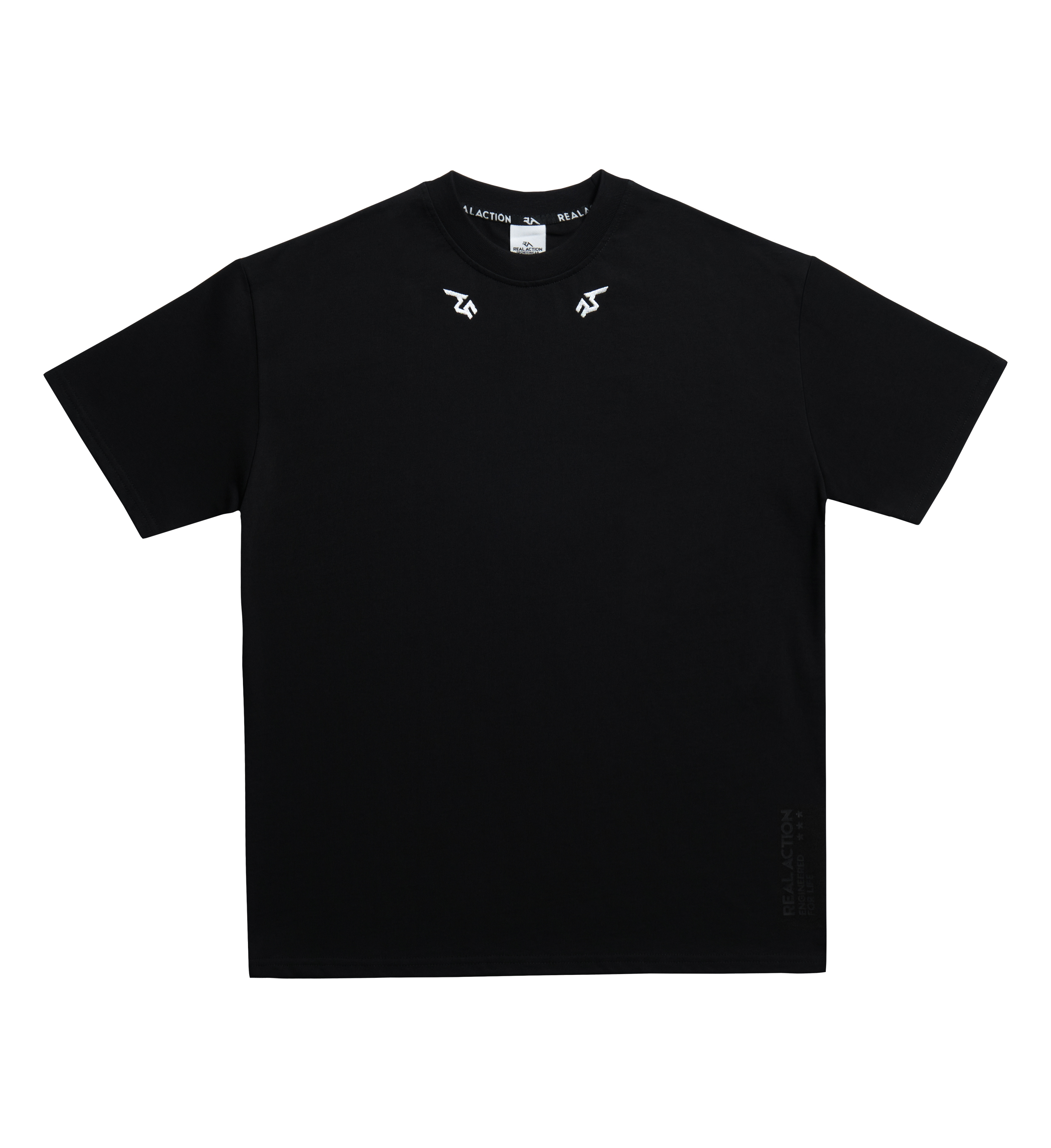 Модель представлена в классическом черном цвете, что делает её универсальной для сочетания с различными стилями. Контрастная белая вышивка в области горловины добавляет изысканности и подчеркивает внимание к деталям, в то время как принт в черном цвете, расположенный в нижней части изделия, создает современный и динамичный вид.