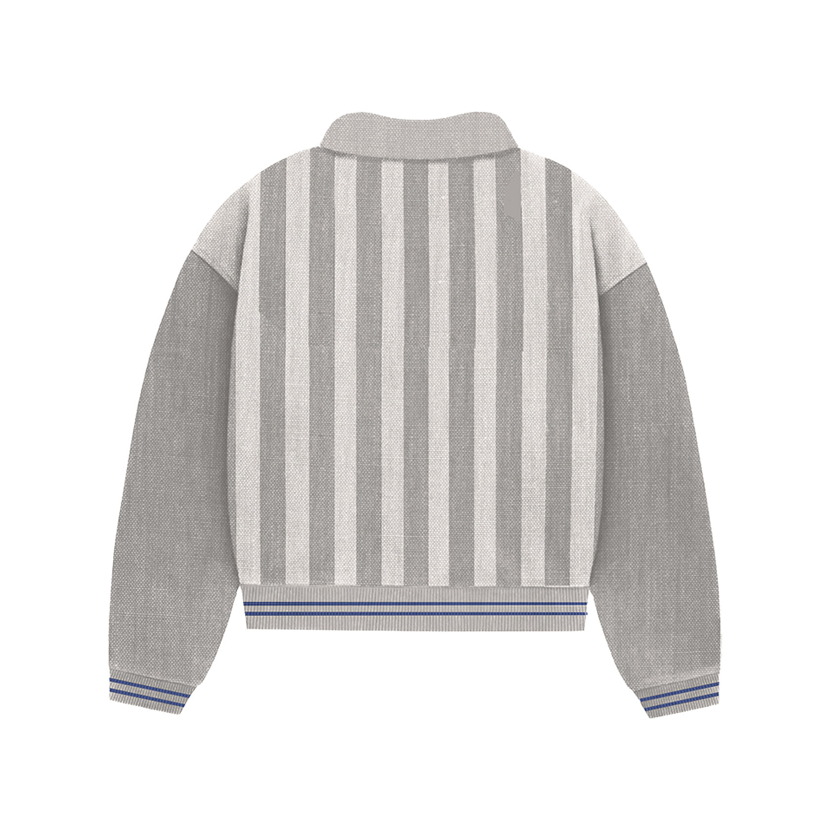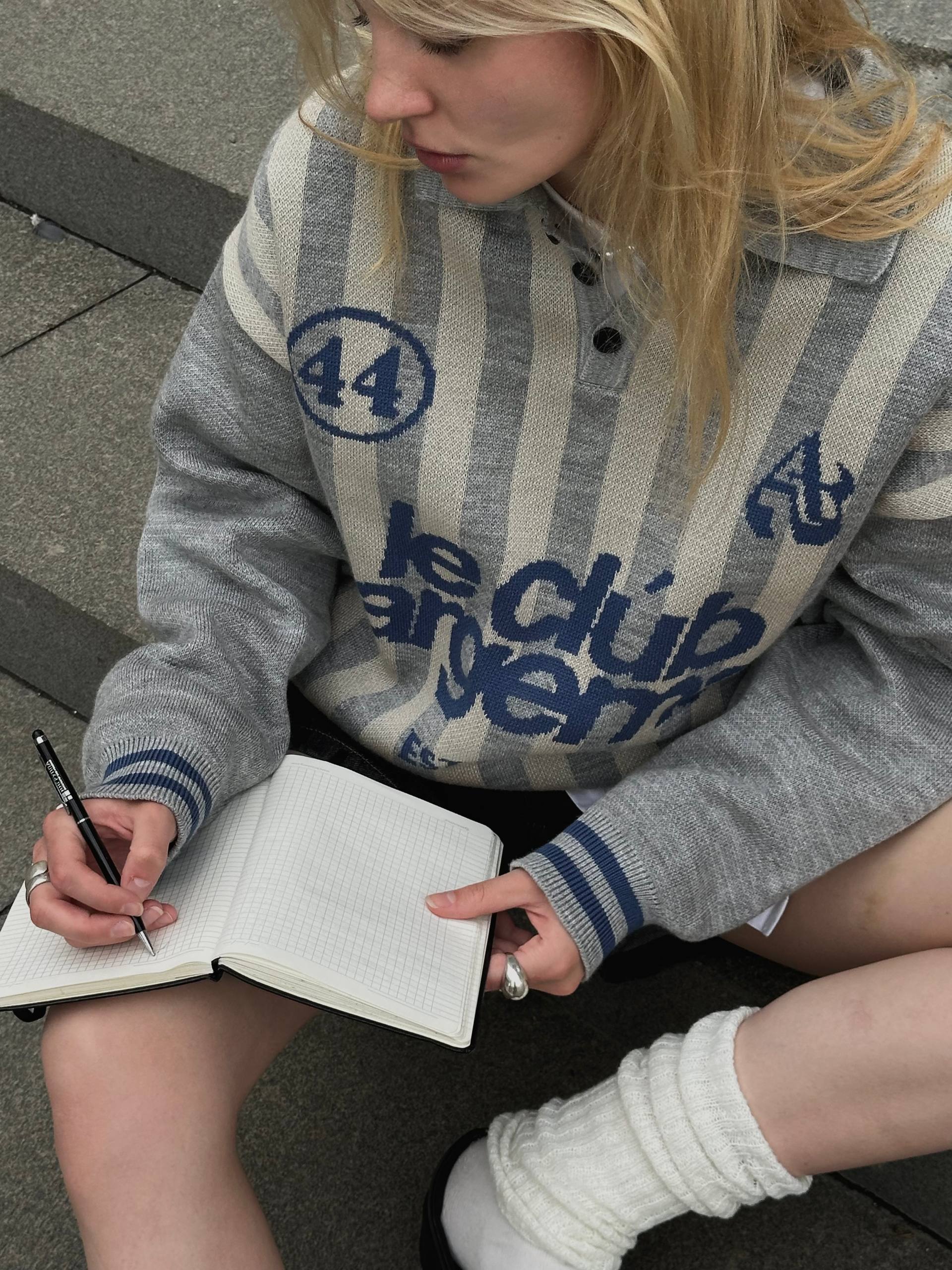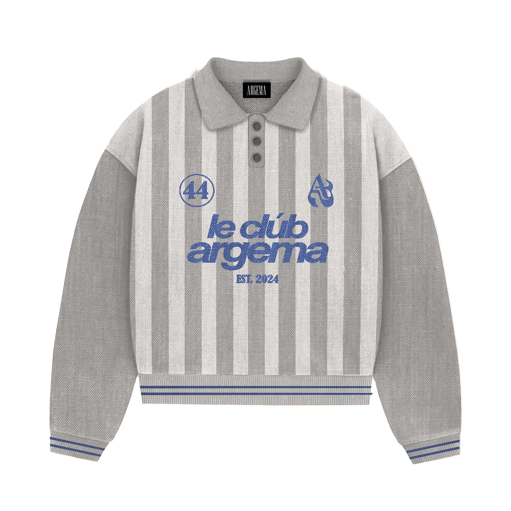 Вязаное поло-свитер, вдохновлённое эстетикой спортивных джерси, изготовленное по нашим лекалам.