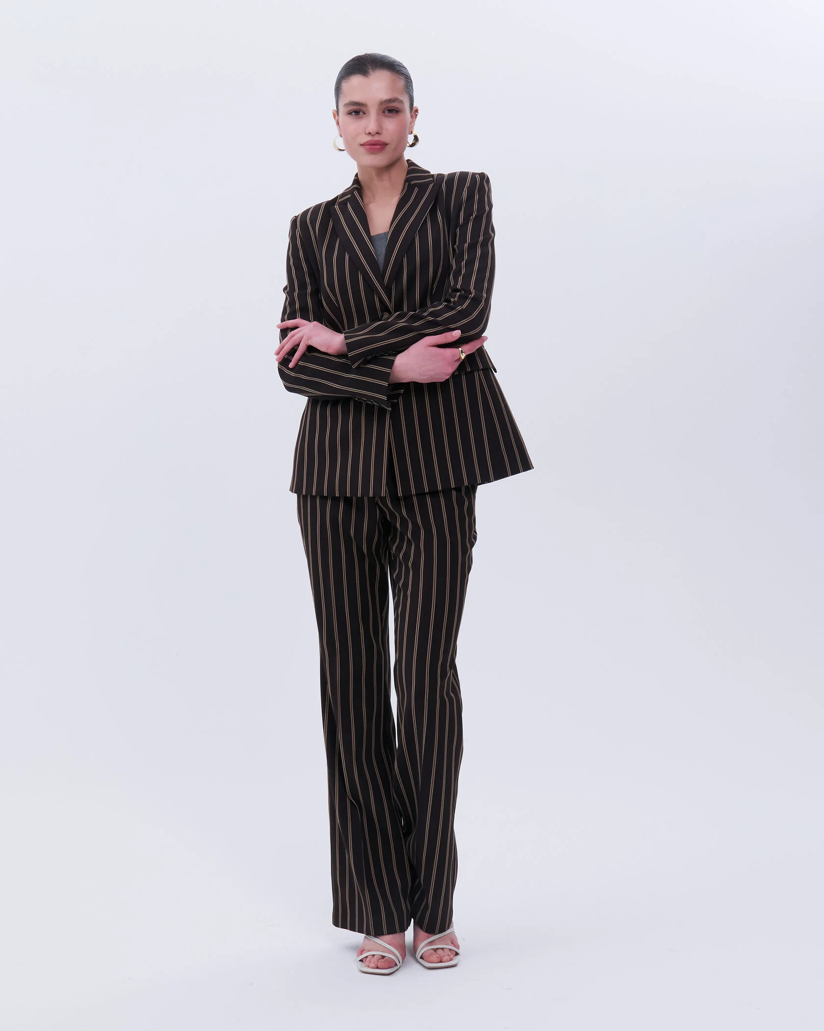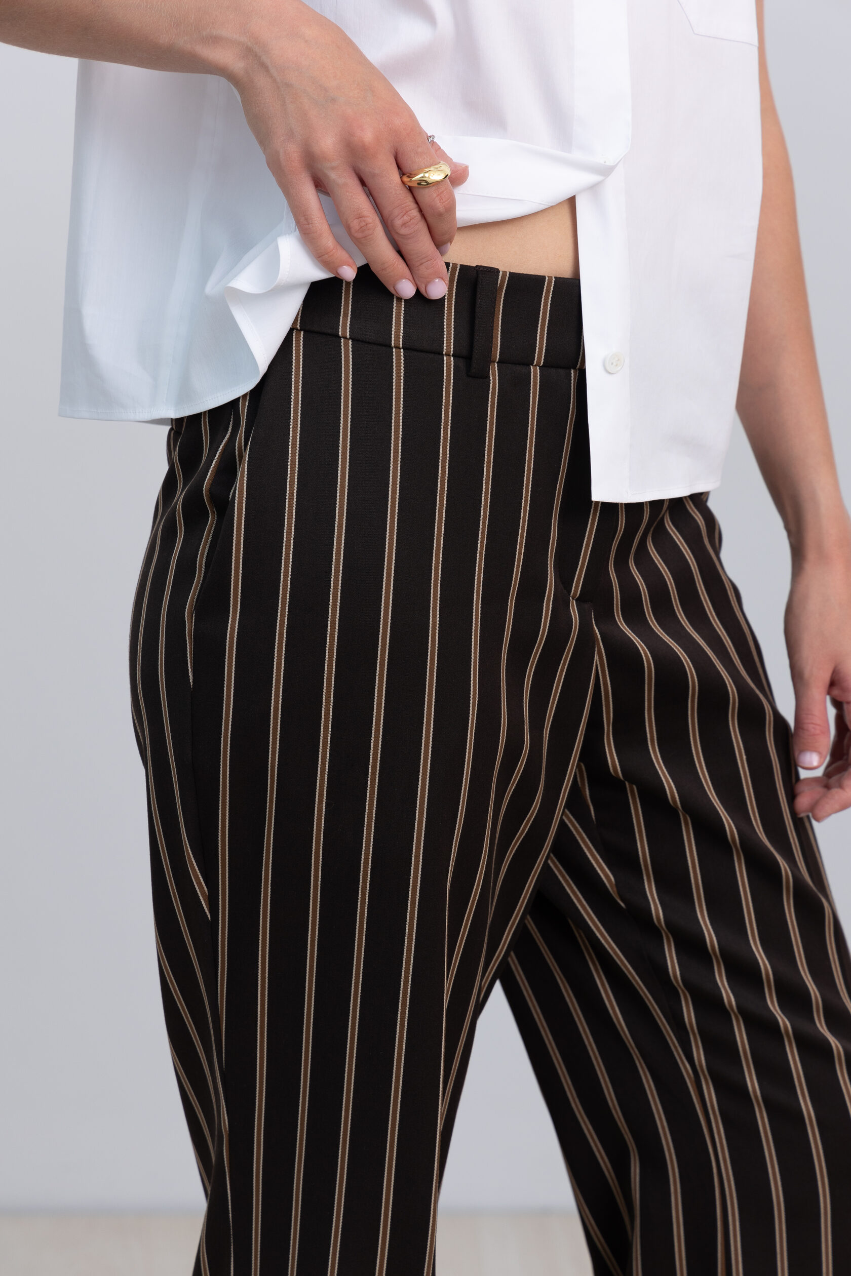 Брюки в полоску с заниженной талией Созданы для тех, кто ценит элегантность с налётом дерзости. Эти брюки идеально дополняют костюм «тройку», но могут стать самостоятельным элементом стильного образа. Прямой крой визуально удлиняет силуэт, а заниженная талия добавляет современного шика....