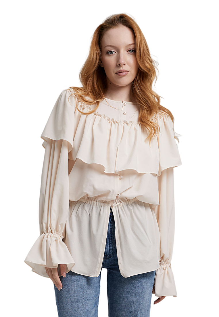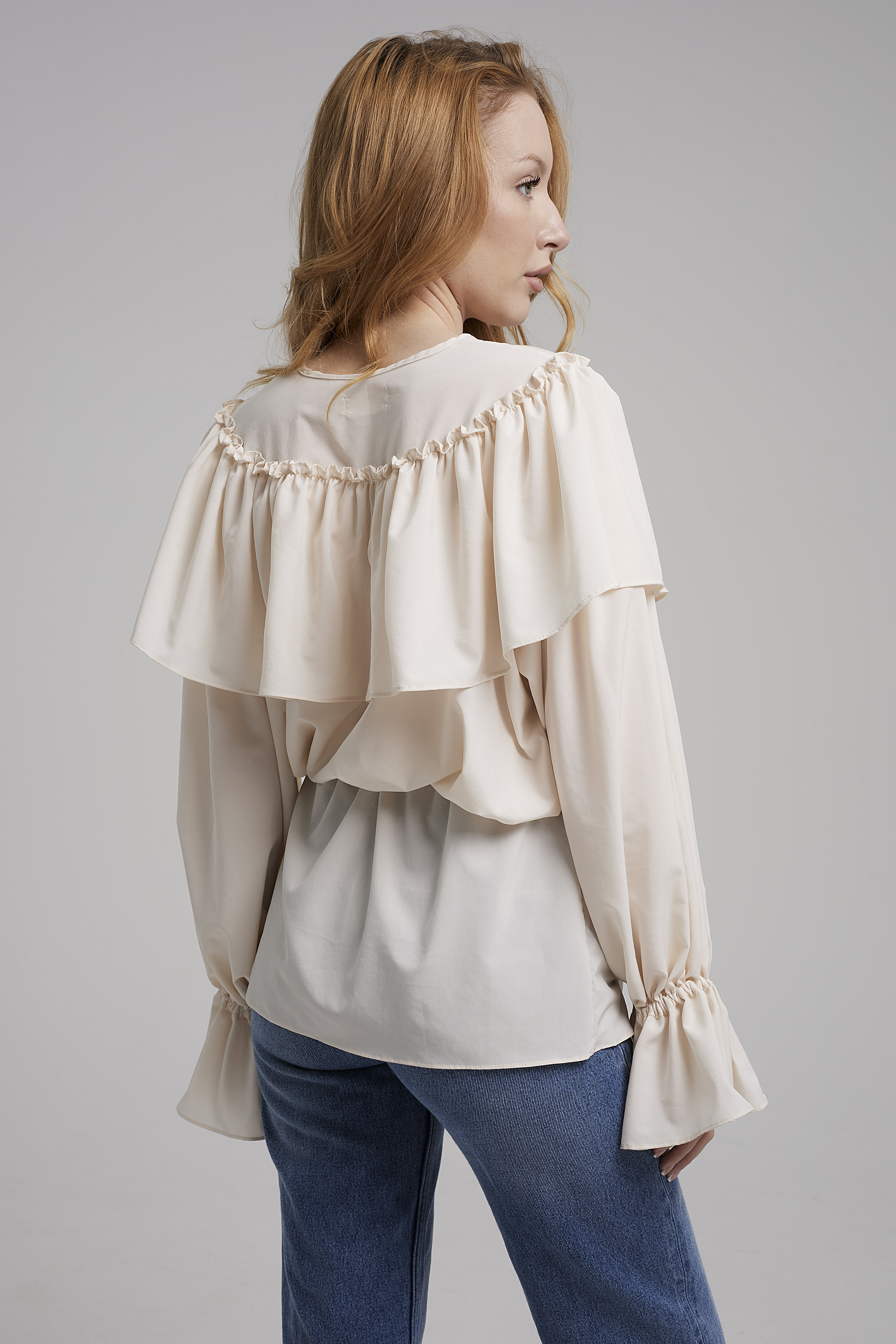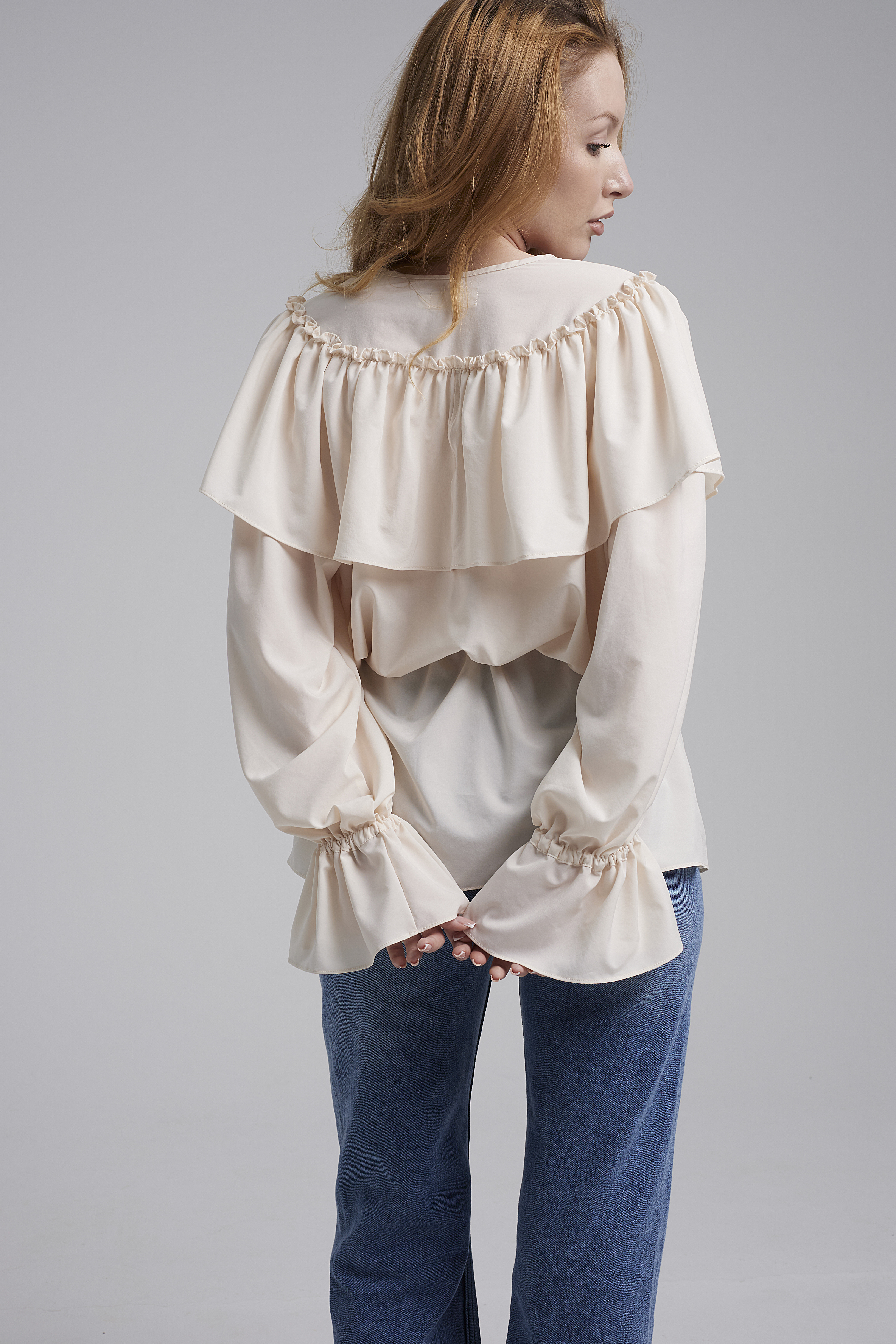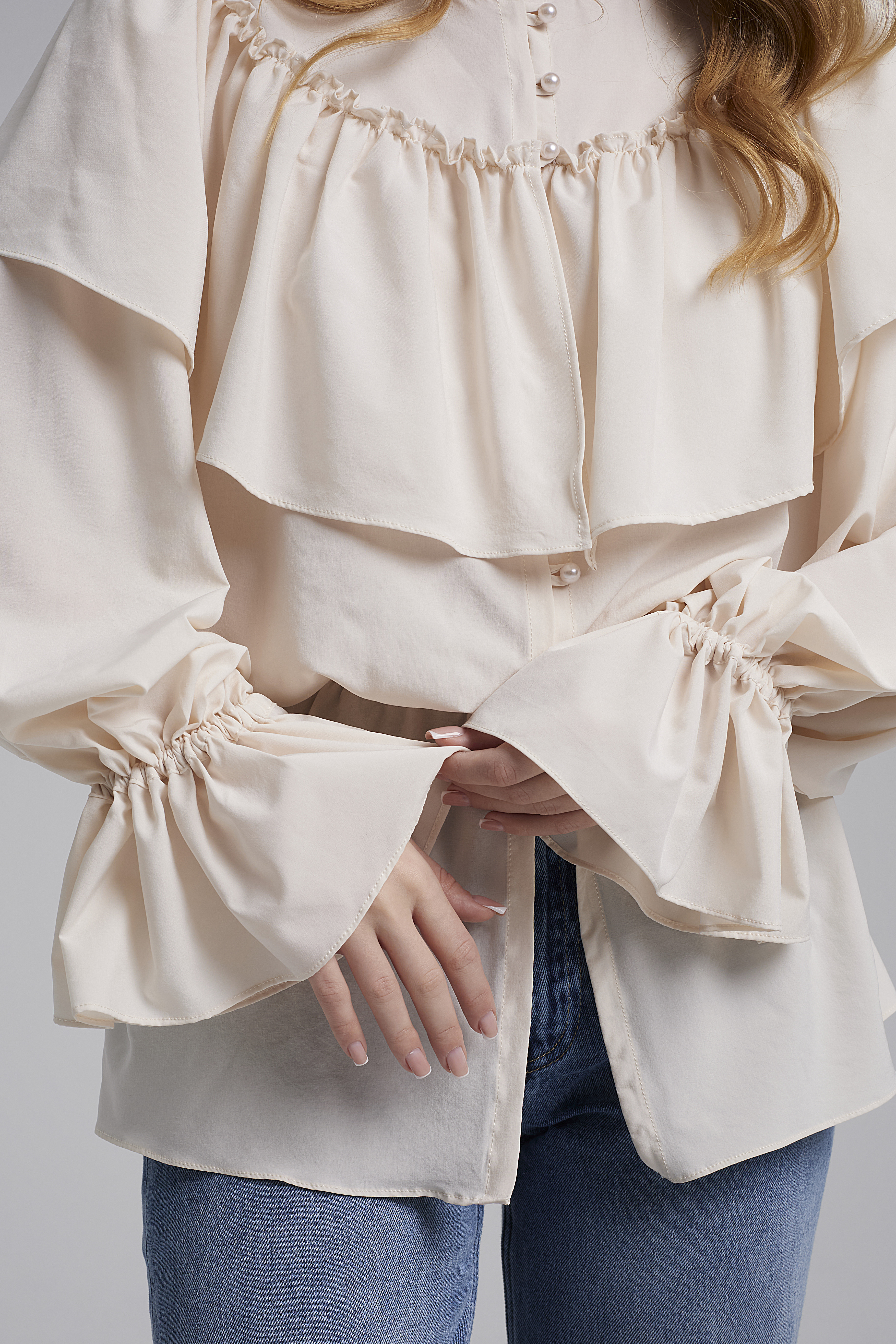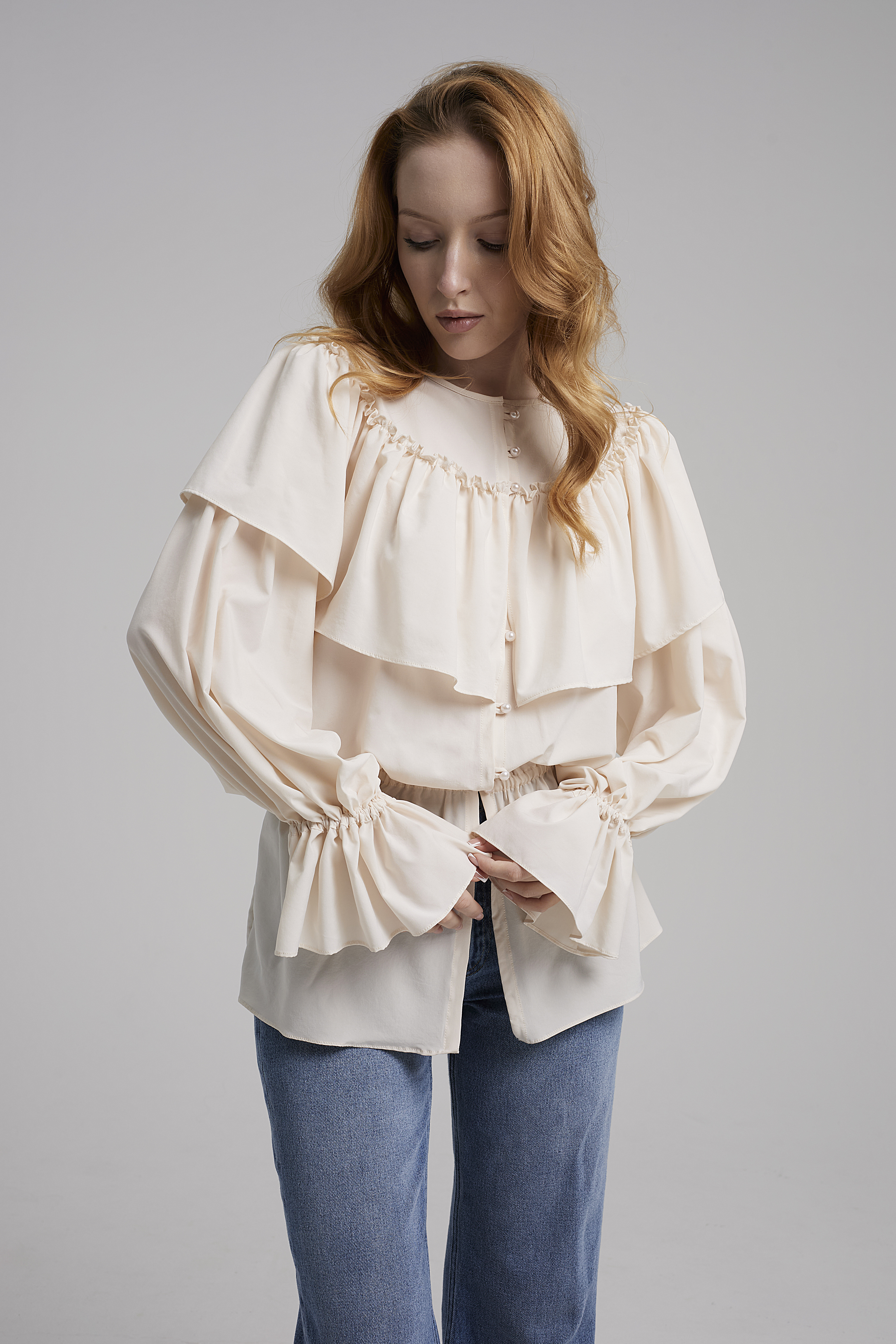 Молочный цвет айвори, легкая ткань, жемчужные пуговицы.