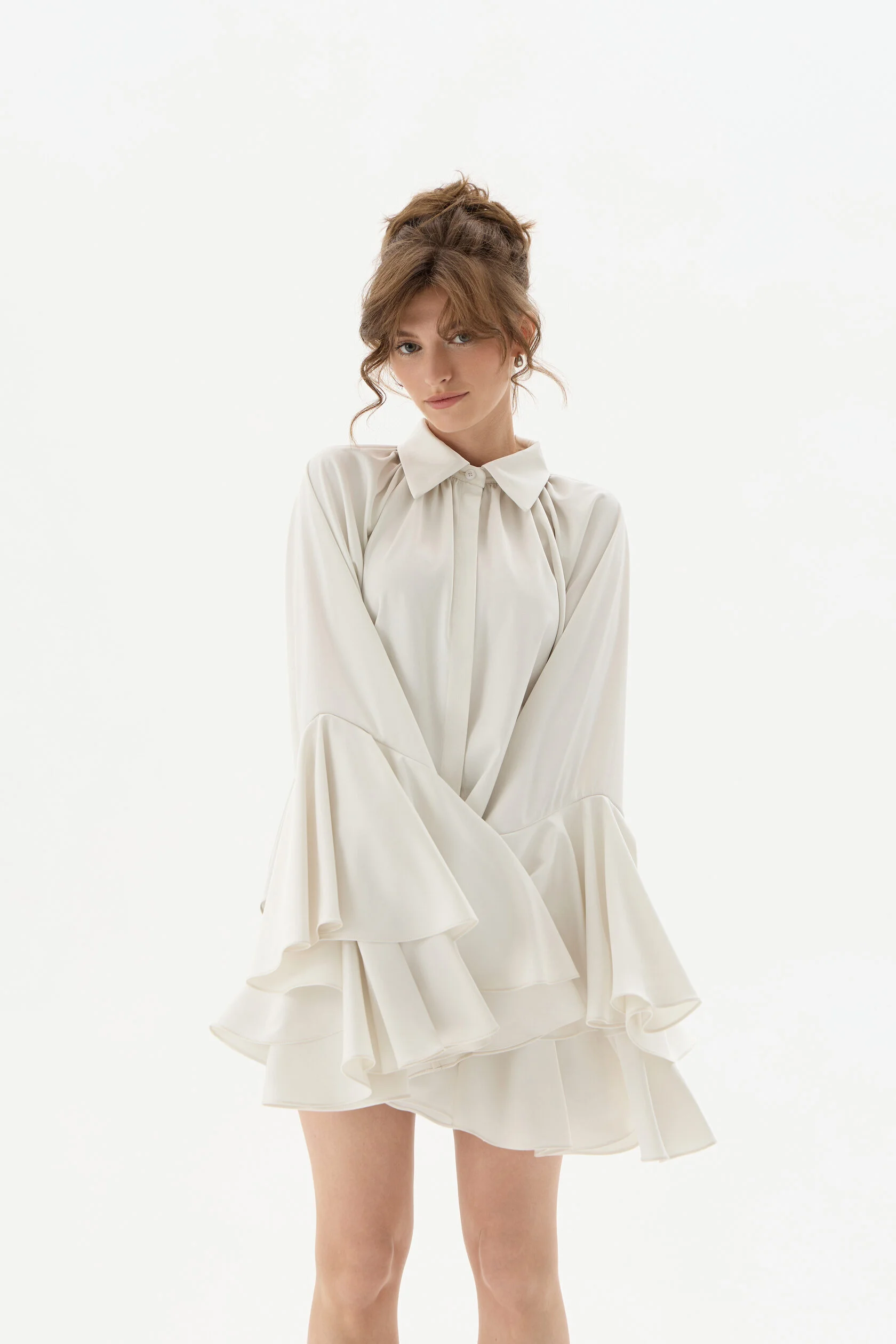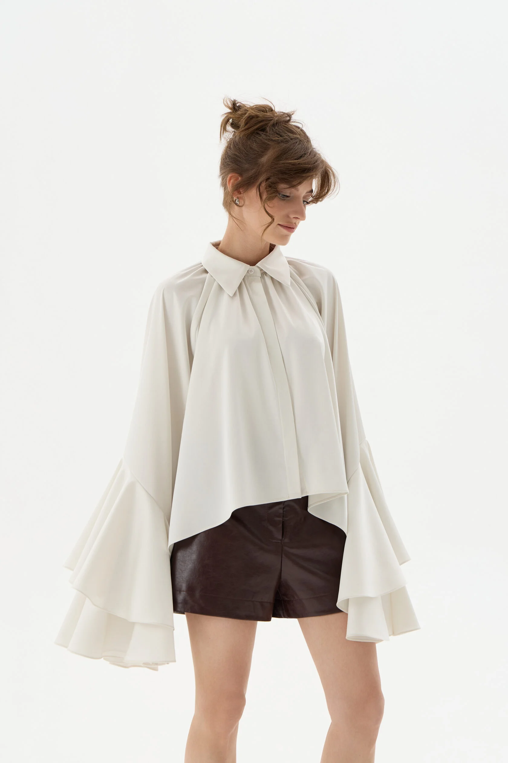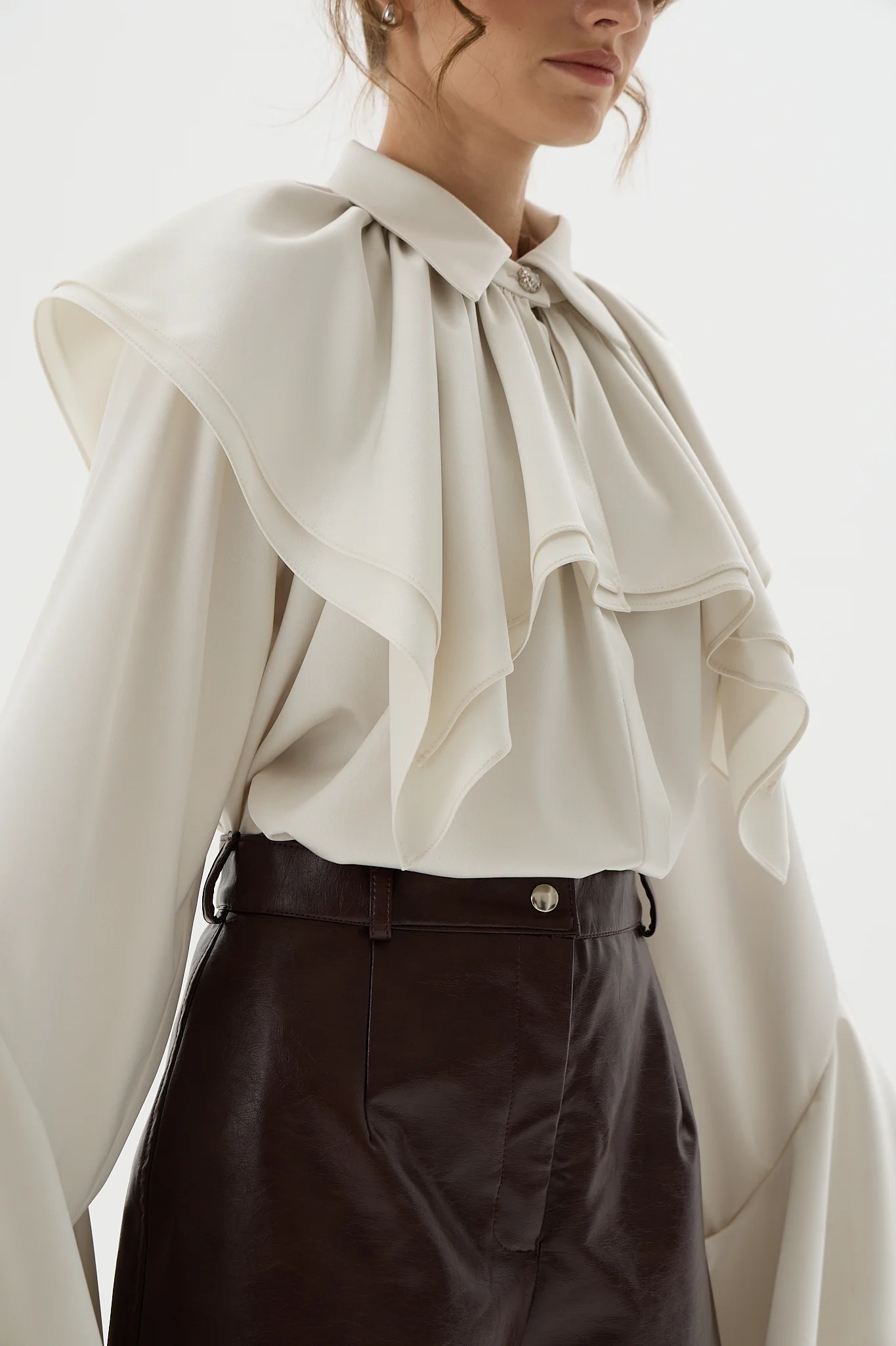 Атласная блуза с акцентными рукавами из рюш в новом цвете.