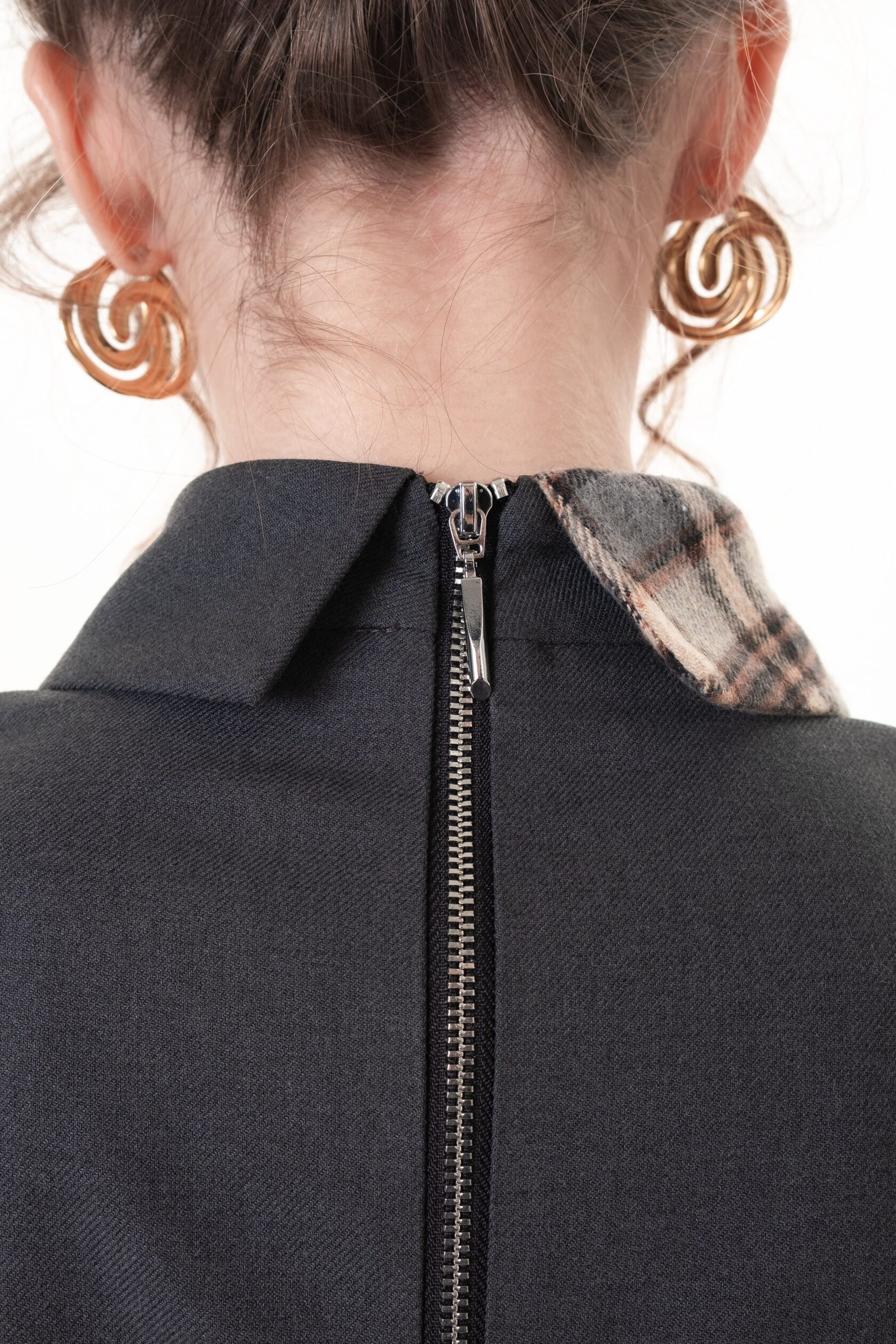 Акцентом в изделии является клетчатый воротничок и металическая застежка-молния по всей длине спинки.