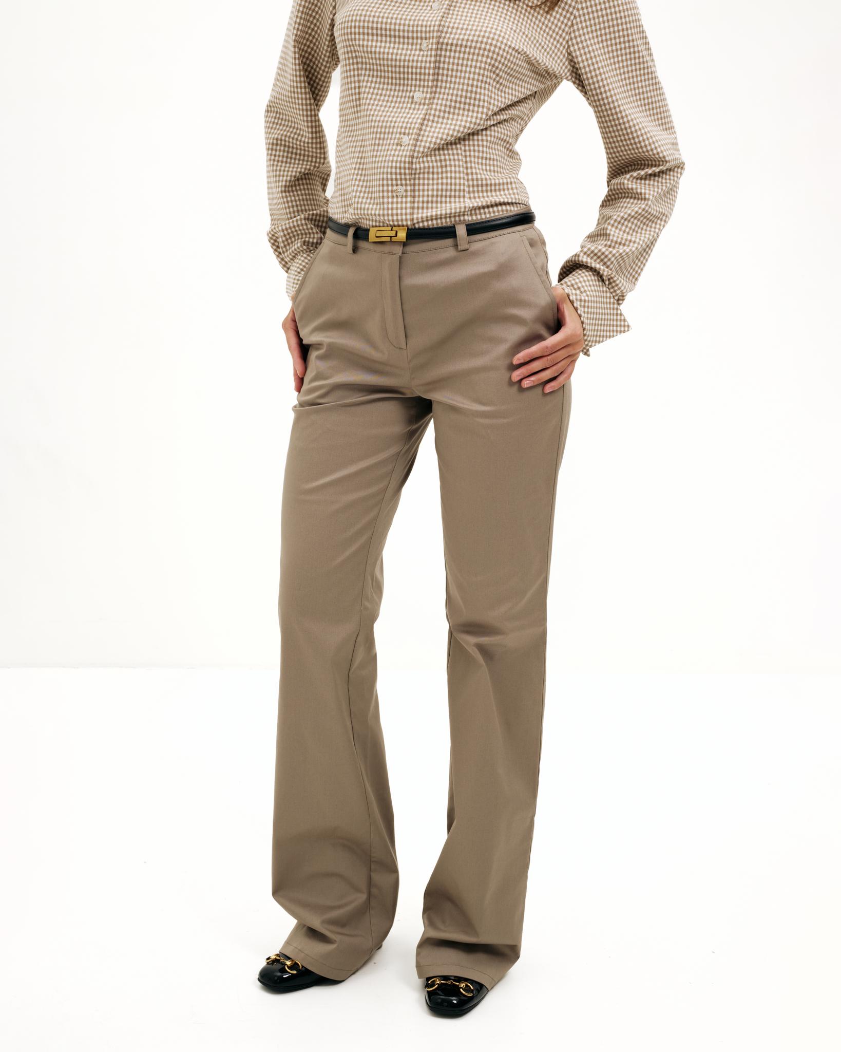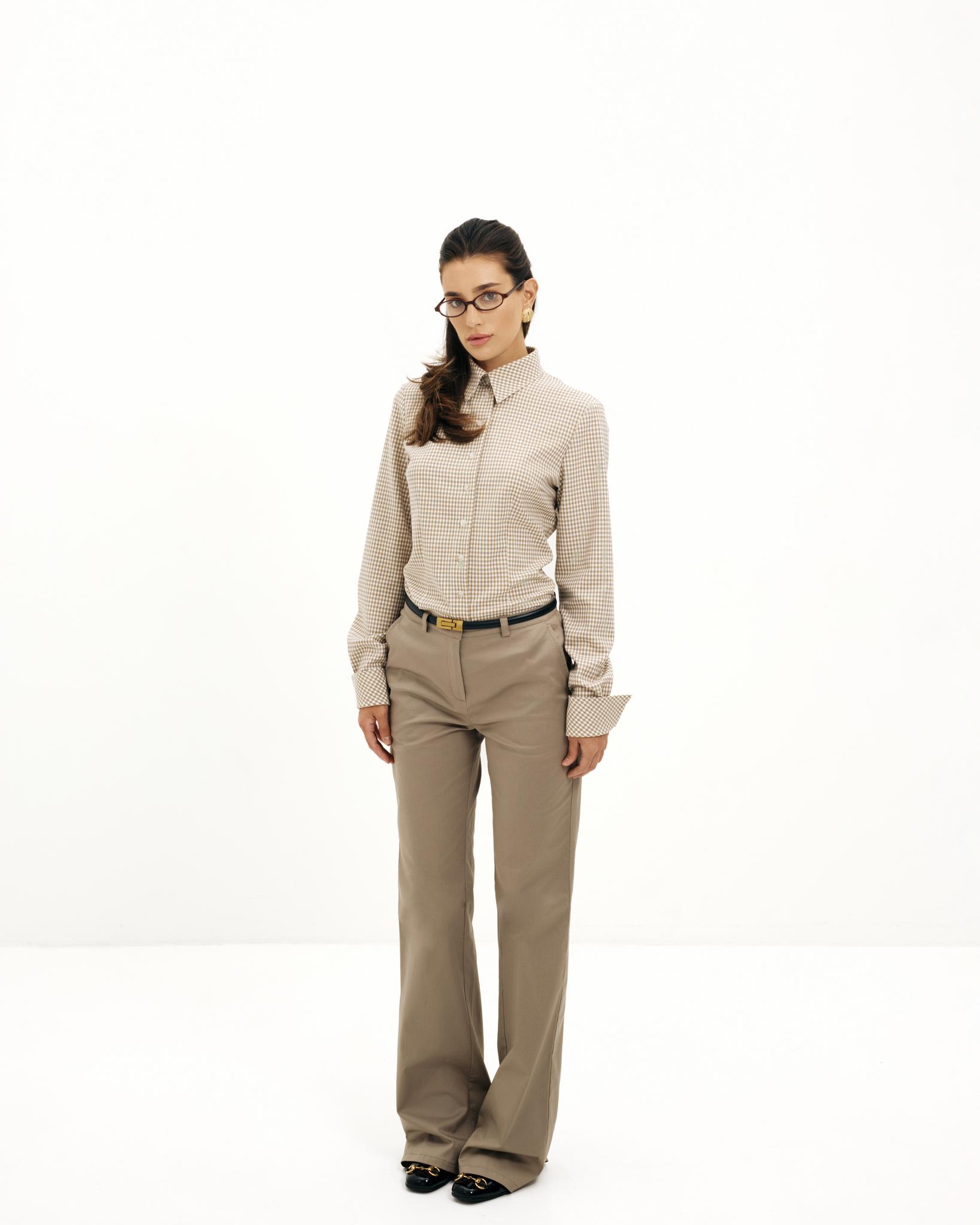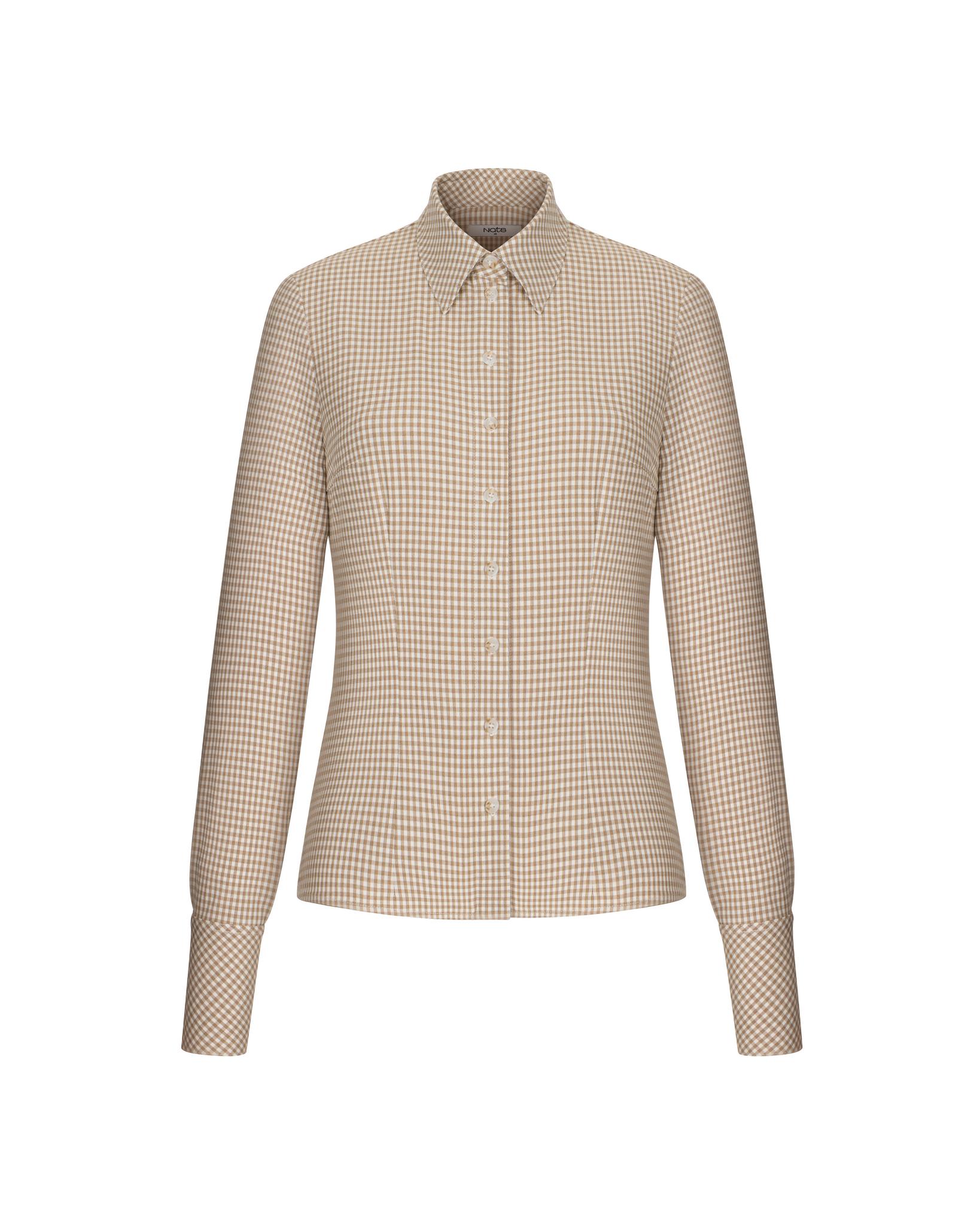 Приталенный силуэт, вытачки на груди и талии, плотные и строгие удлиненные манжеты, двойная кокетка на спине и классический воротник.