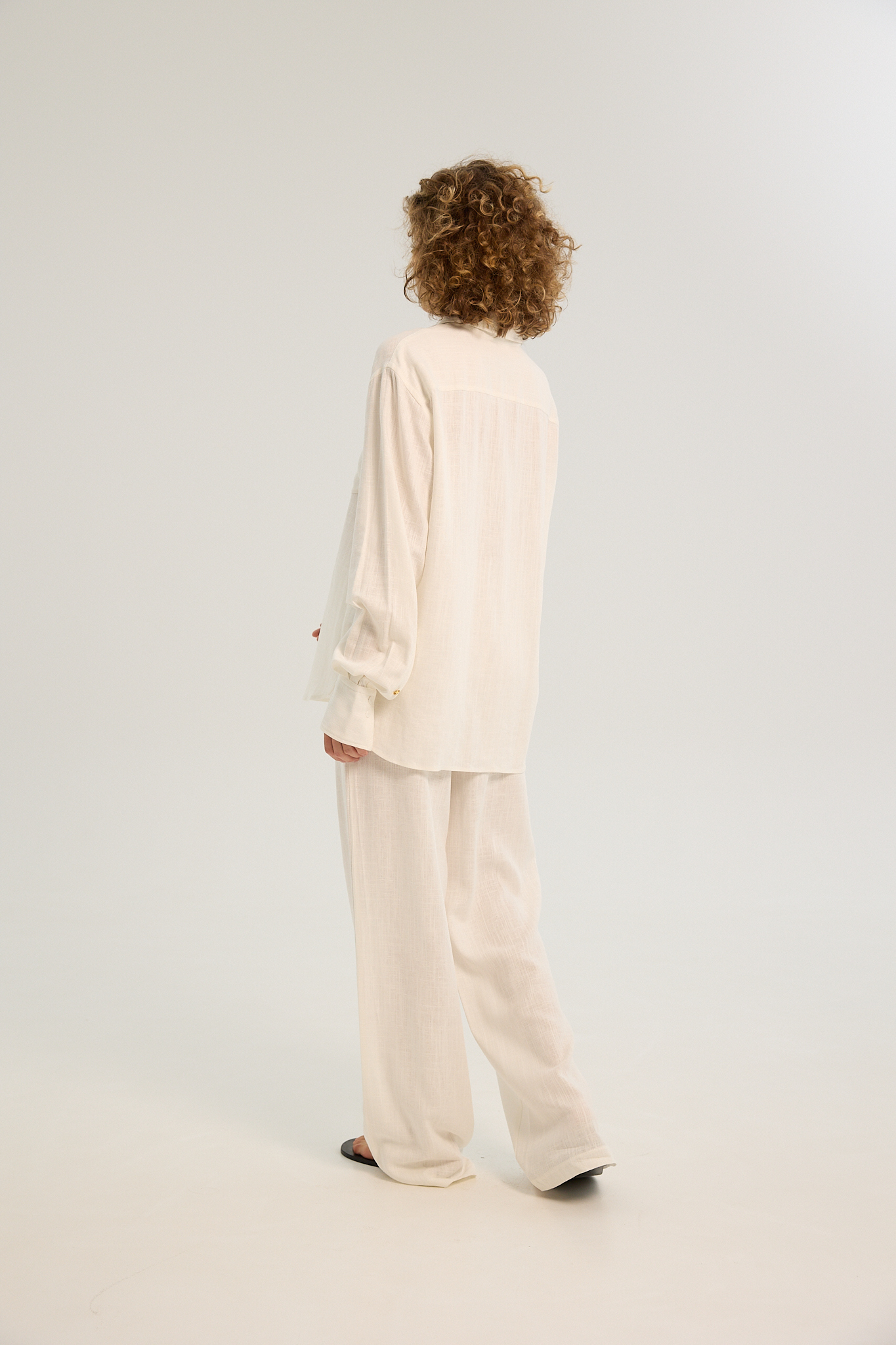 Рубашка прямого силуэта из фактурной вискозы с разрезами по бокам. Застежка на пуговицы, свободный рукав с имитацией манжета. Можно составить комплект с брюками из такой же ткани. Состав: 80% вискоза 20% п/э Уход:  Бережная стирка при температуре не выше 30`C, барабанная сушка...