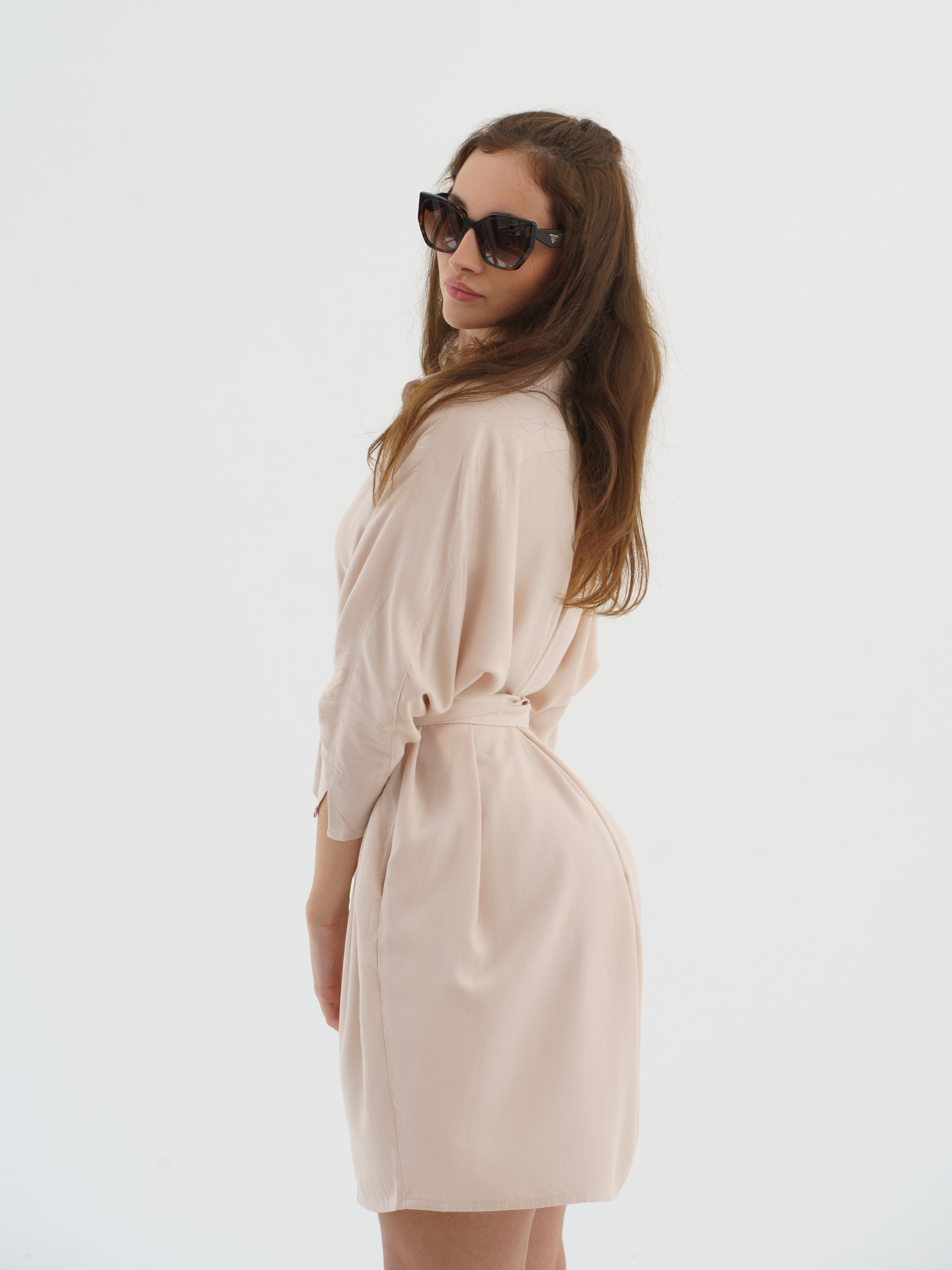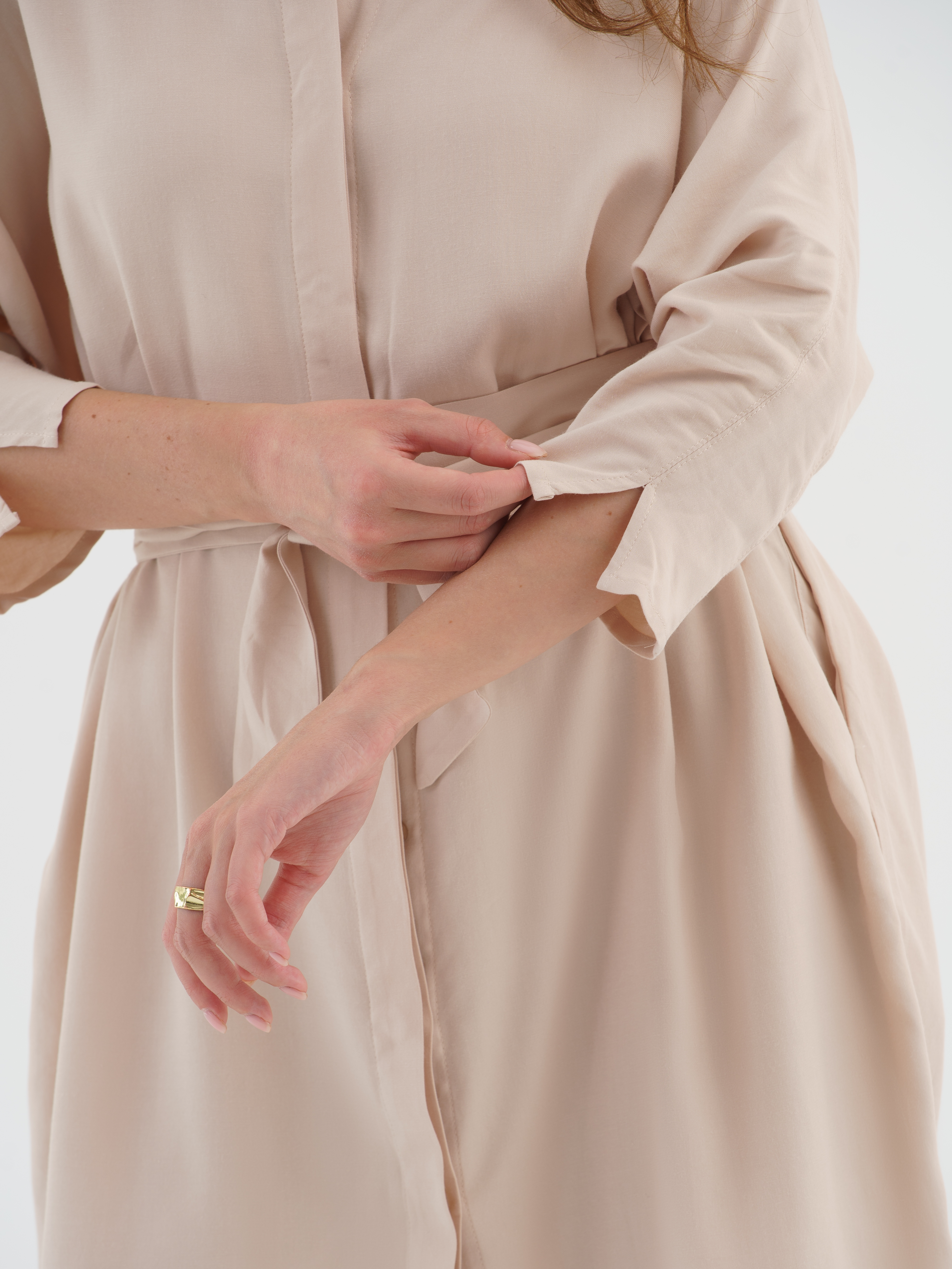 Пояс в комплекте: длинный, позволяет завязывать разными способами — подчёркивает талию, создаёт женственный силуэт или оставляет расслабленным