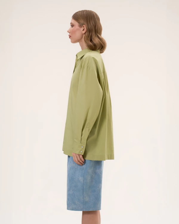 Рубашка в стиле oversize. Прямой крой, спущенная линия плеча, разрезы в боковых швах. Супатная застежка, два накладных кармана на груди, рукава с патами, позволяющими регулировать их длину. Обмеры готовых изделий: Длина изделия: 77 см (42-44р), 78 см (46-48р), 79 см (50-52р), 80 см (54-56р)...