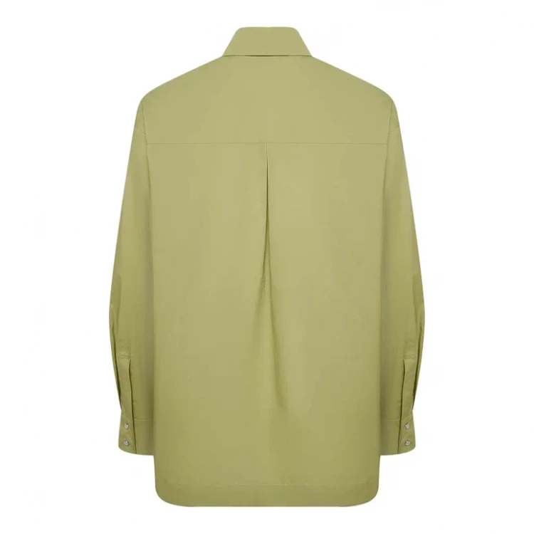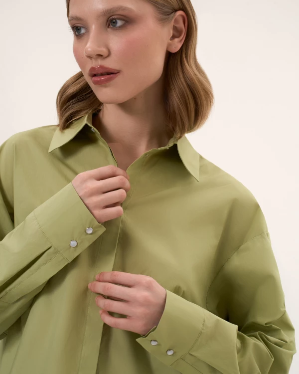 Рубашка свободного кроя Нора из 100%-ного легкого и формудержащего хлопка цвета цветущего миндаля. Украшена кнопкой с переливами лунного камня по горловине и рукавам. Незаметная застежка на внутенние пуговицы