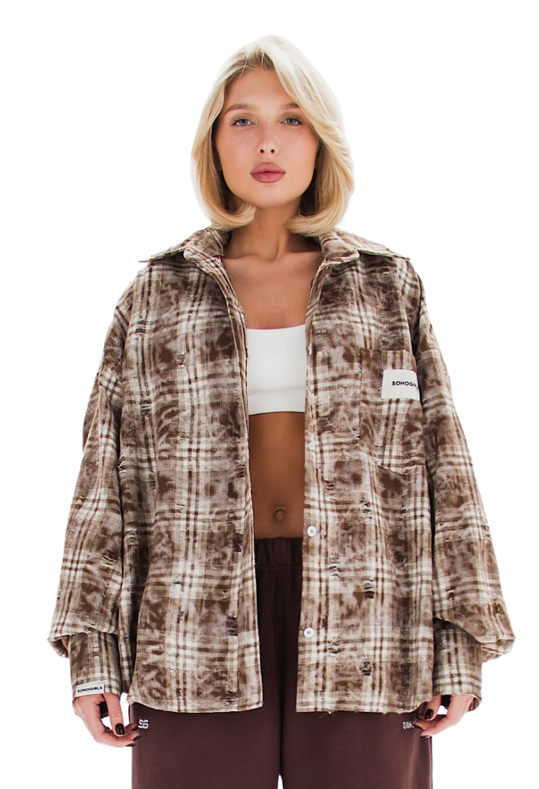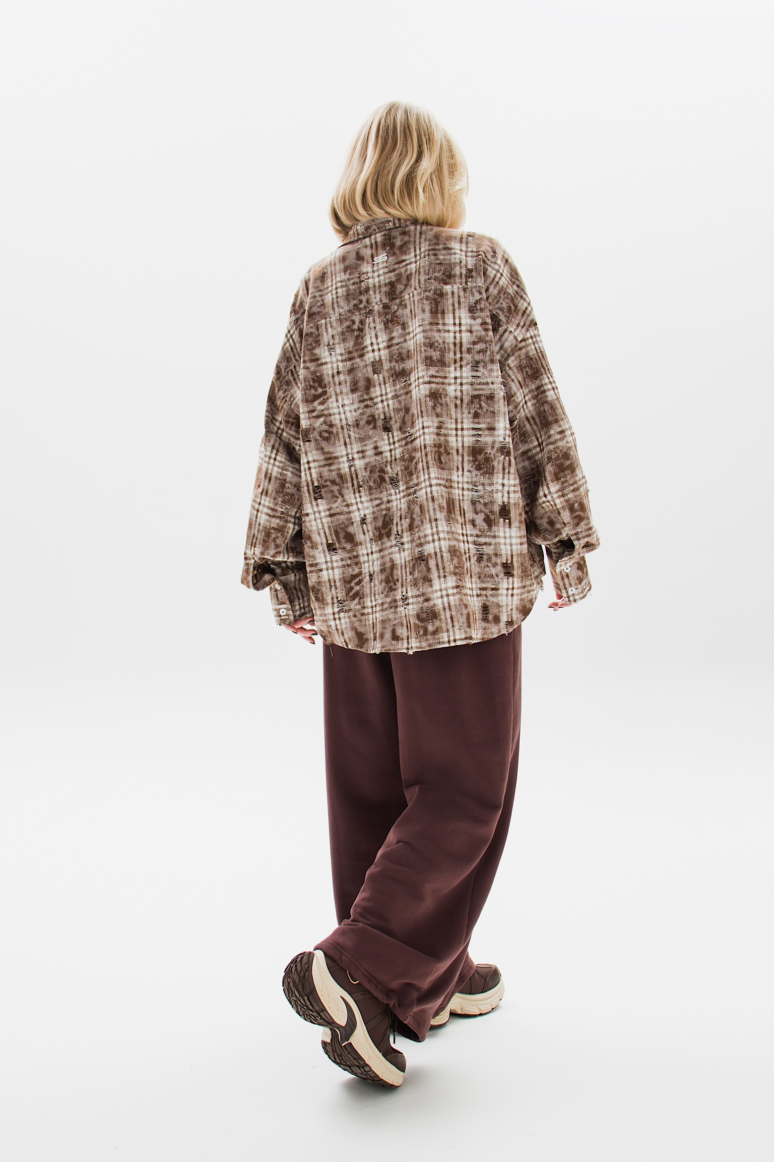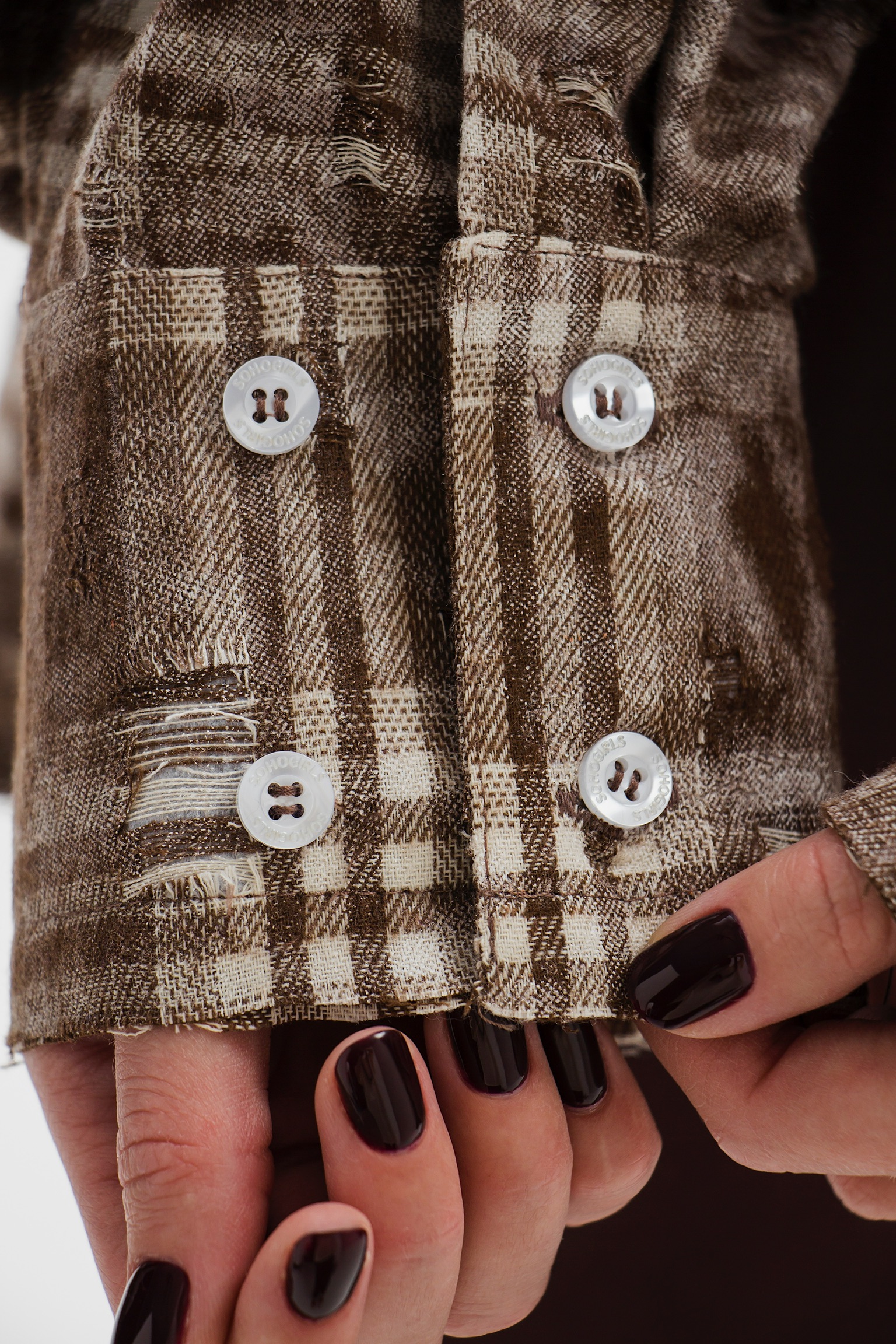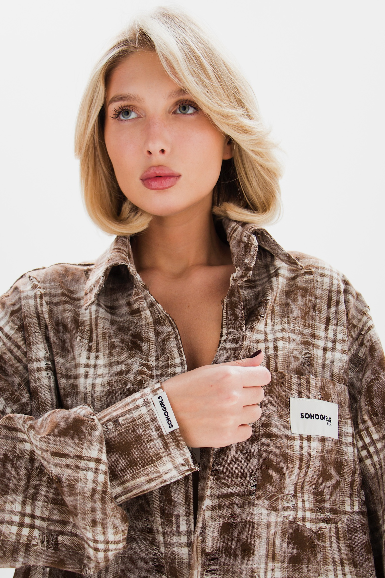 Рубашка в клетку с эффектом легкой потертости в свободном крое и со спущенной линией плеч.