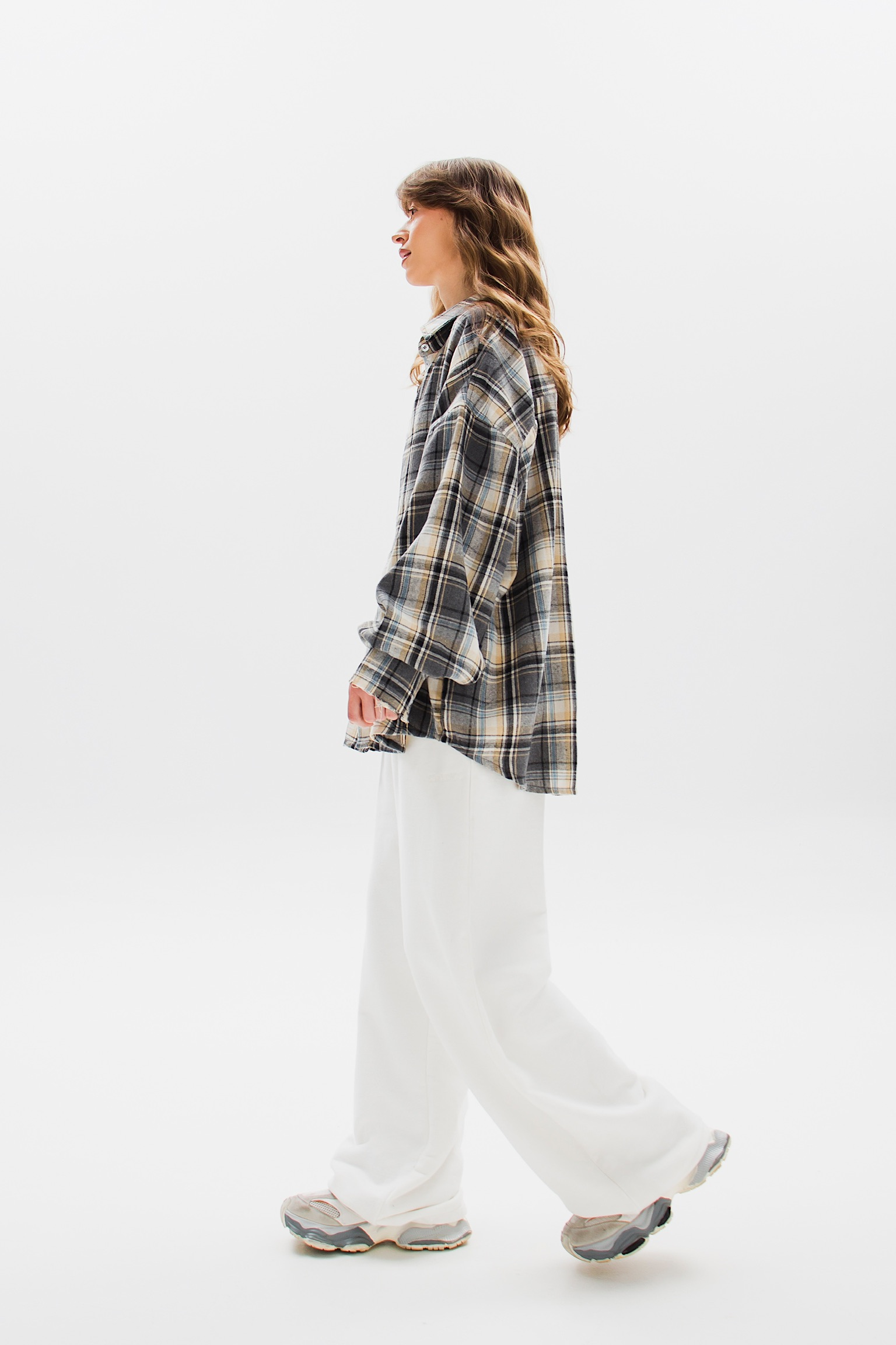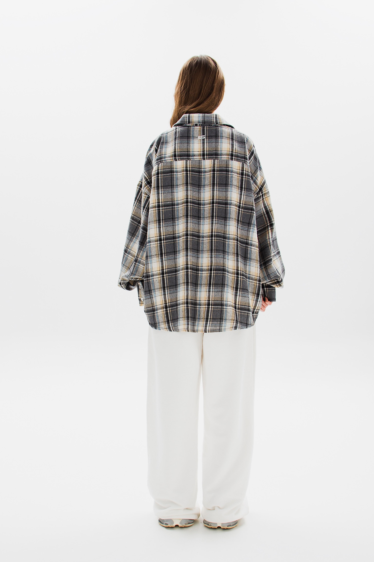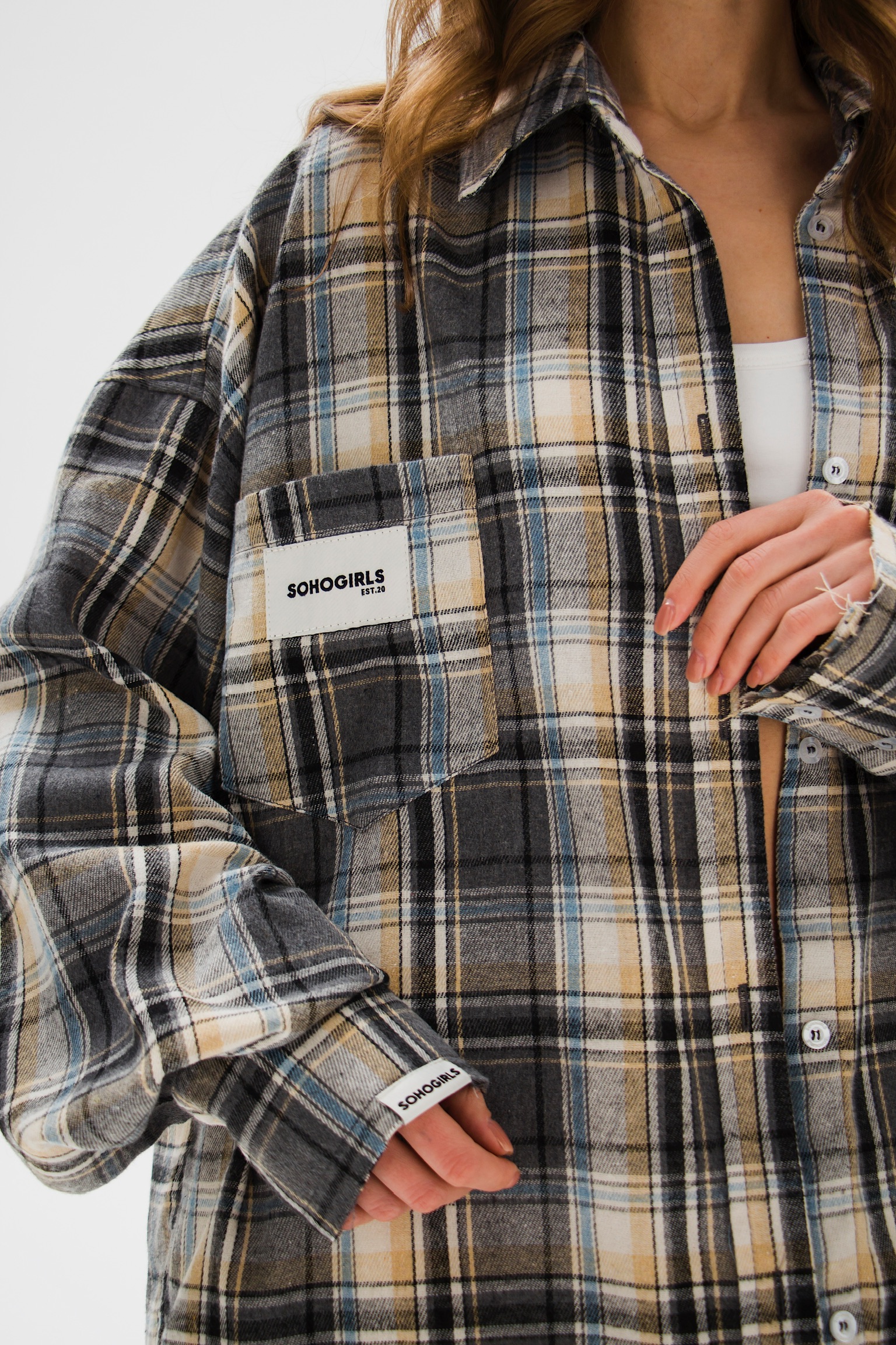 Рубашка в клетку с эффектом легкой потертости в свободном крое и со спущенной линией плеч.