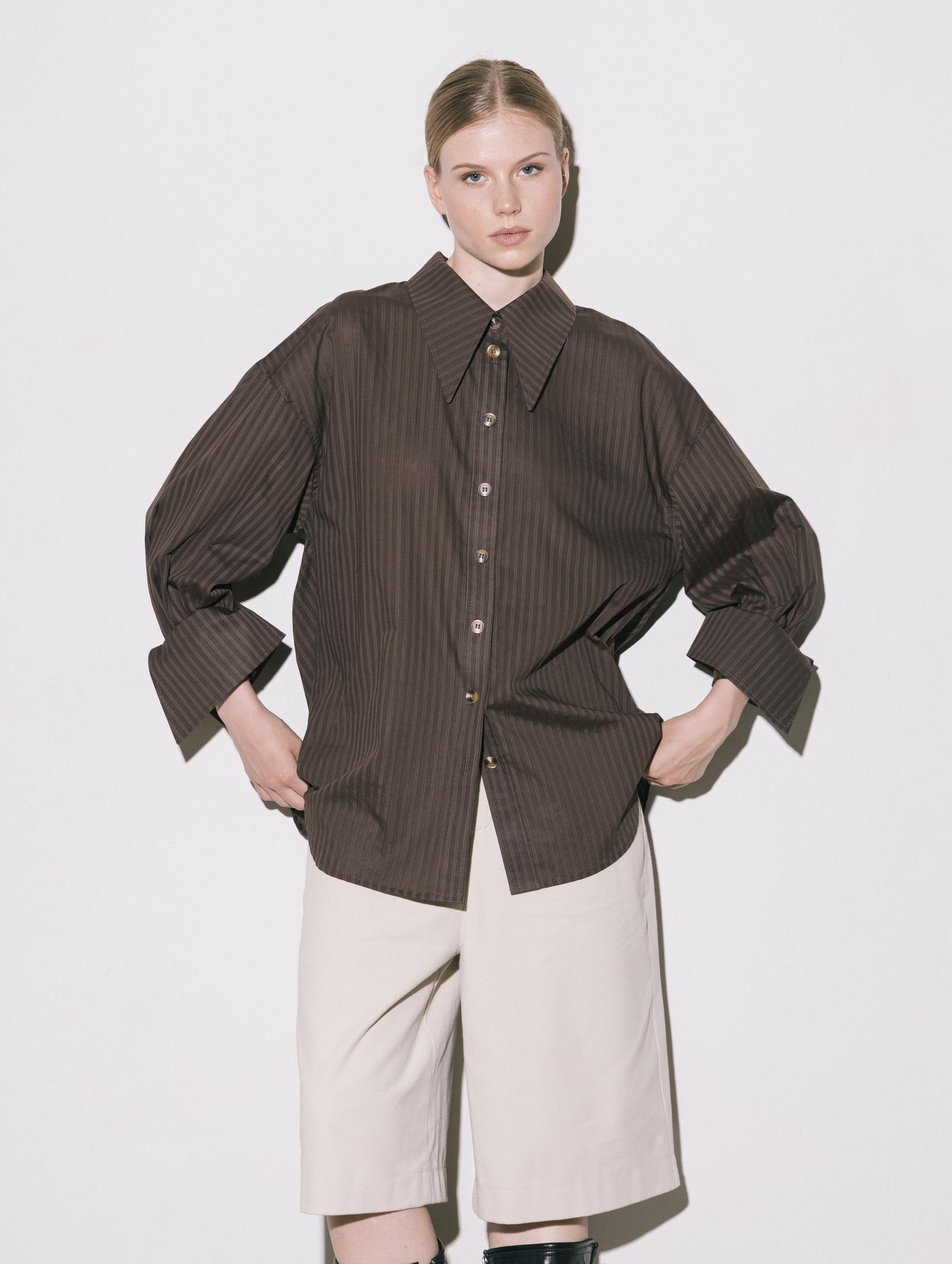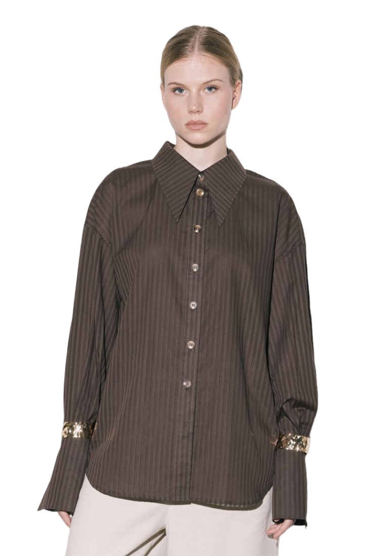 Свободная рубашка с удлиненными манжетами и воротником, на пуговицах, из итальянского 100% хлопка в цвете "горький шоколад".