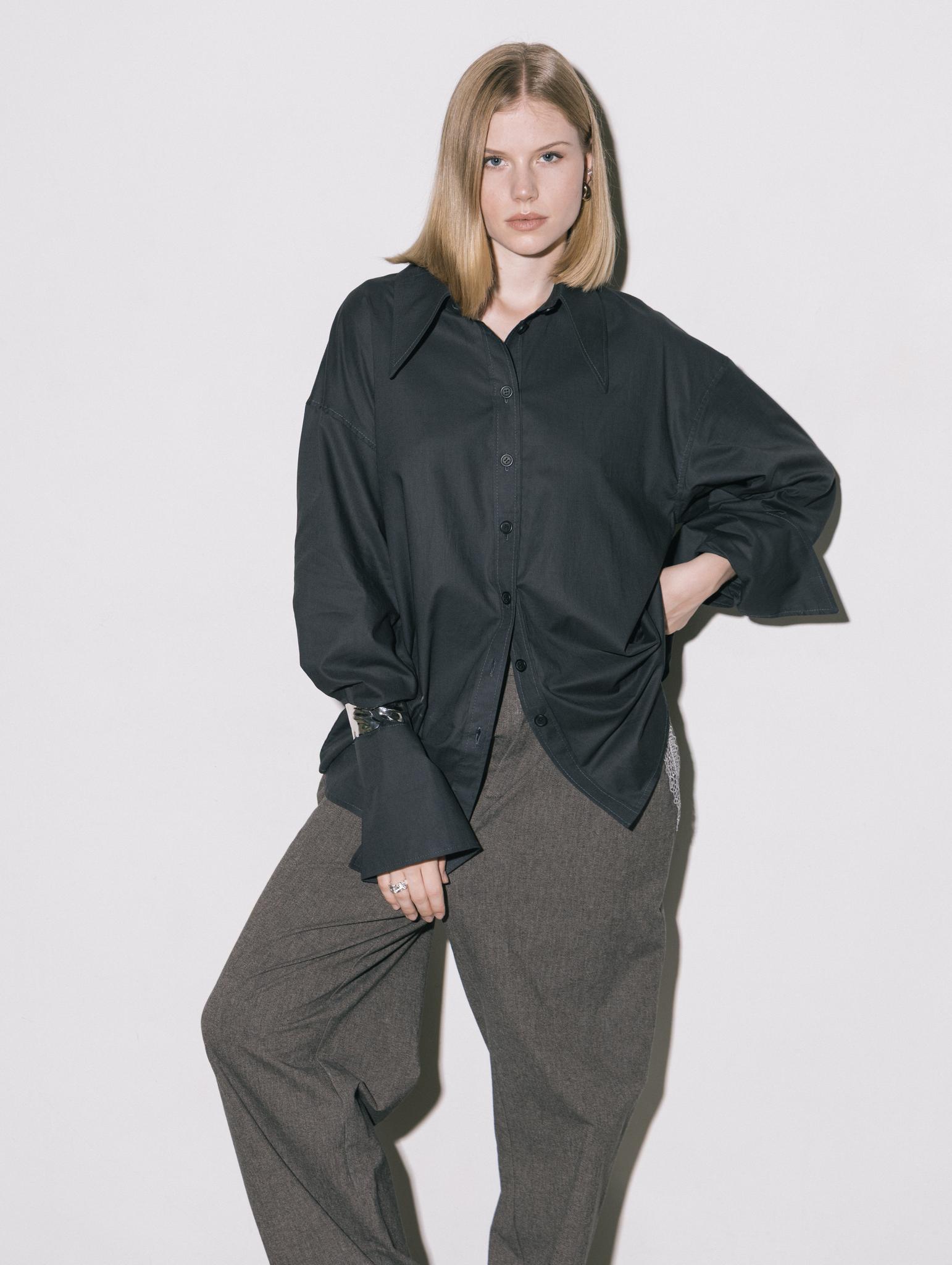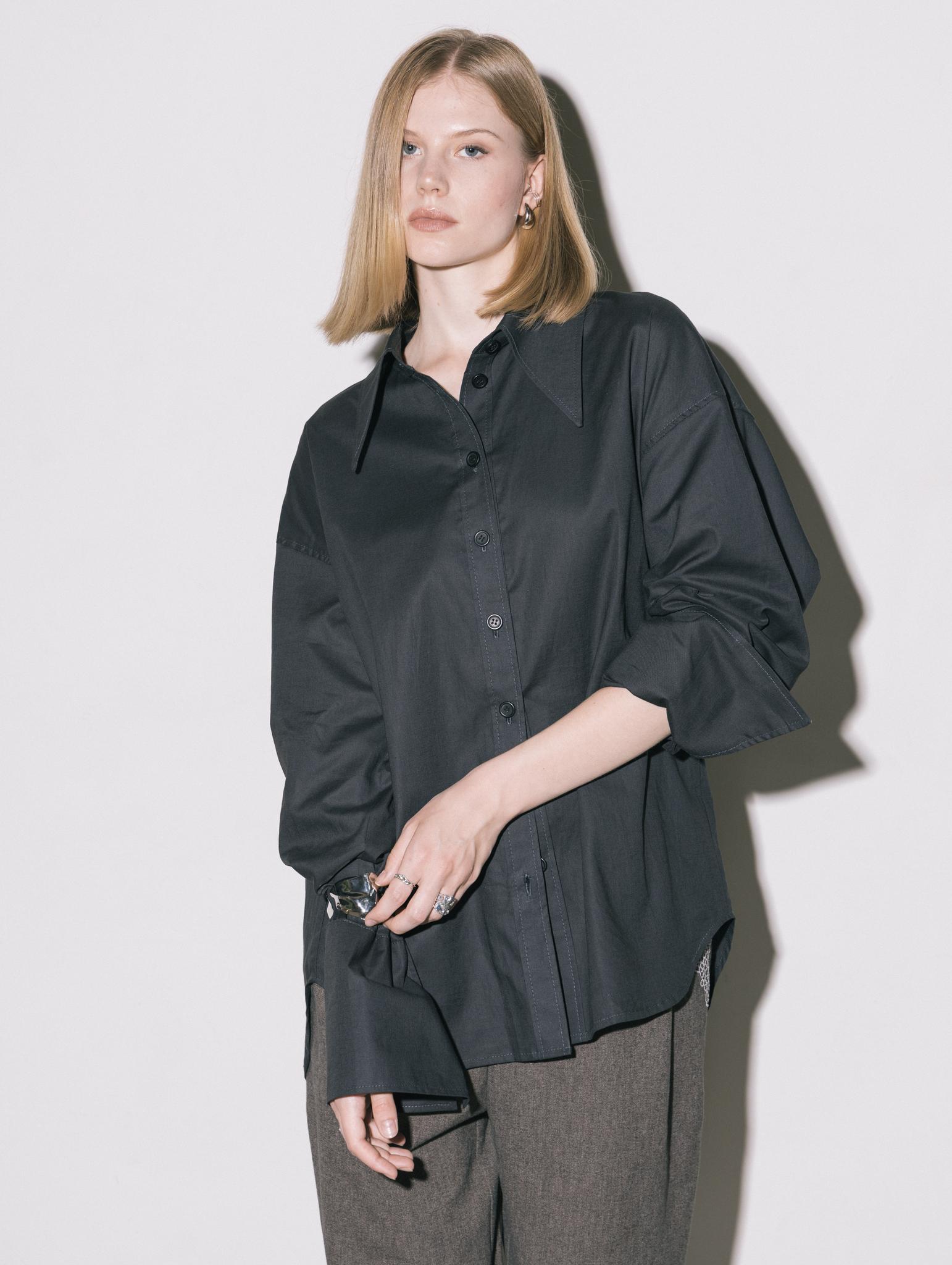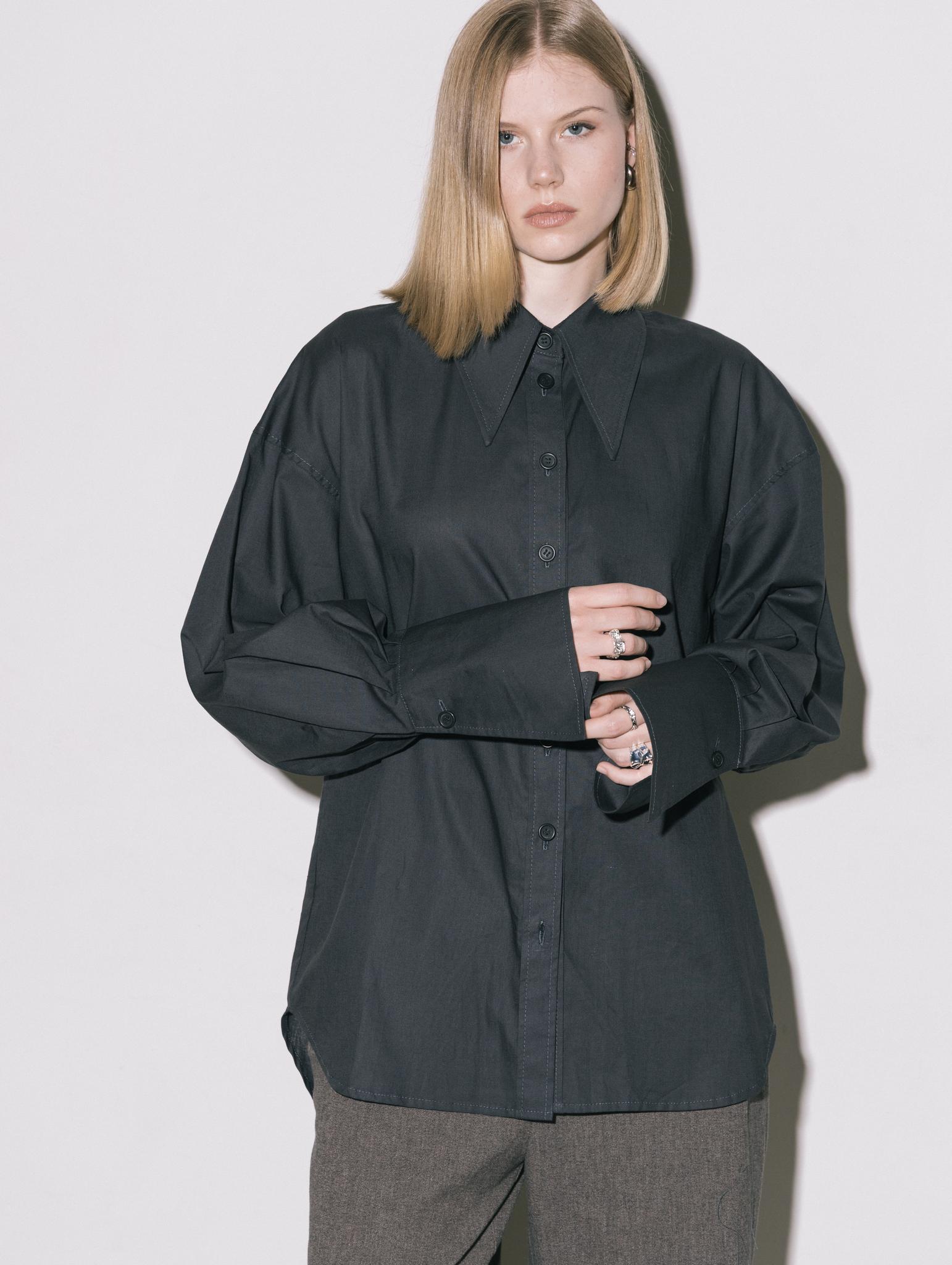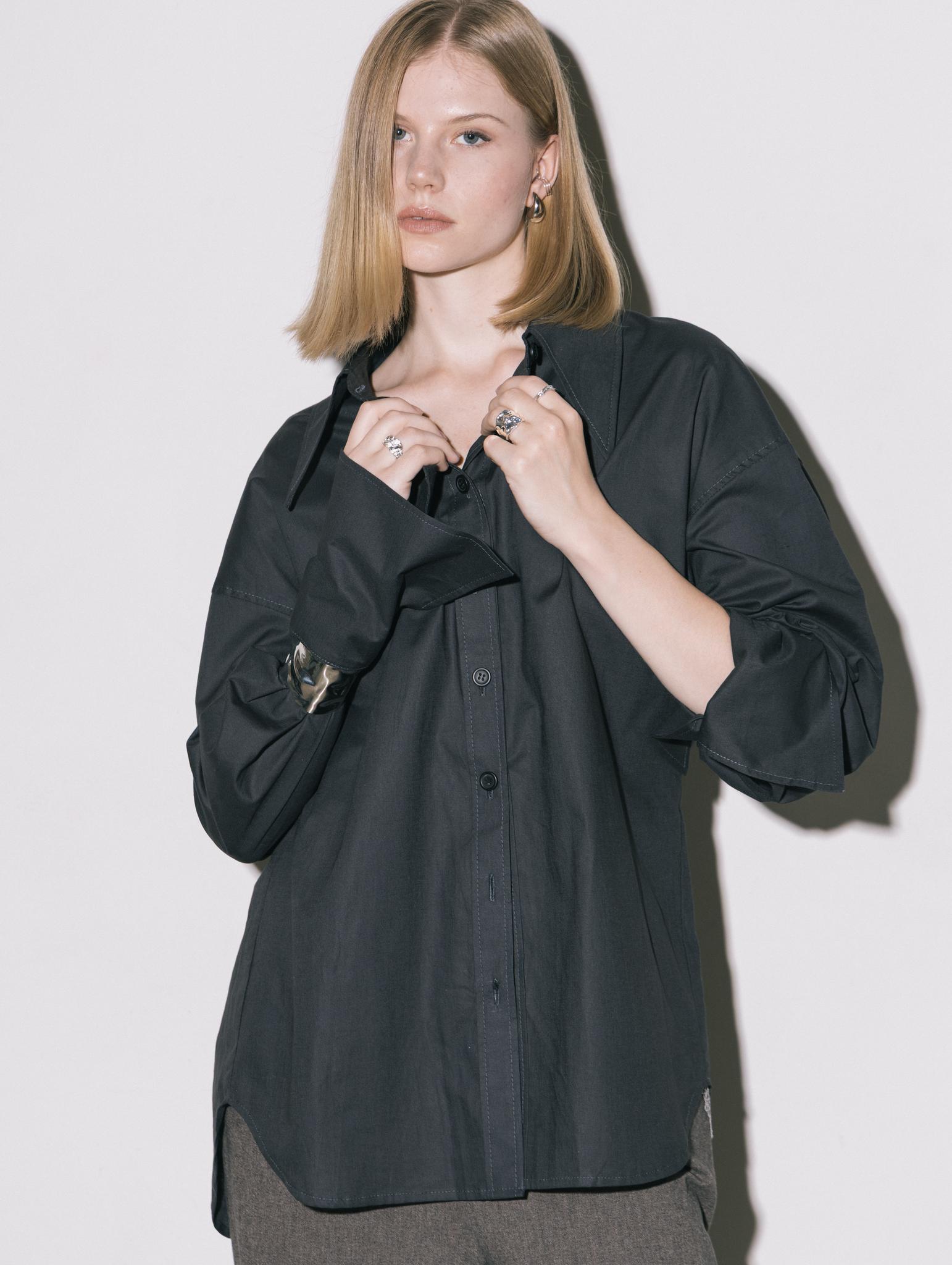 Свободная рубашка с удлиненными манжетами и воротником, на пуговицах, из итальянского 100% хлопка в приглушенно-черном цвете.