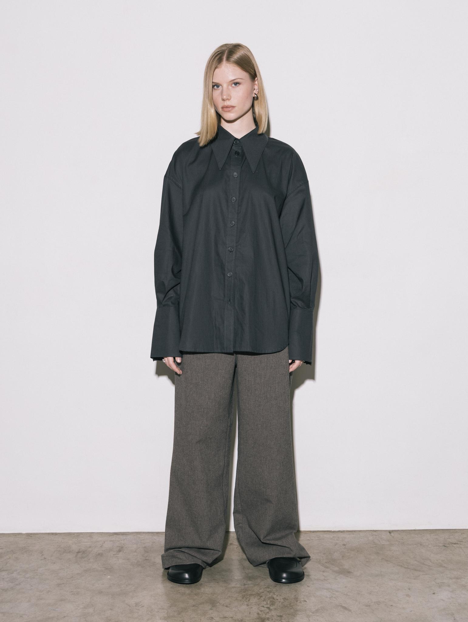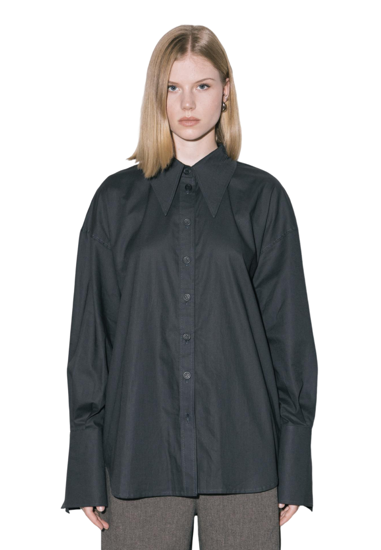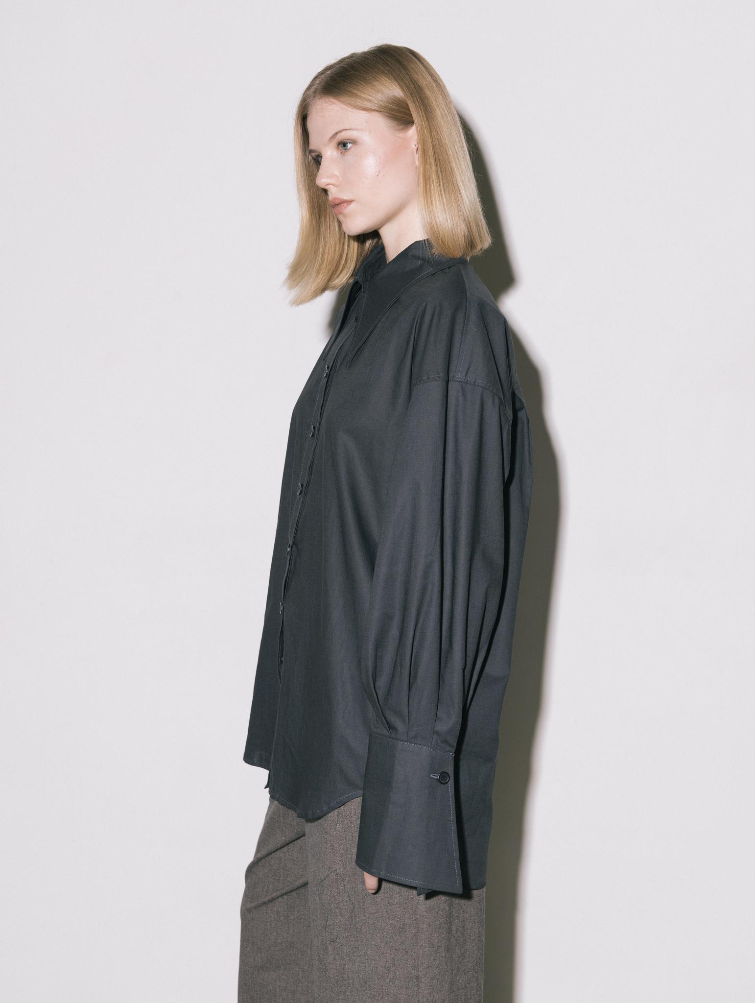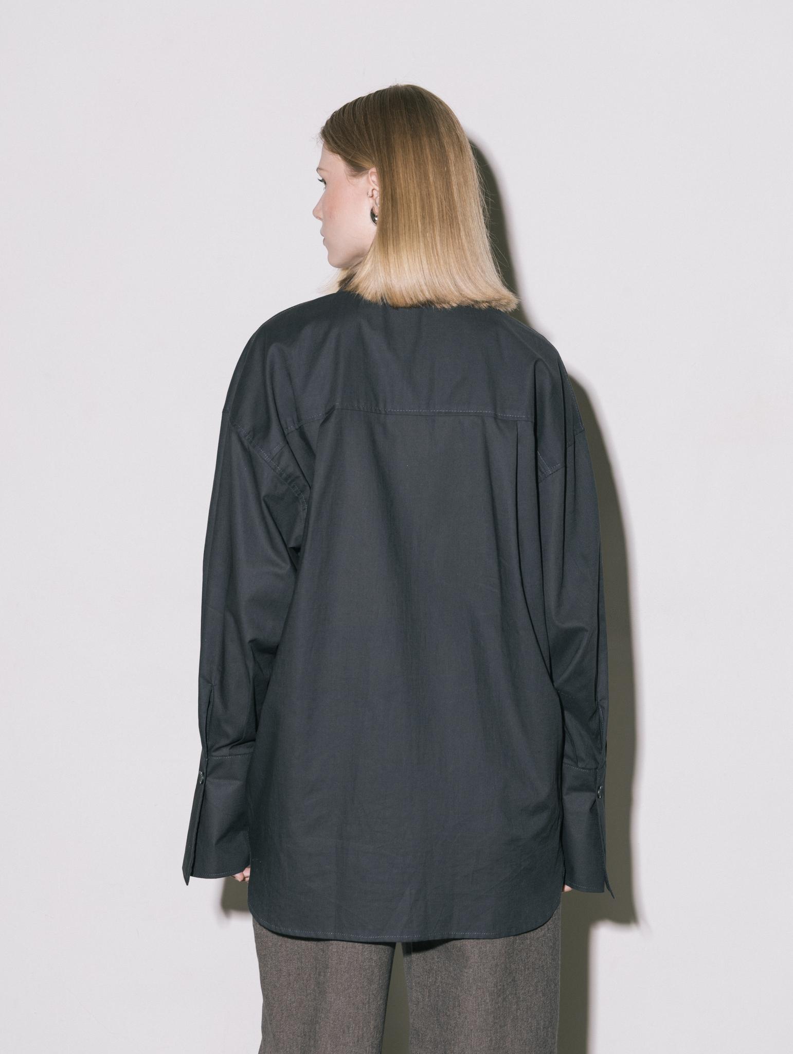 Свободная рубашка с удлиненными манжетами и воротником, на пуговицах, из итальянского 100% хлопка в приглушенно-черном цвете.