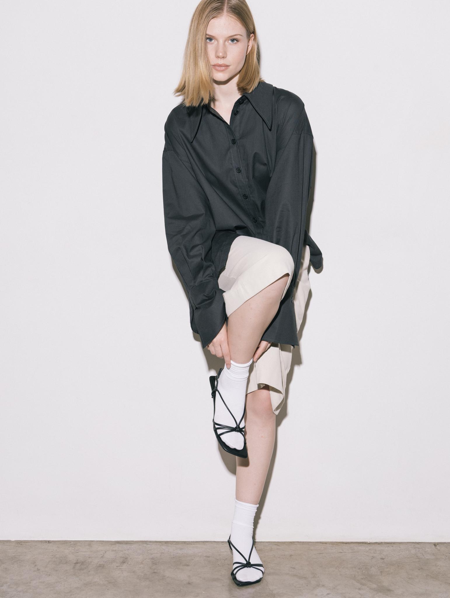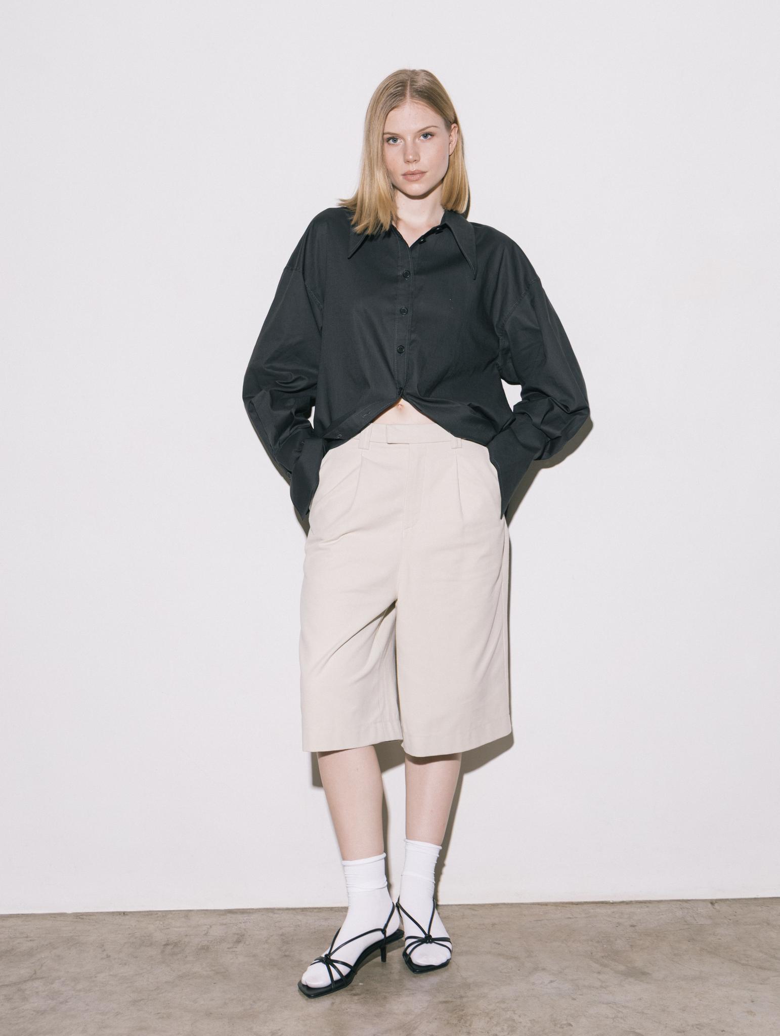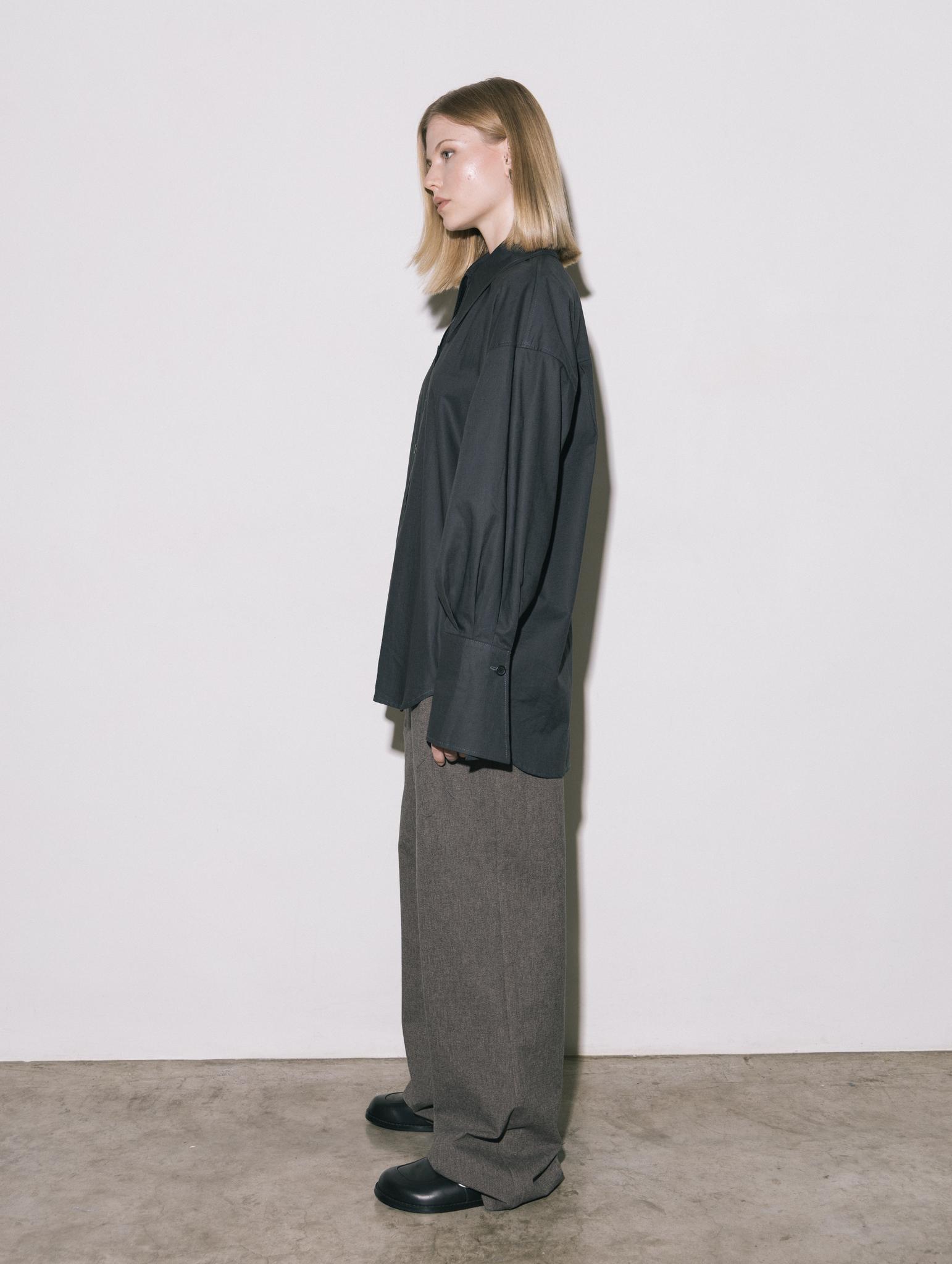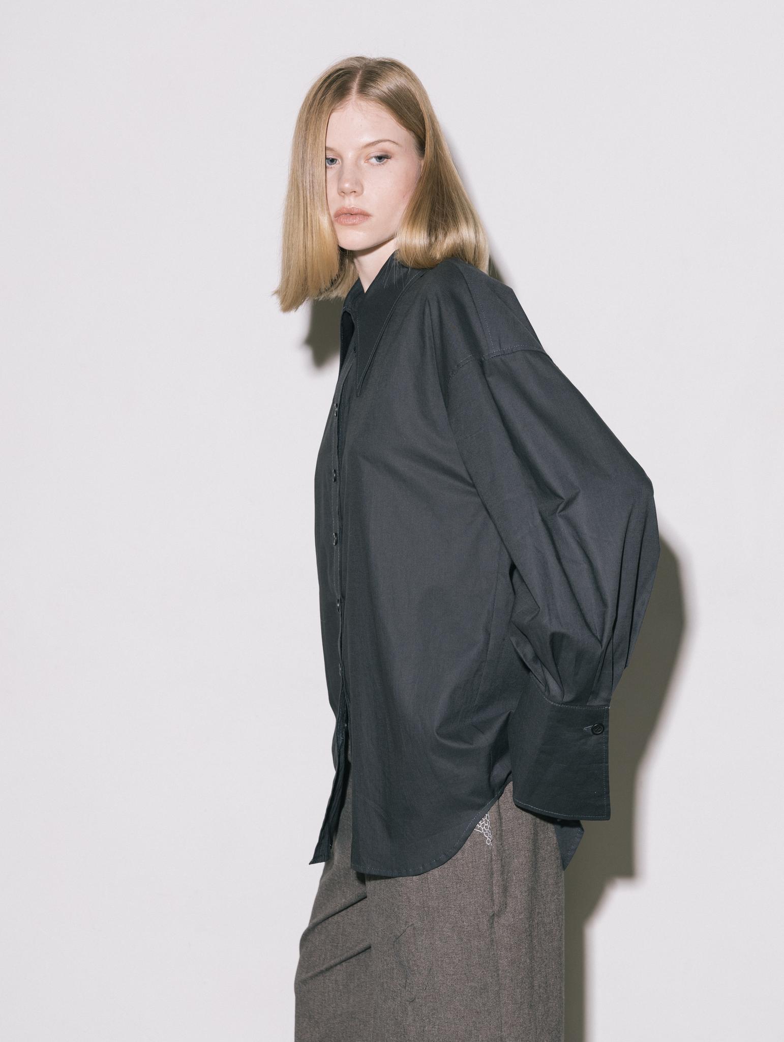 Свободная рубашка с удлиненными манжетами и воротником, на пуговицах, из итальянского 100% хлопка в приглушенно-черном цвете.