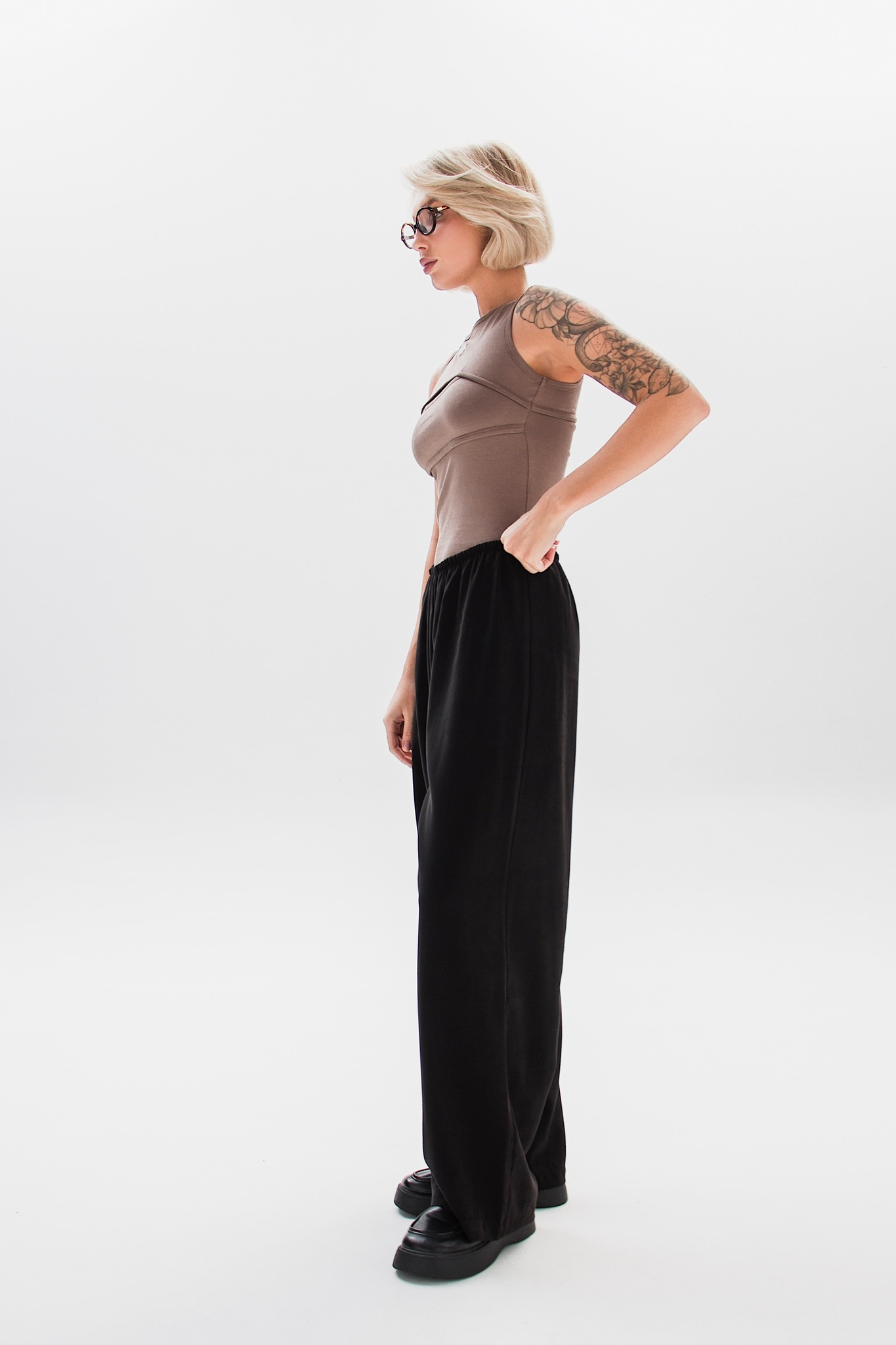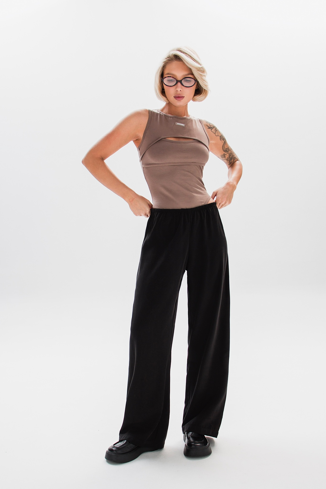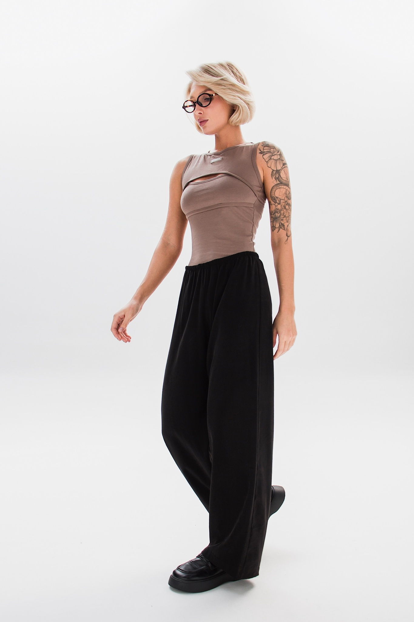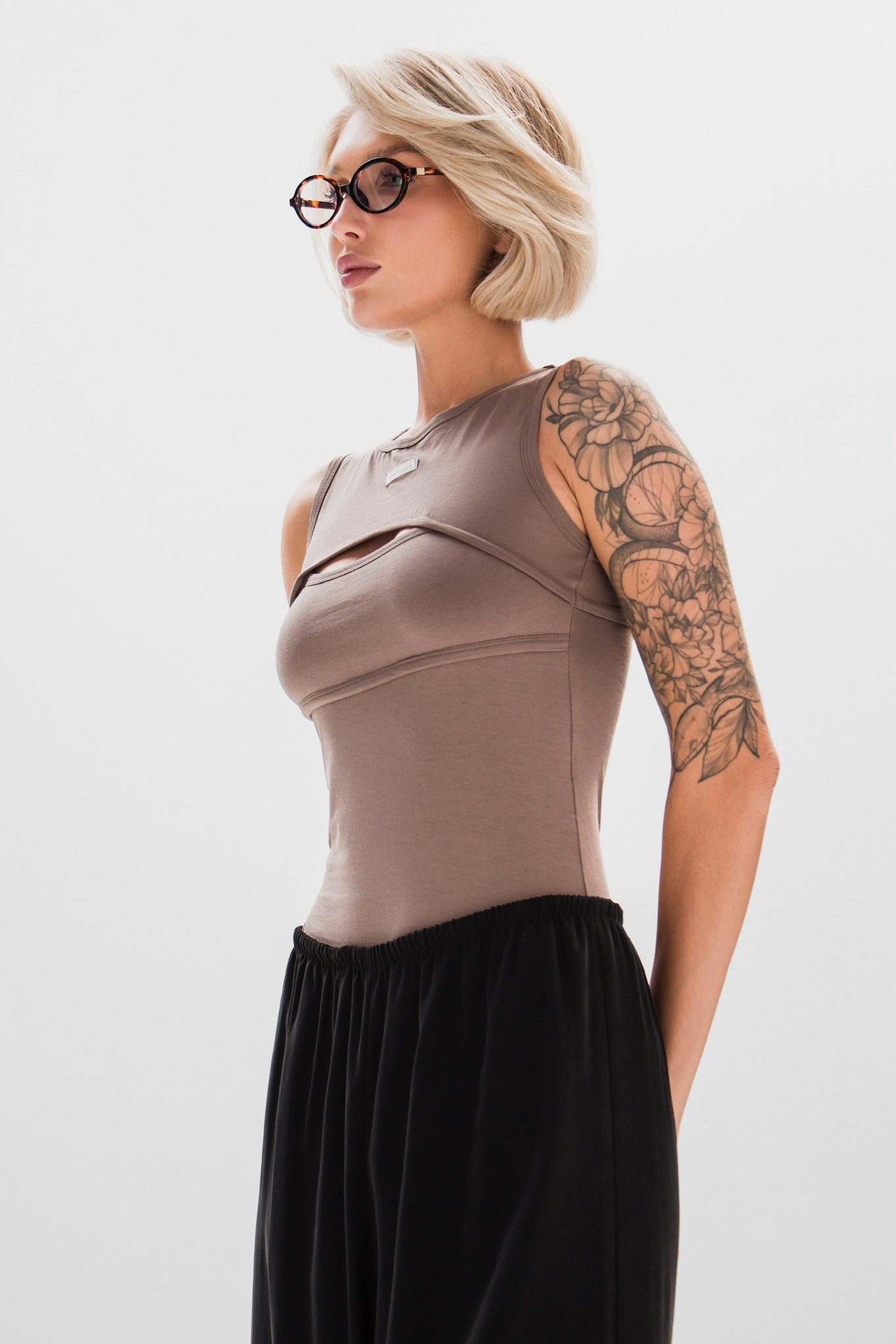 Эффектное боди с оригинальным вырезом на груди и декоративной планкой - идеальный выбор для тех, кто хочет добавить образу немного дерзости.