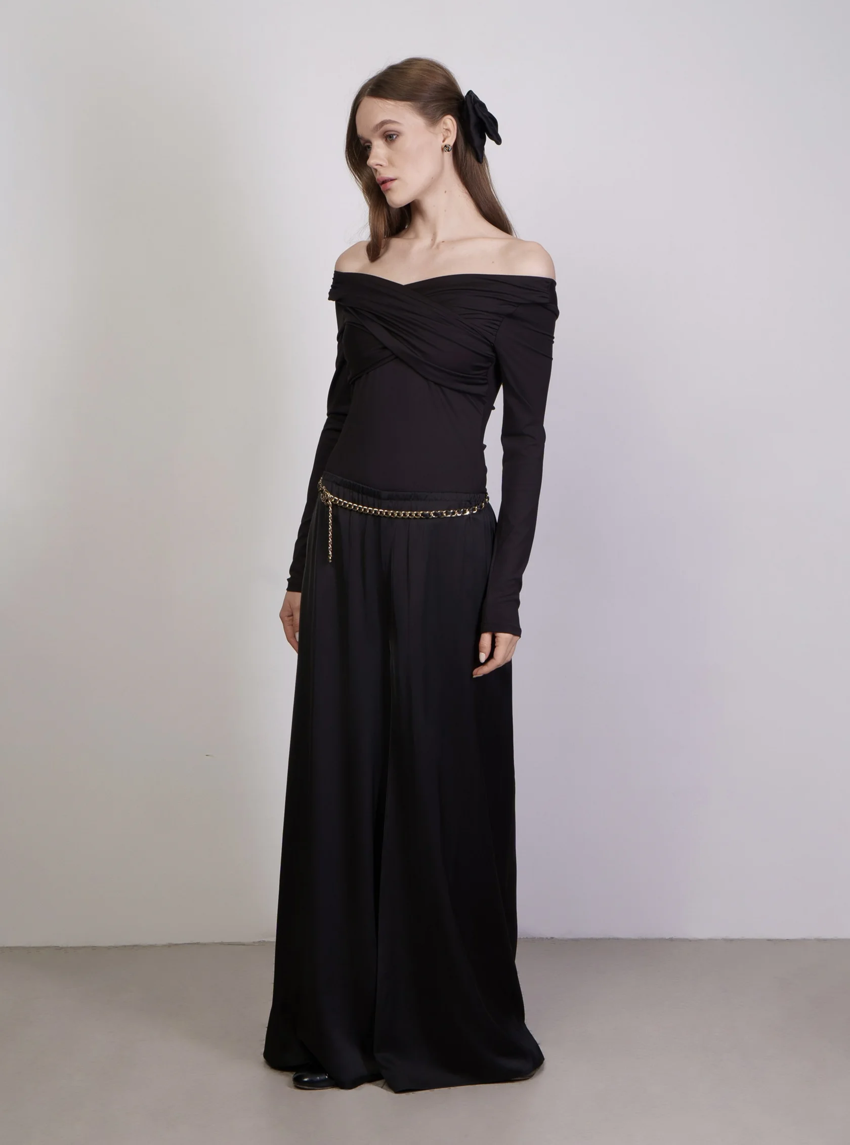 Боди с драпировкой, оголяющее плечи, ""Vivien"" вдохновлено героиней из ""Красотки"", символизируя как классическую красоту, так и внутреннюю силу. Этот элемент гардероба не только подчеркивает изящные линии фигуры, но и дает возможность каждой женщине выразить свою уникальность и уверенность.