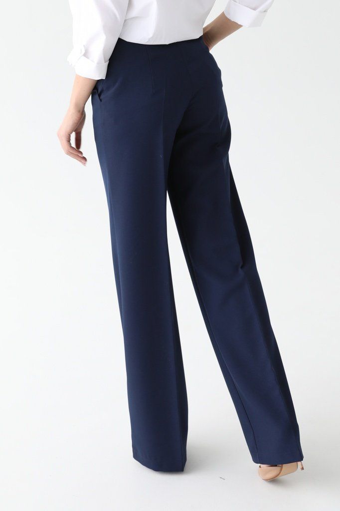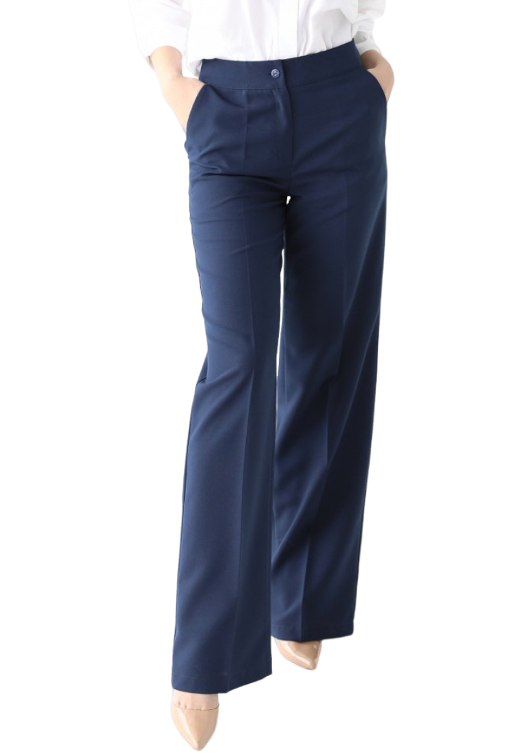 Брюки широкие прямого кроя. Боковые карманы в швах, вытачки на поясе сзади. Выполнены из плотной костюмной ткани, без подкладки.