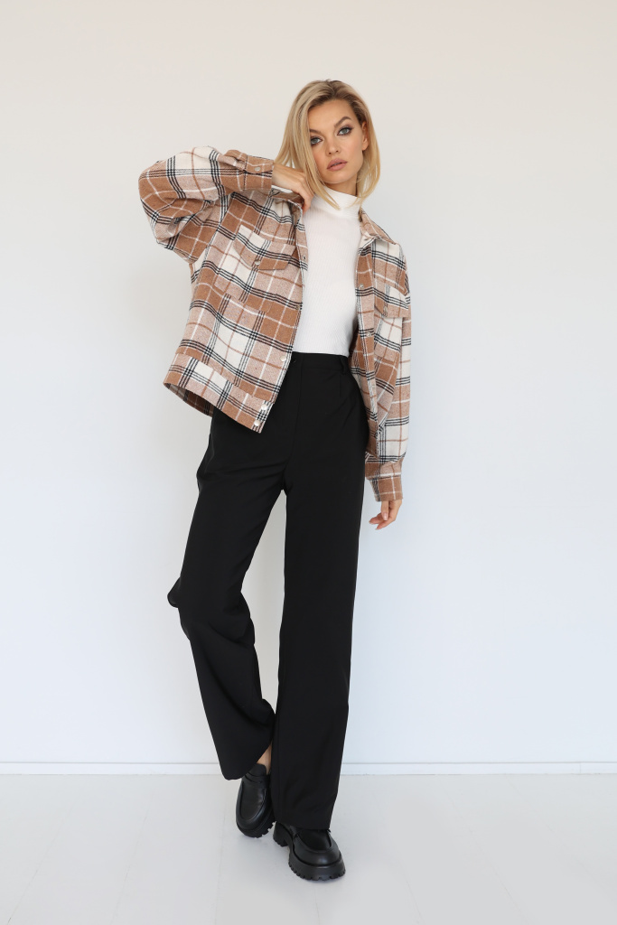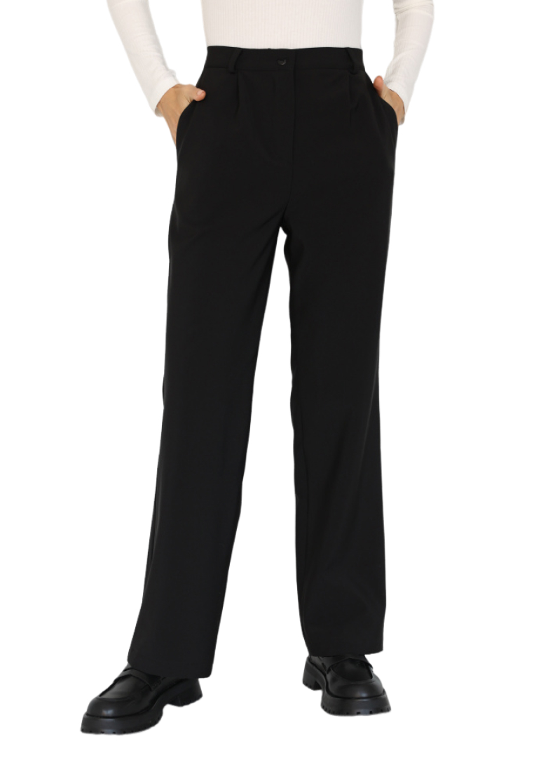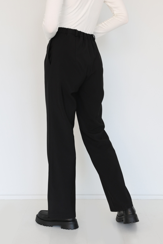Брюки прямого кроя из плотной костюмной ткани на флисе с резинкой на талии со стороны спинки.Боковые карманы, застежка на пуговицу и молнию.