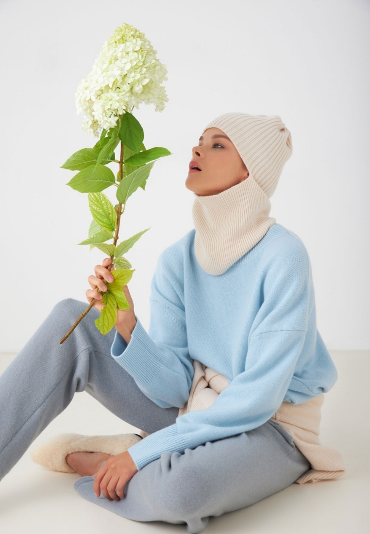 Мы вяжем из кашемира внутренней Монголии, только там из-за резких перепадов температур (жаркий день и холодные ночи) кашемировый подшерсток приобретает свойство терморегуляции. Козочками не жарко под палящим солнцем и не холодно в минусовую погоду. В наших кашемировых изделиях точно так же!