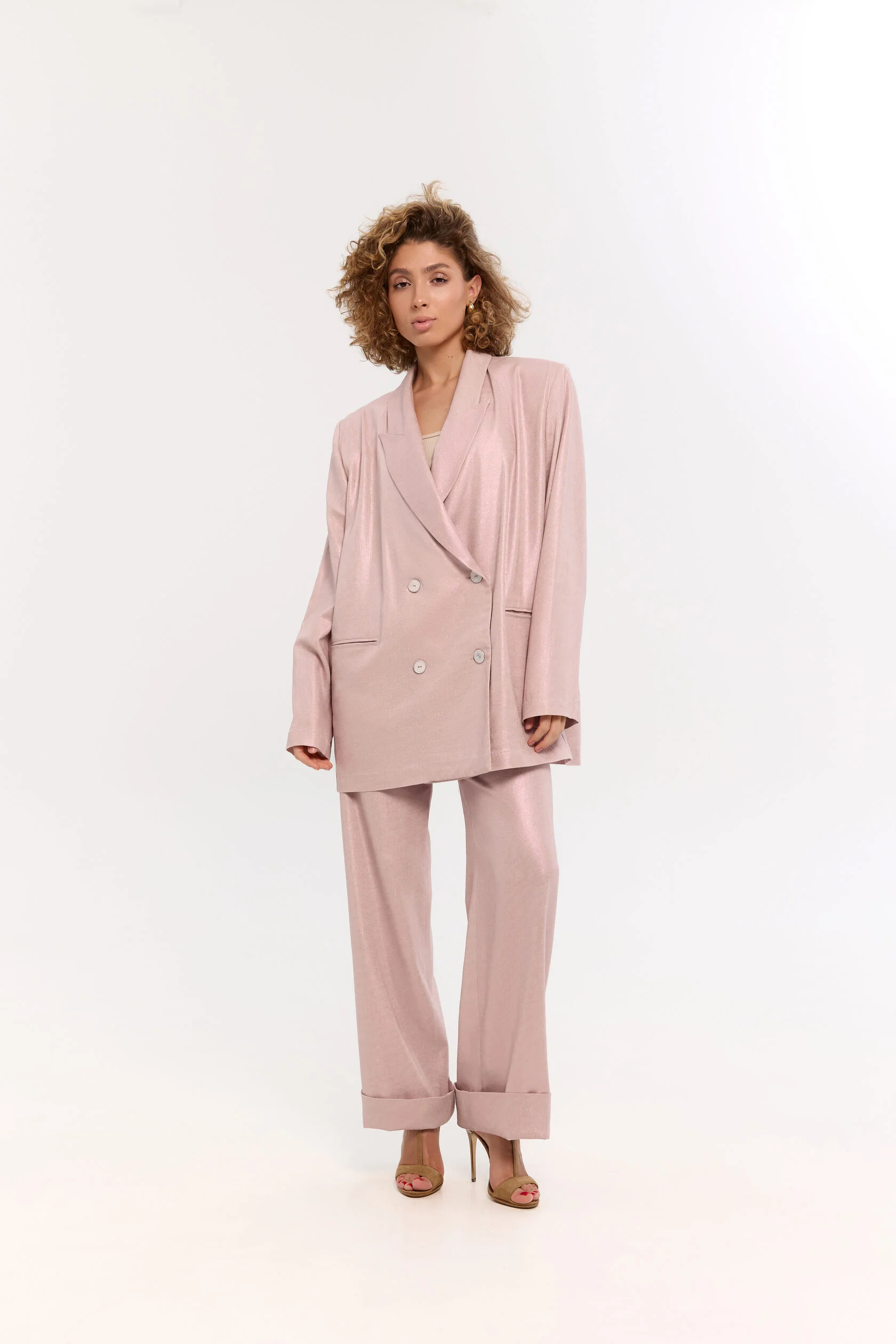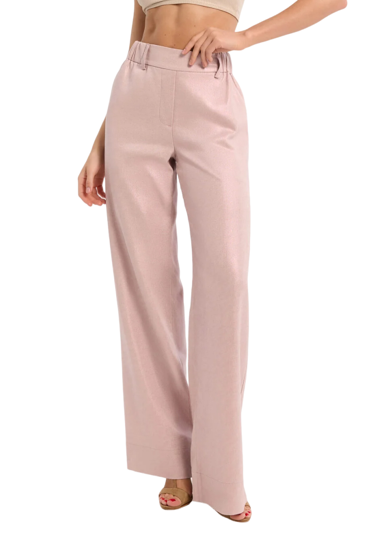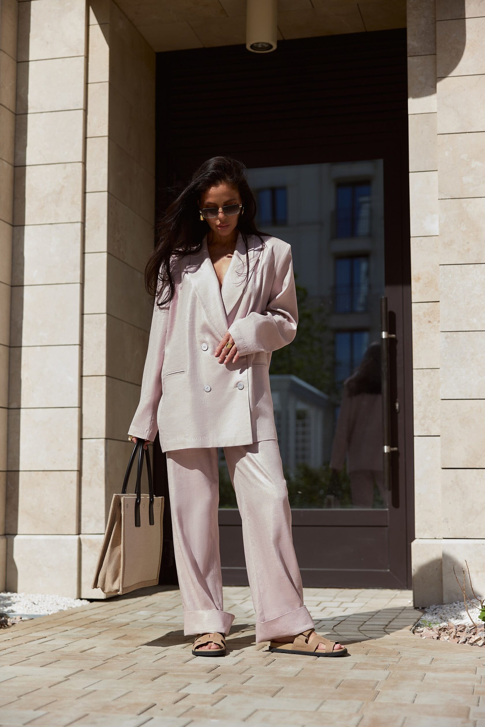 Уникальное льняное полотно с деликатным металлизированным блеском, из которого выполнен костюм, пропускает воздух и приятно охлаждает кожу.