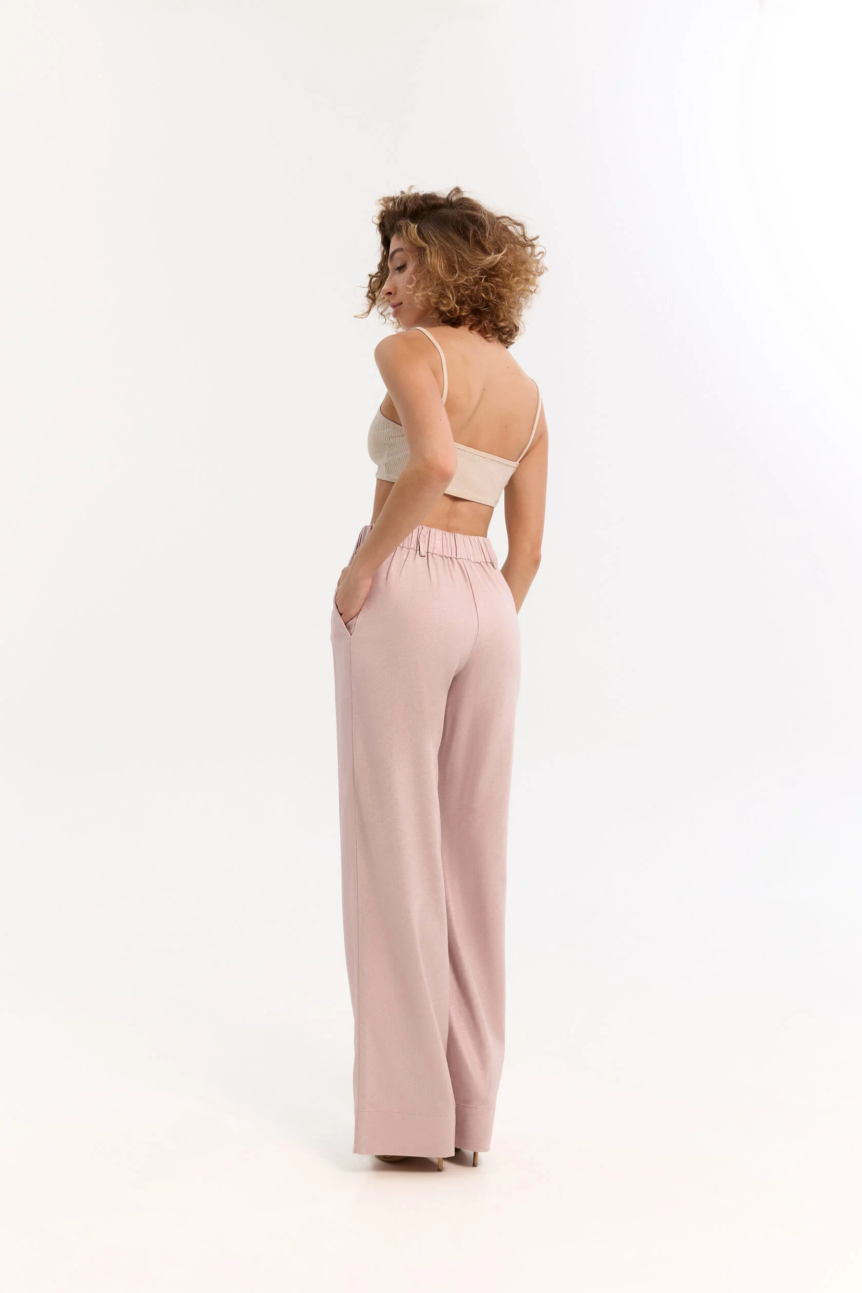 Брюки умеренного объёма на средней посадке с резинкой по линии талии – самый востребованный силуэт поясных изделий: всегда удобно и без лишнего объёма в образе.