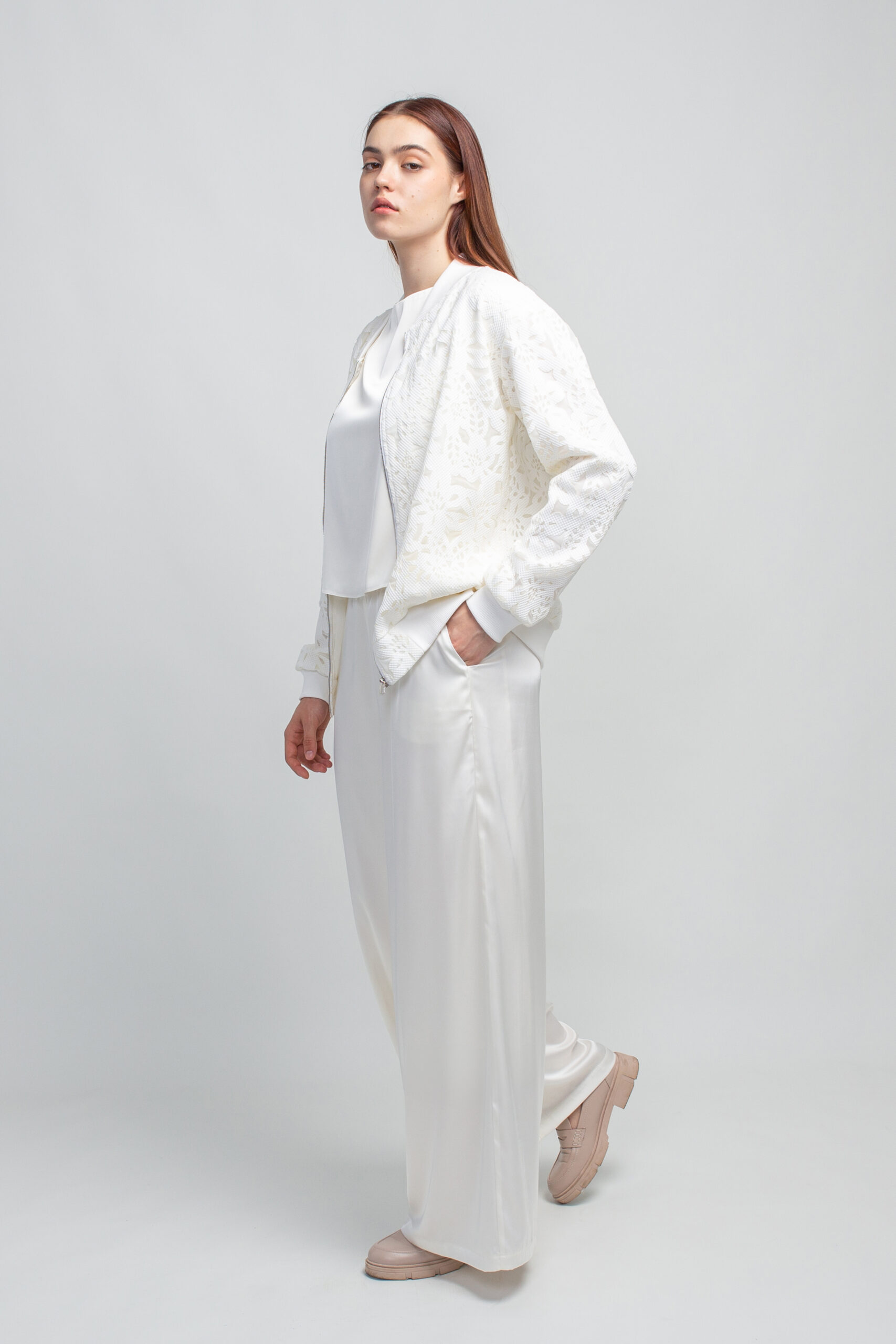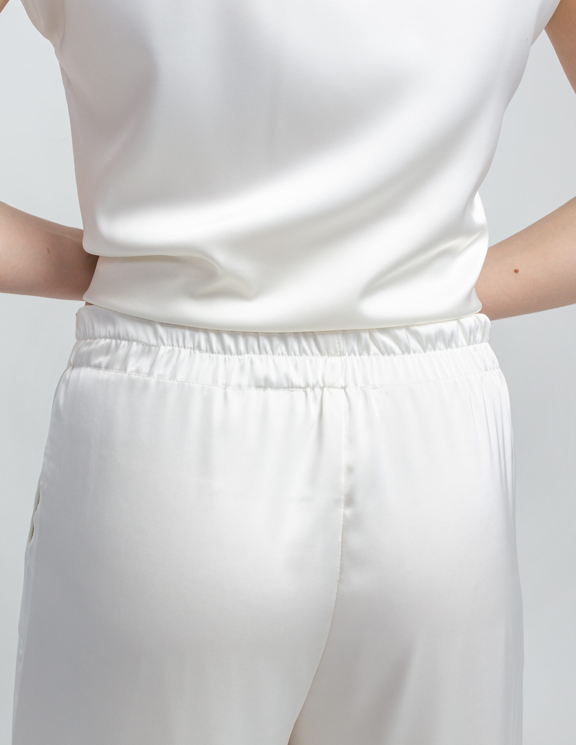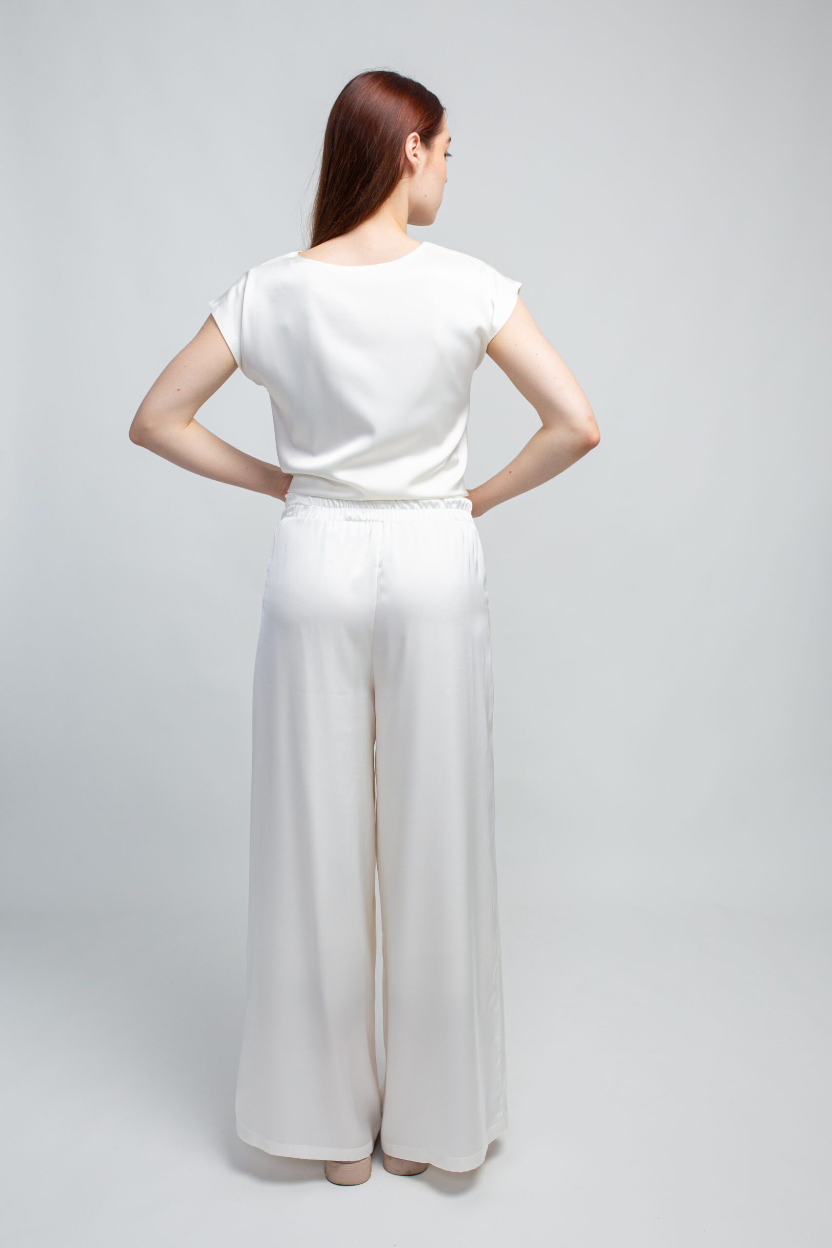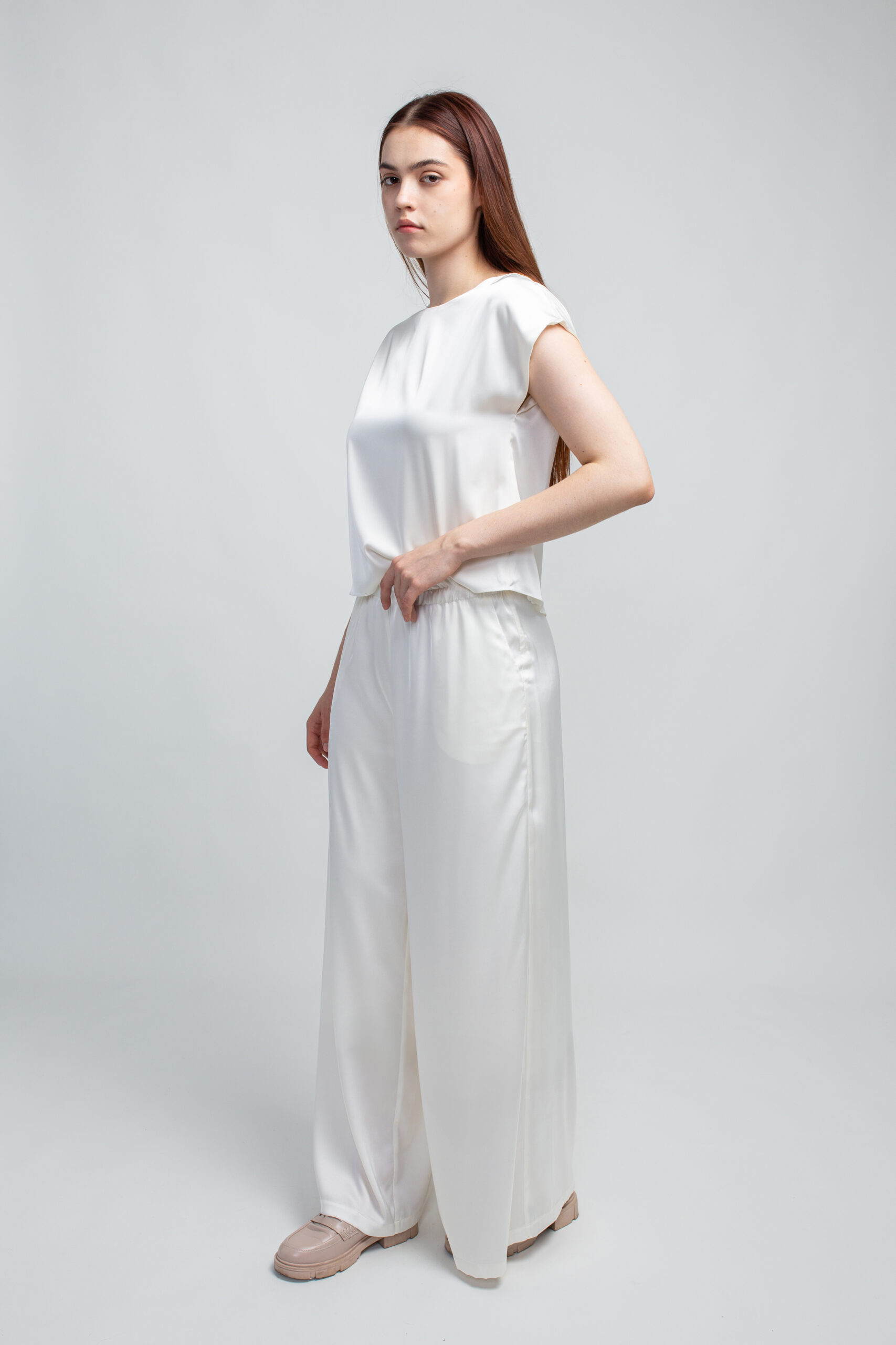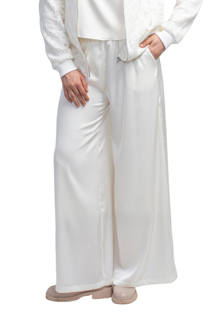 Брюки-клеш из атласа — это свободные брюки палаццо длины макси, выполненные из приятной на ощупь ткани, которая красиво драпируется и струится мягкими складками. Широкий пояс на резинке подчеркивает талию и обеспечивает максимальный комфорт, не стесняя движений. Для удобства предусмотрены боковые карманы, идеально подходящие для хранения необходимых мелочей. Эти брюки создадут элегантный и утонченный образ, подходящий для различных случаев.