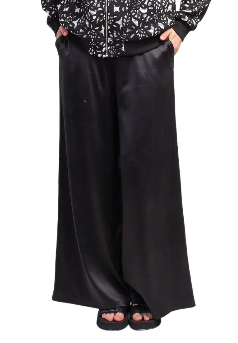 Брюки-клеш из атласа — это свободные брюки палаццо длины макси, выполненные из приятной на ощупь ткани, которая красиво драпируется и струится мягкими складками. Широкий пояс на резинке подчеркивает талию и обеспечивает максимальный комфорт, не стесняя движений. Для удобства предусмотрены боковые карманы, идеально подходящие для хранения необходимых мелочей. Эти брюки создадут элегантный и утонченный образ, подходящий для различных случаев.