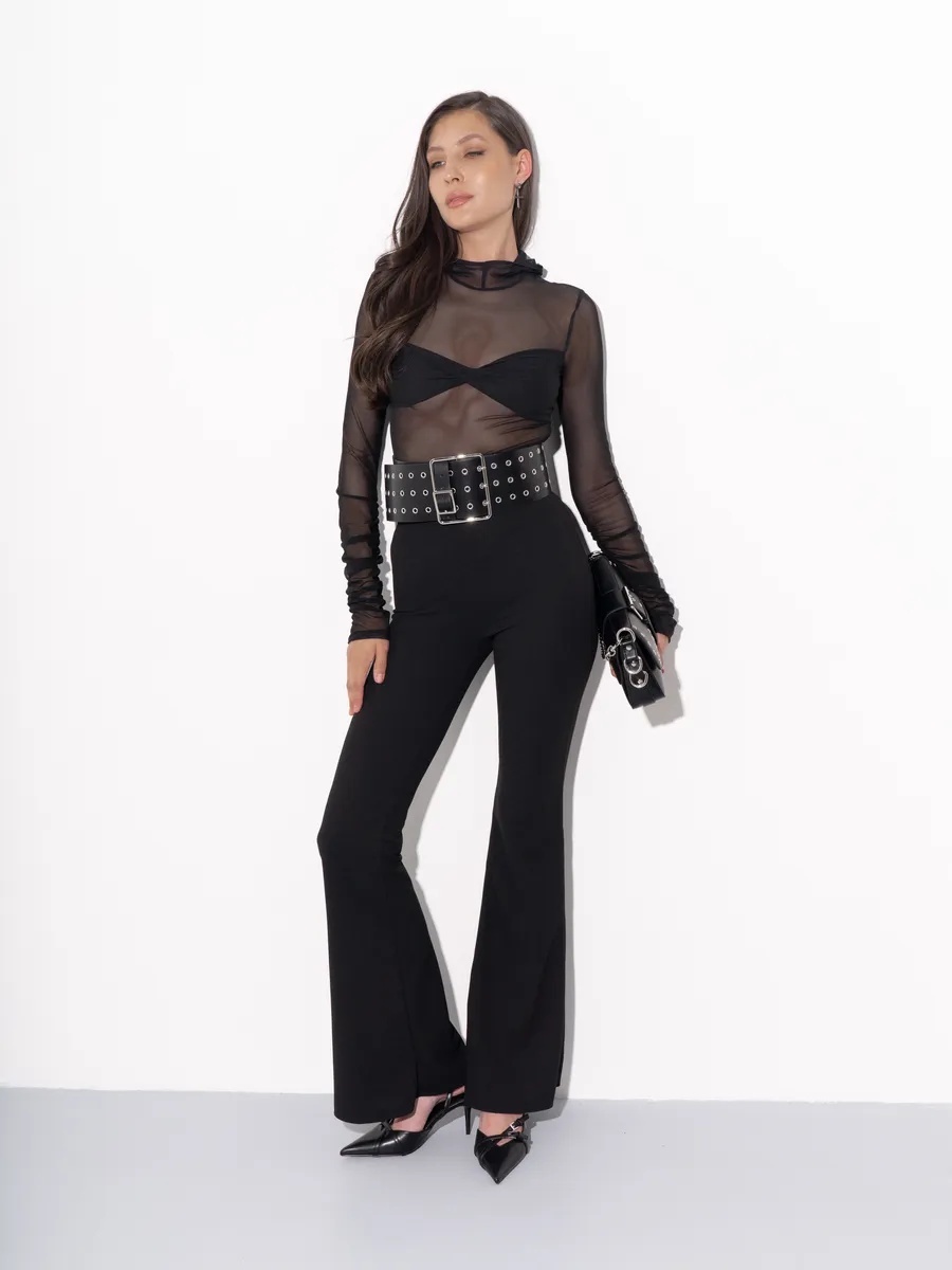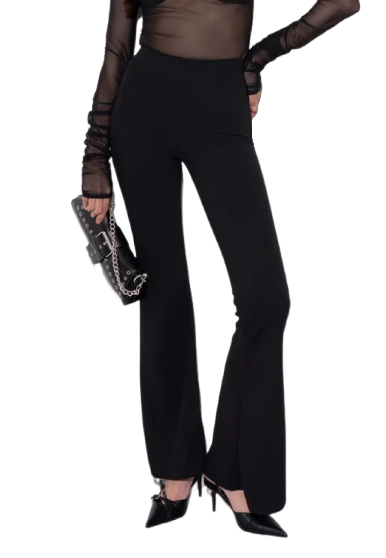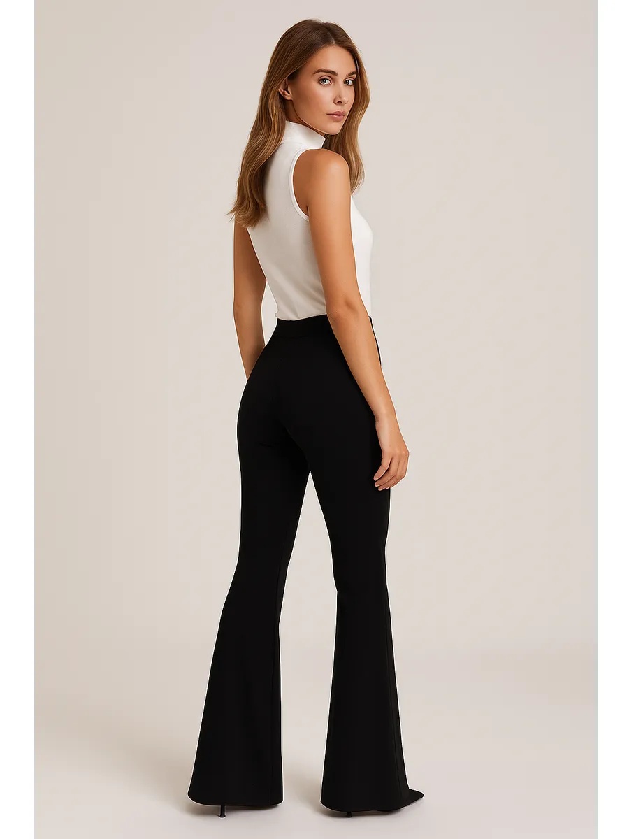 Женские классические брюки клеш – это стильный элемент гардероба, который подходит для любого случая. Эти черные штаны, выполненные из высококачественного трикотажа, обеспечивают комфорт и элегантность. Модель с завышенной талией и обтягивающим кроем прекрасно подчеркивает фигуру, выделяя бедра и создавая красивый силуэт. Высокая посадка и утягивающий эффект добавляют уверенности при носке, а расклешенные от колена брючины делают образ более женственным и утонченным.