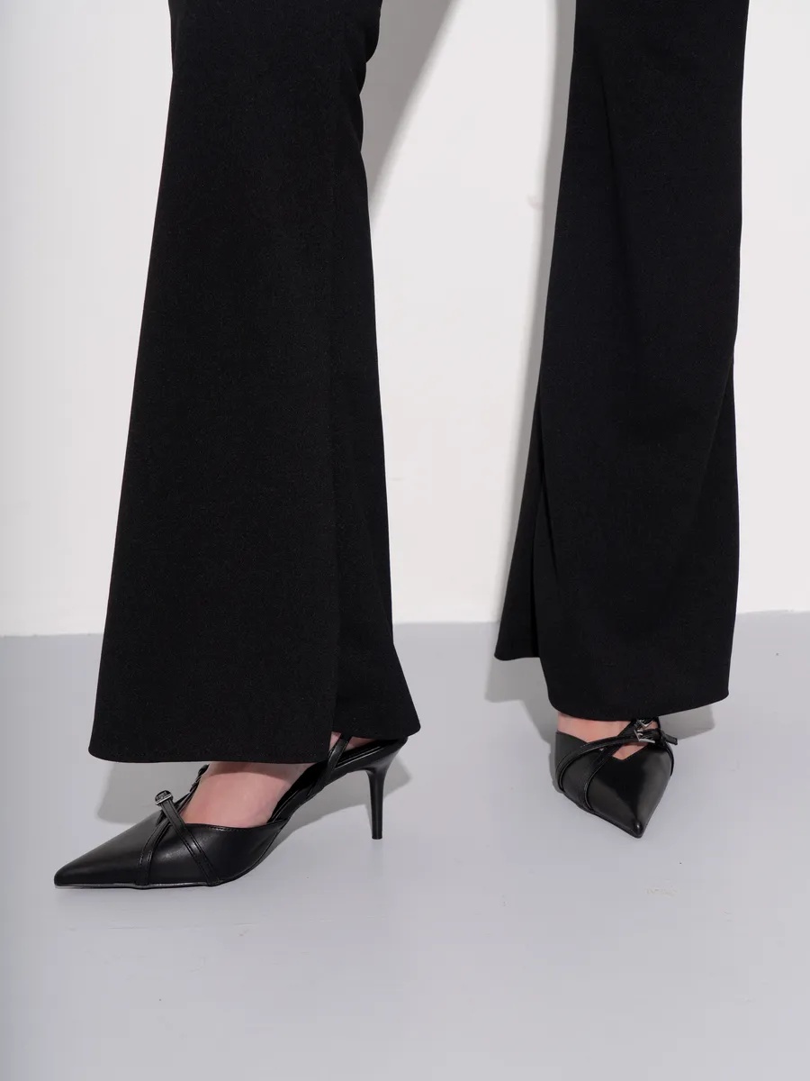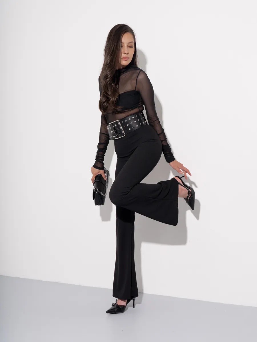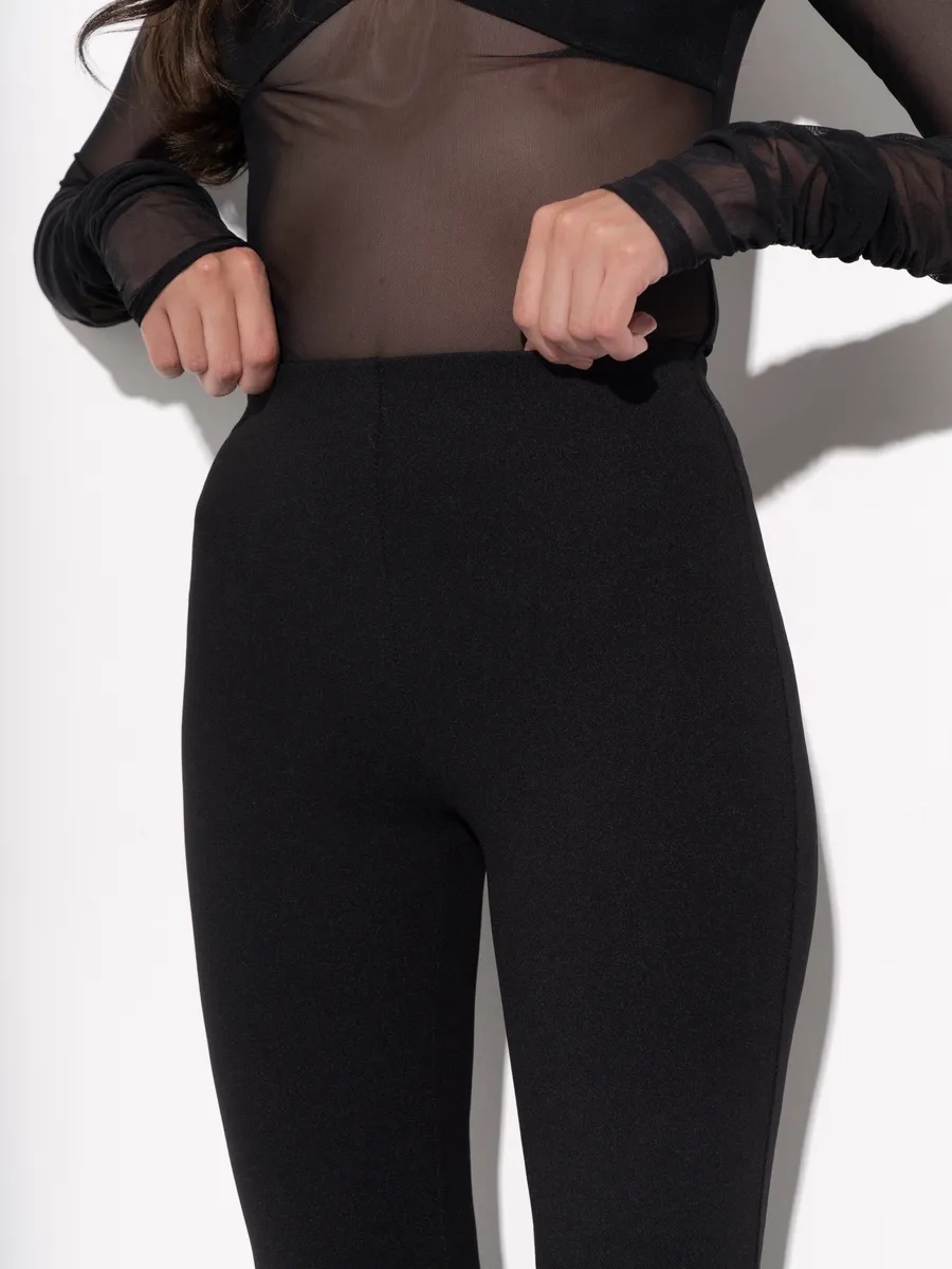 Женские классические брюки клеш – это стильный элемент гардероба, который подходит для любого случая. Эти черные штаны, выполненные из высококачественного трикотажа, обеспечивают комфорт и элегантность. Модель с завышенной талией и обтягивающим кроем прекрасно подчеркивает фигуру, выделяя бедра и создавая красивый силуэт. Высокая посадка и утягивающий эффект добавляют уверенности при носке, а расклешенные от колена брючины делают образ более женственным и утонченным.