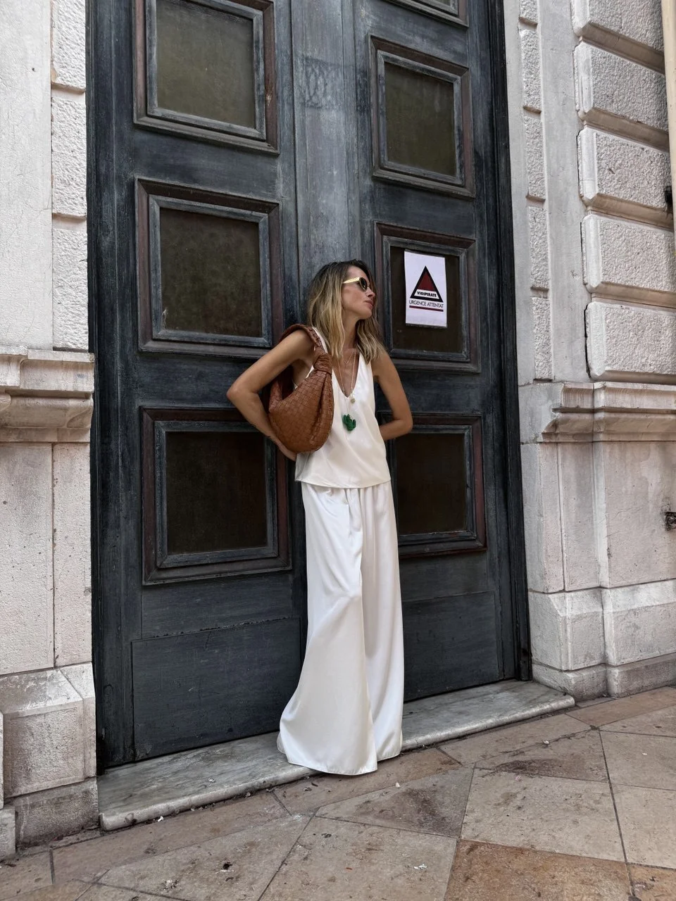 Широкие брюки из нежной струящейся ткани. Создадут идеальный летний образ для прогулок вдоль берега моря, в комбинации с топом LE CRÈME BRÛLÉE.